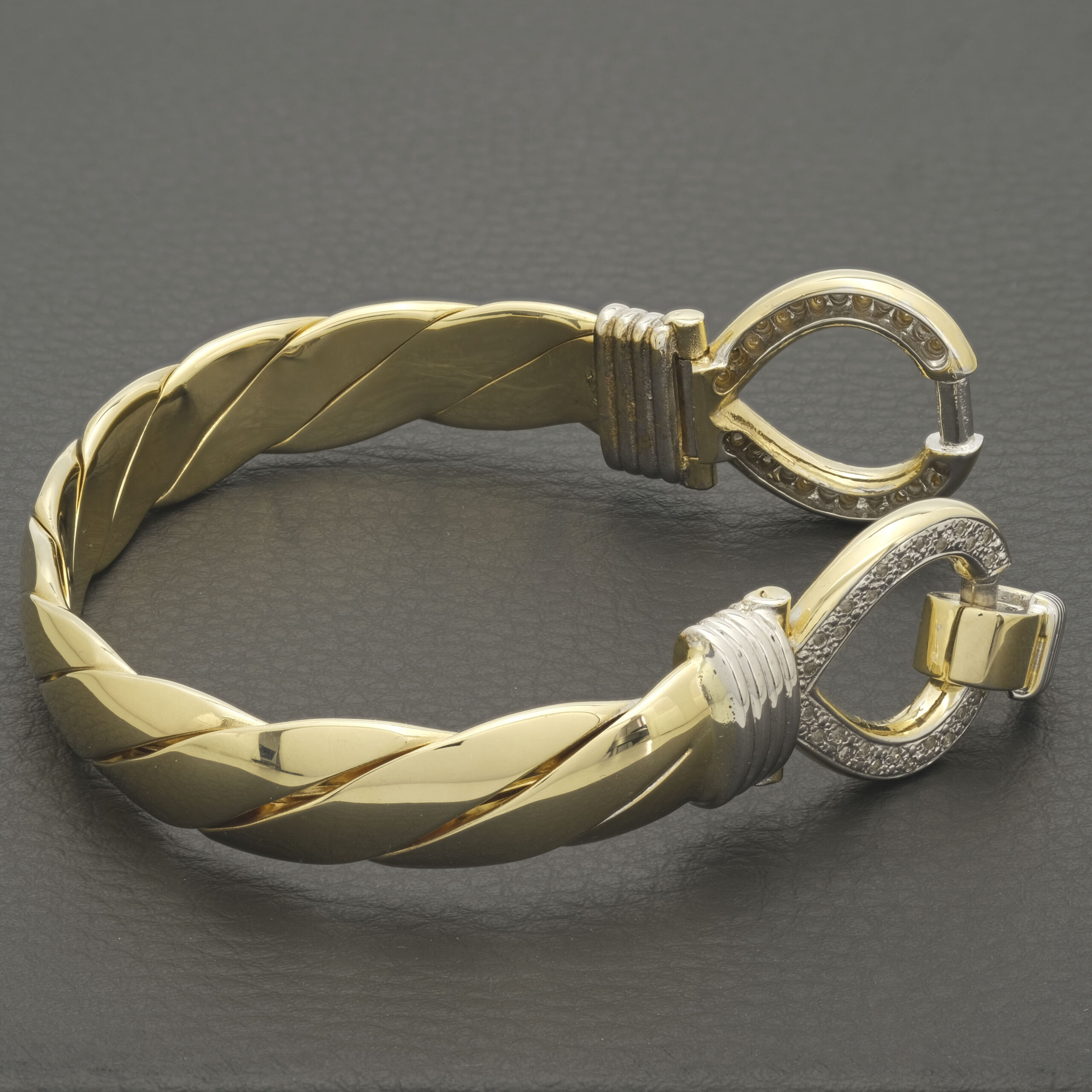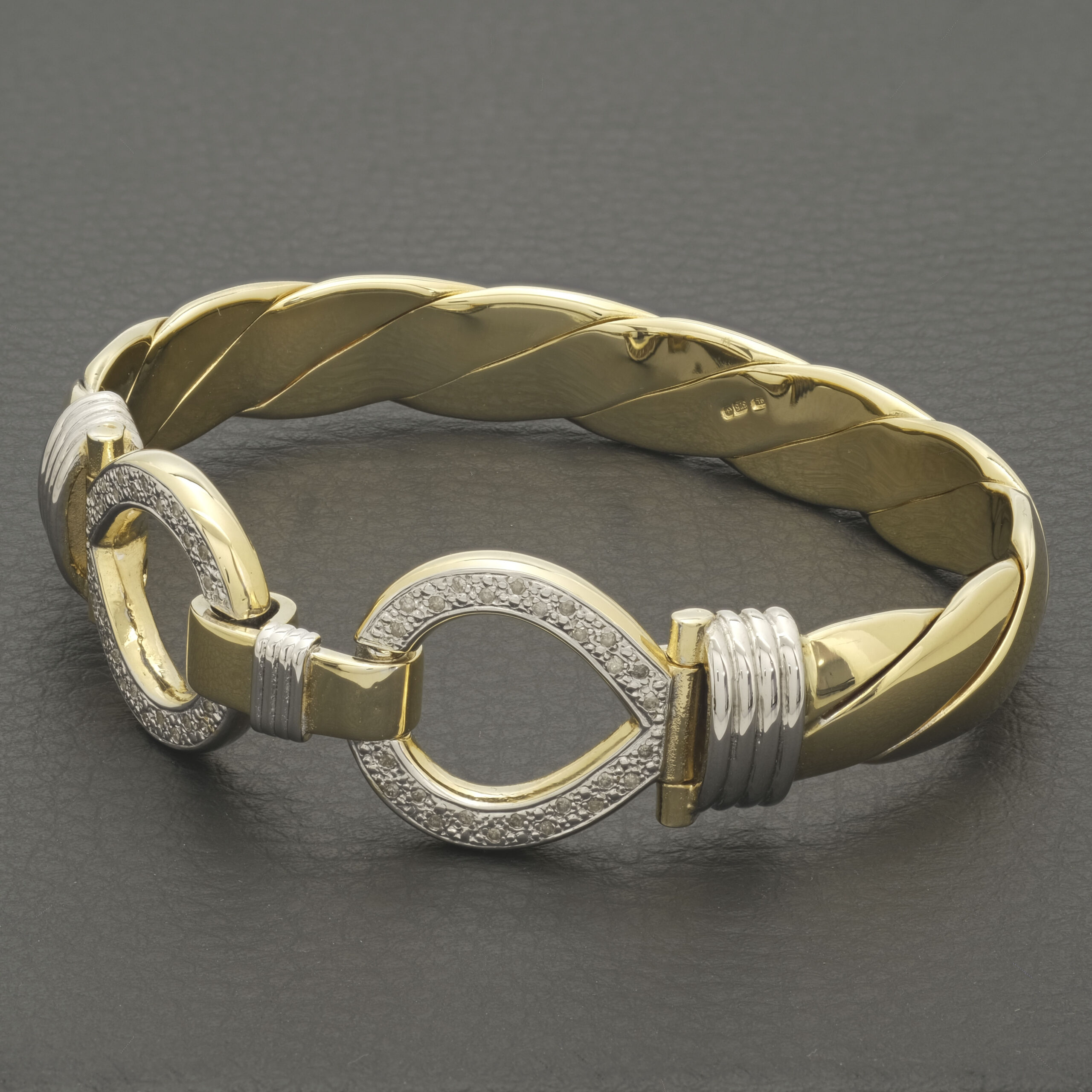 A beautiful solid pre-owned 9ct yellow 0.40ct diamond gold double loop bangle measuring 69.5mm in width and an 11mm thickness. This bangle has a weight of 89.4g. Perfect for occasional or everyday wear.