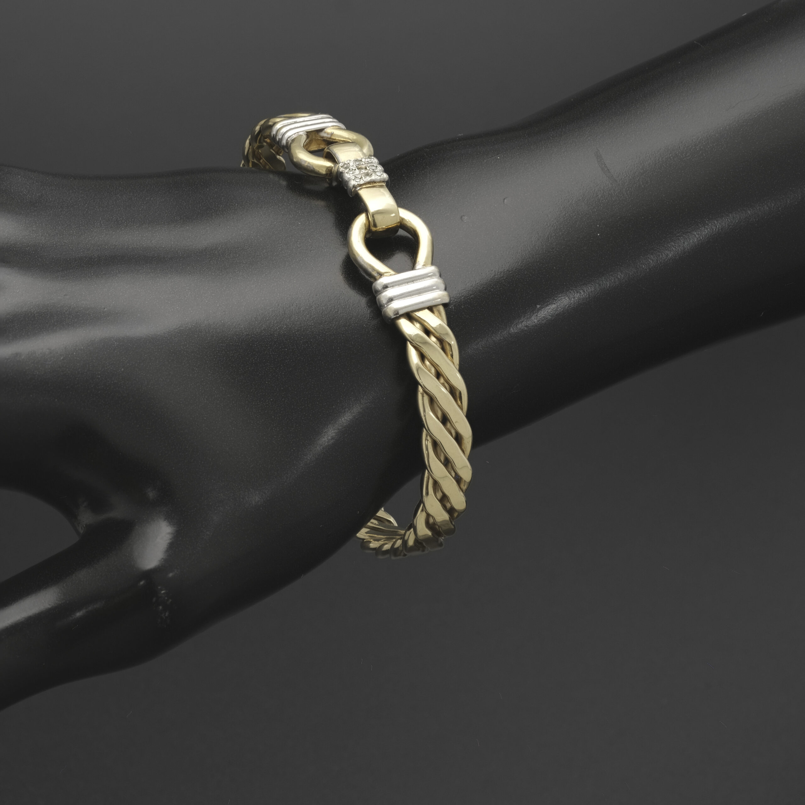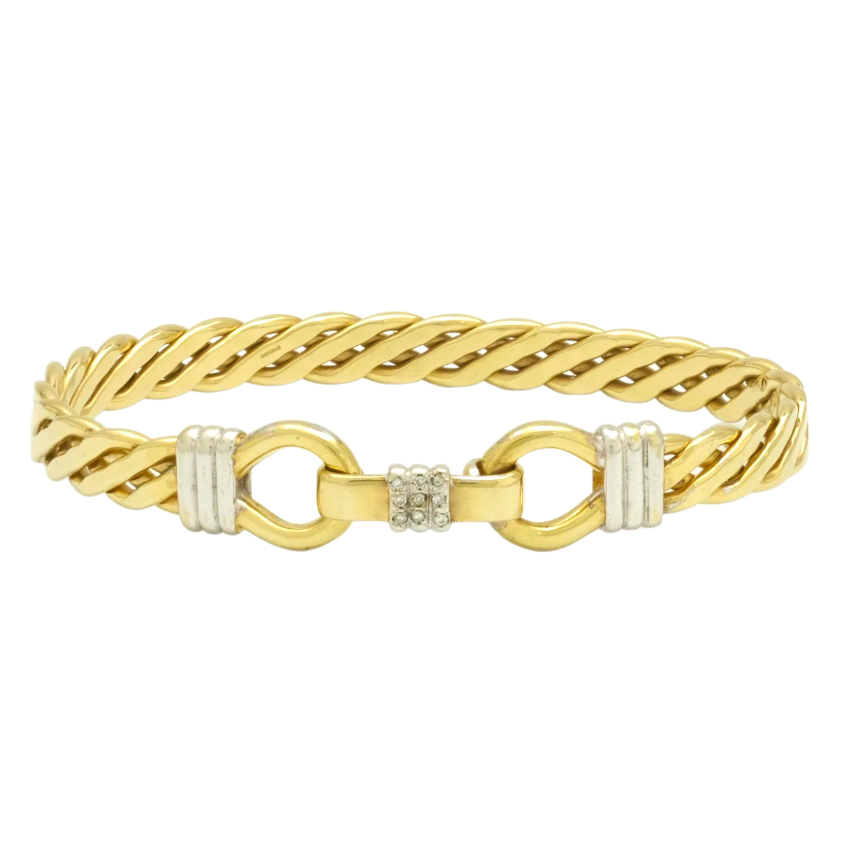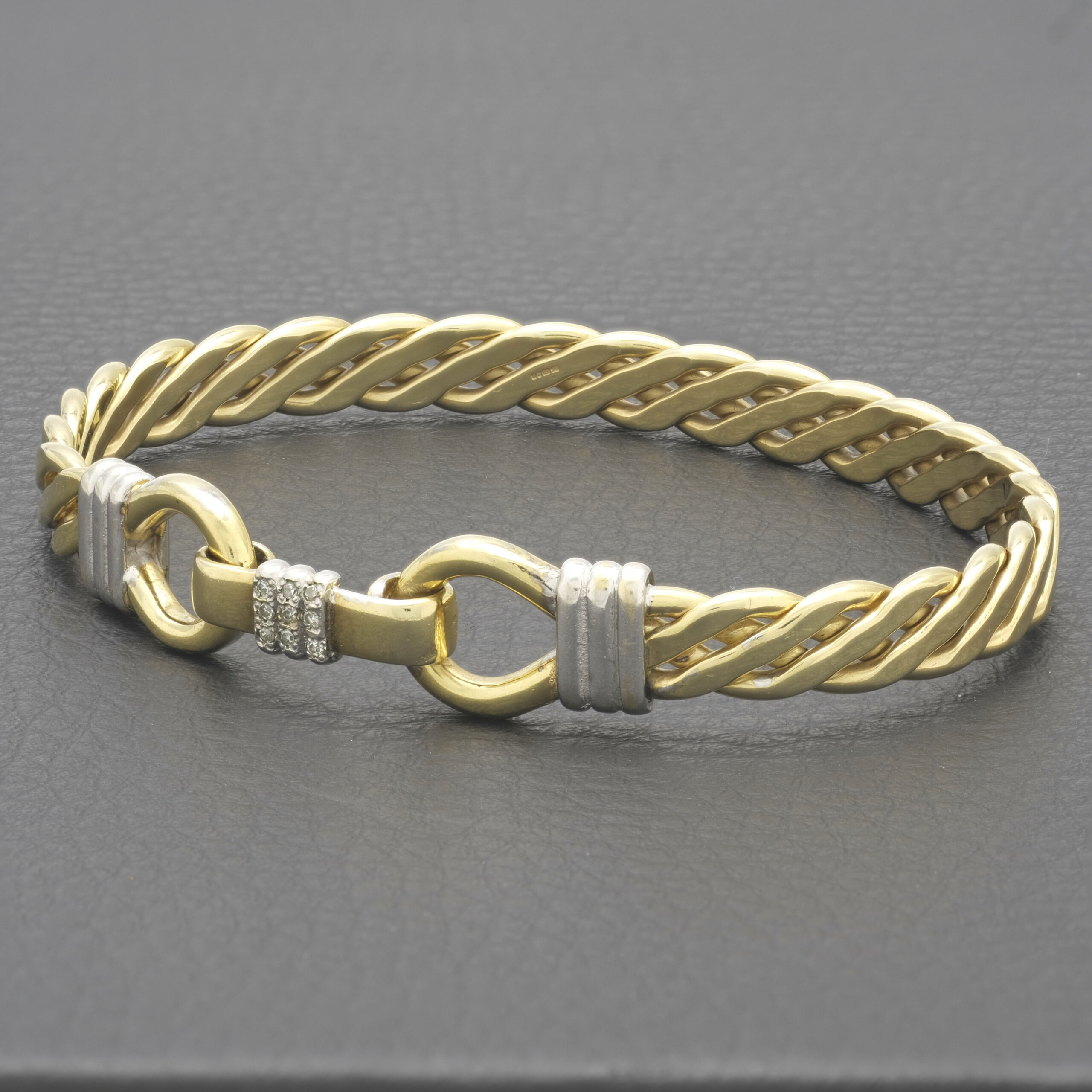 A beautiful solid pre-owned 9ct yellow gold diamond double loop bangle measuring 62mm in width and an 6.5mm thickness. This bangle has a weight of 29.7g. Perfect for occasional or everyday wear.
