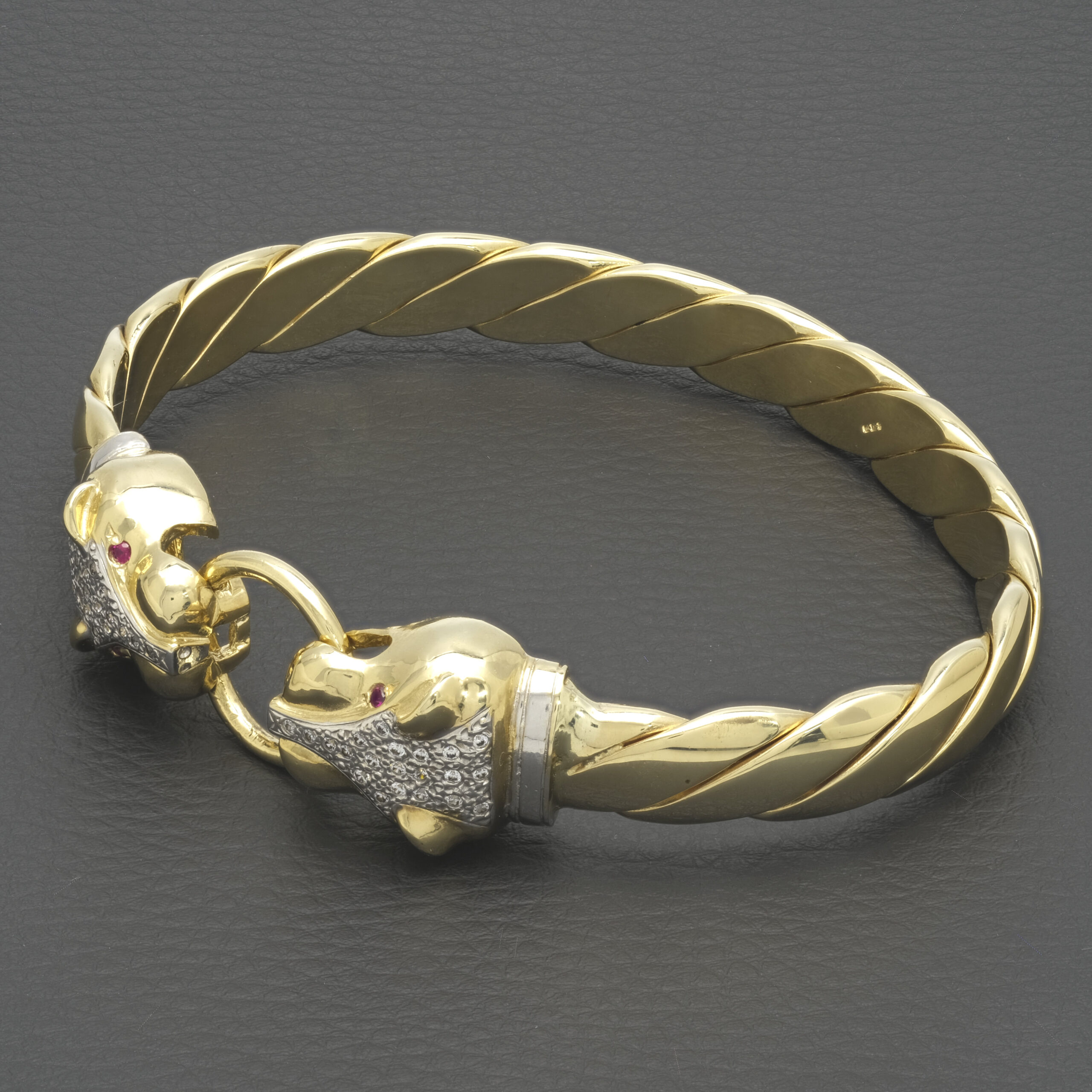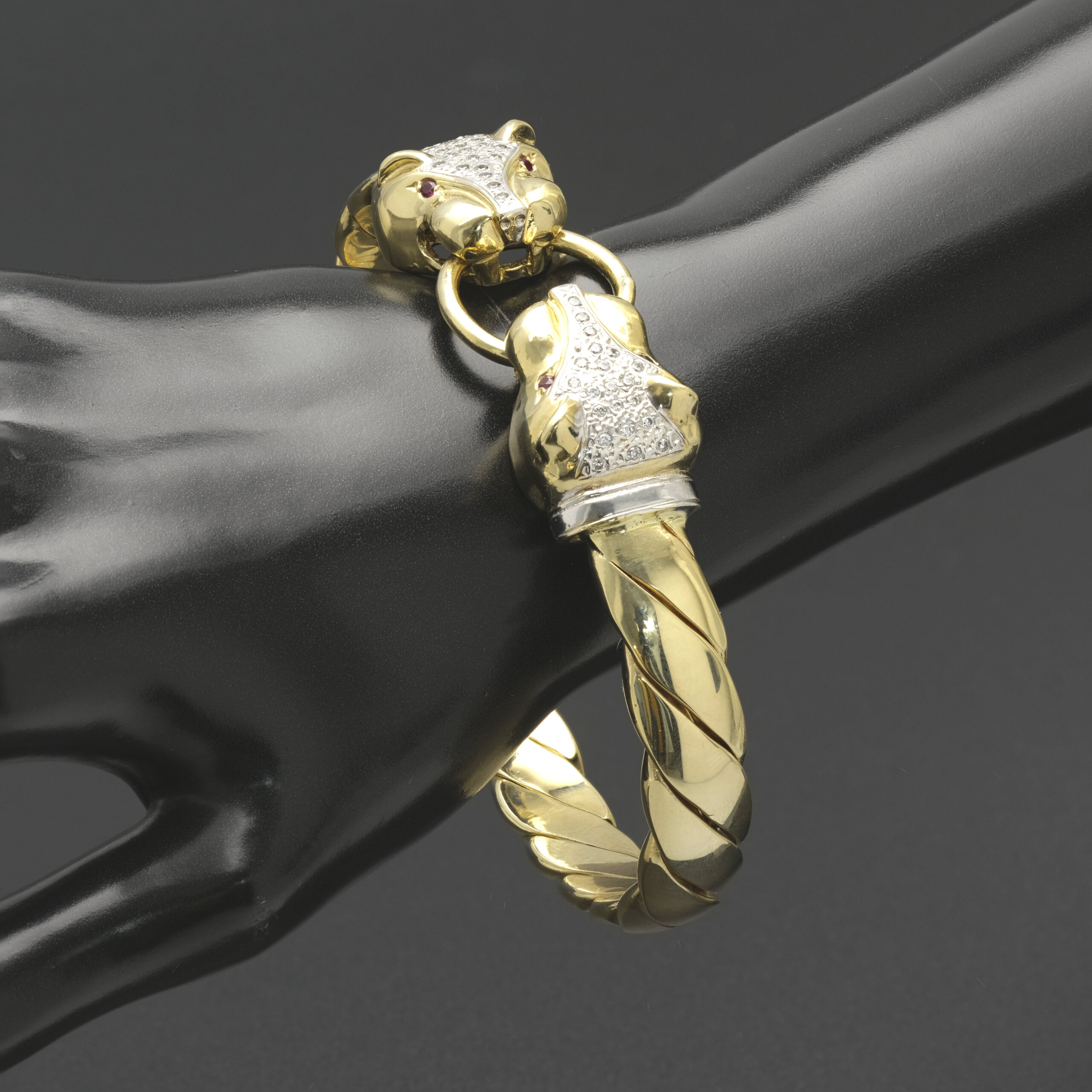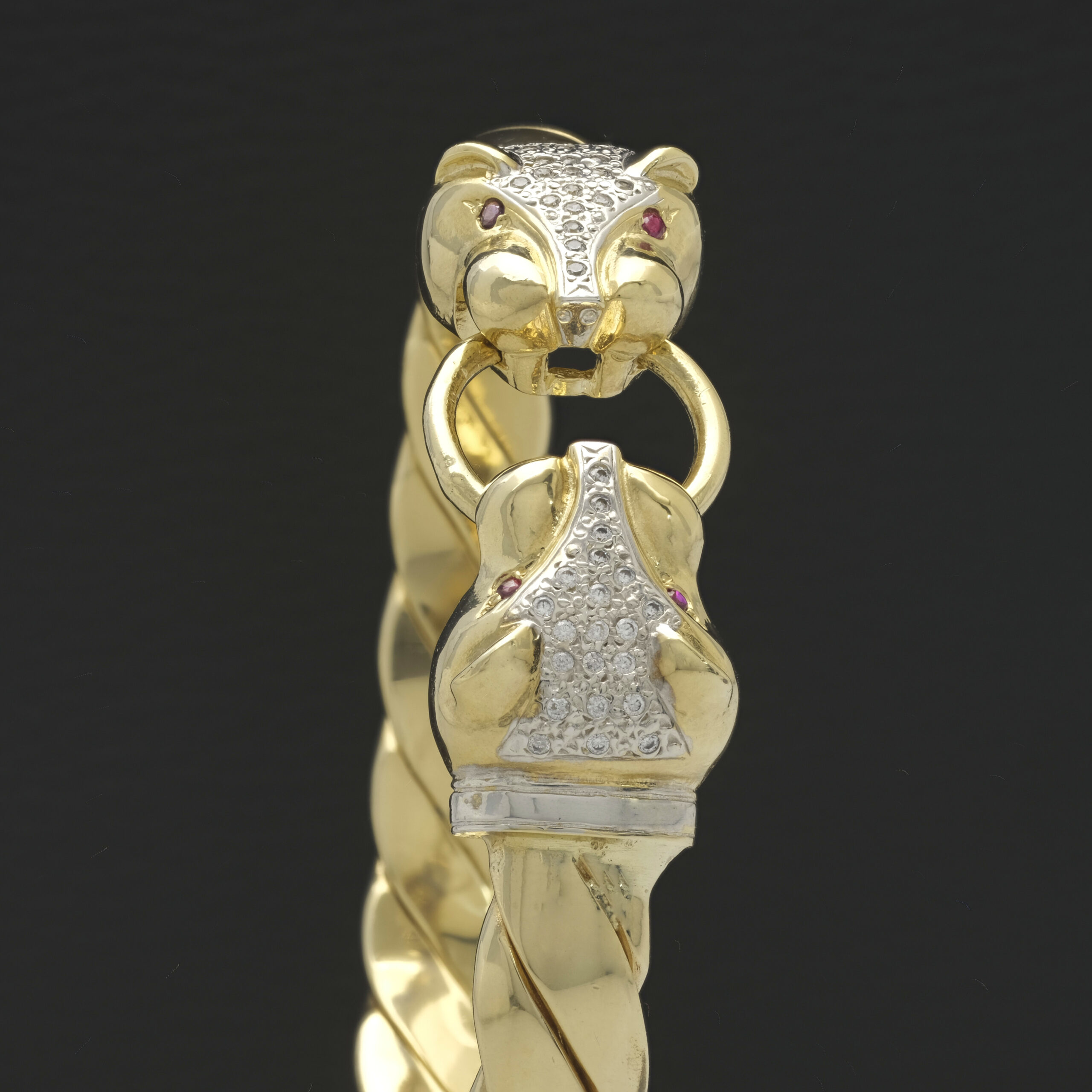 A beautiful, solid gold pre-owned 9ct yellow gold ruby and gemstone panther bangle. This bangle measures 11mm in width and 34.5mm inside diameter. This design is sure to catch the eye