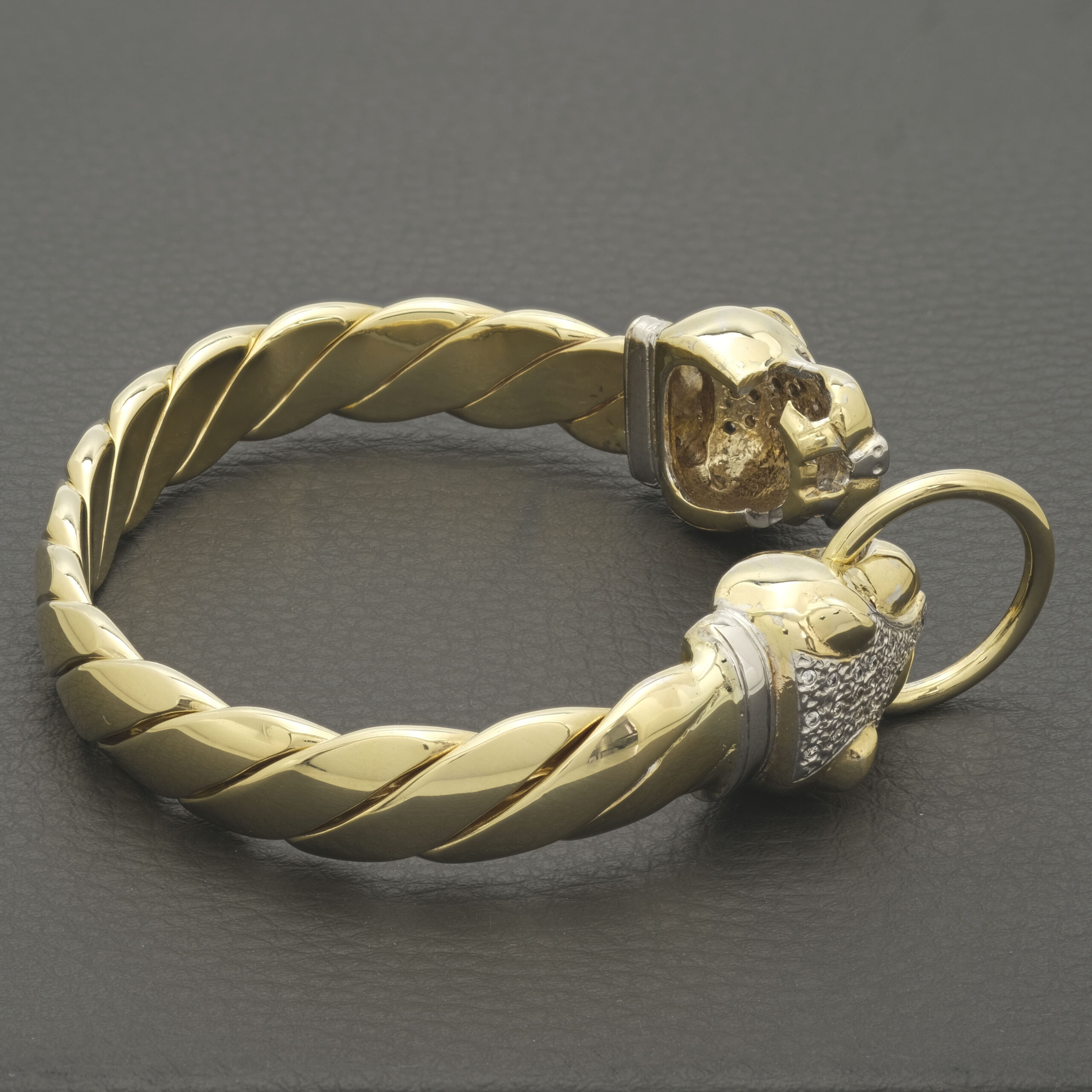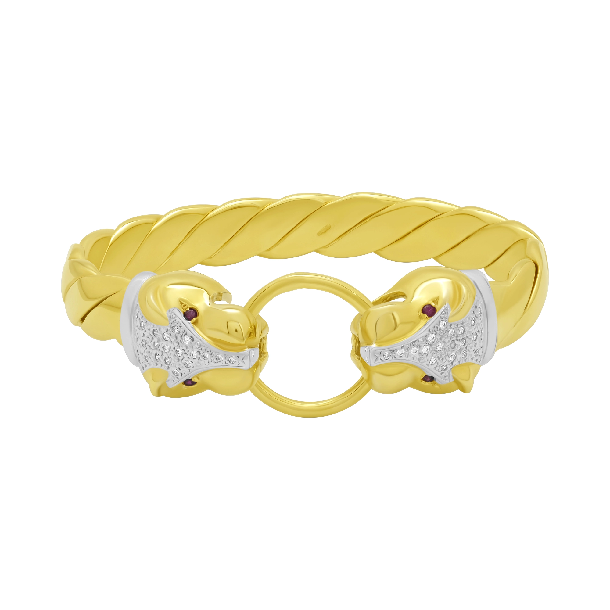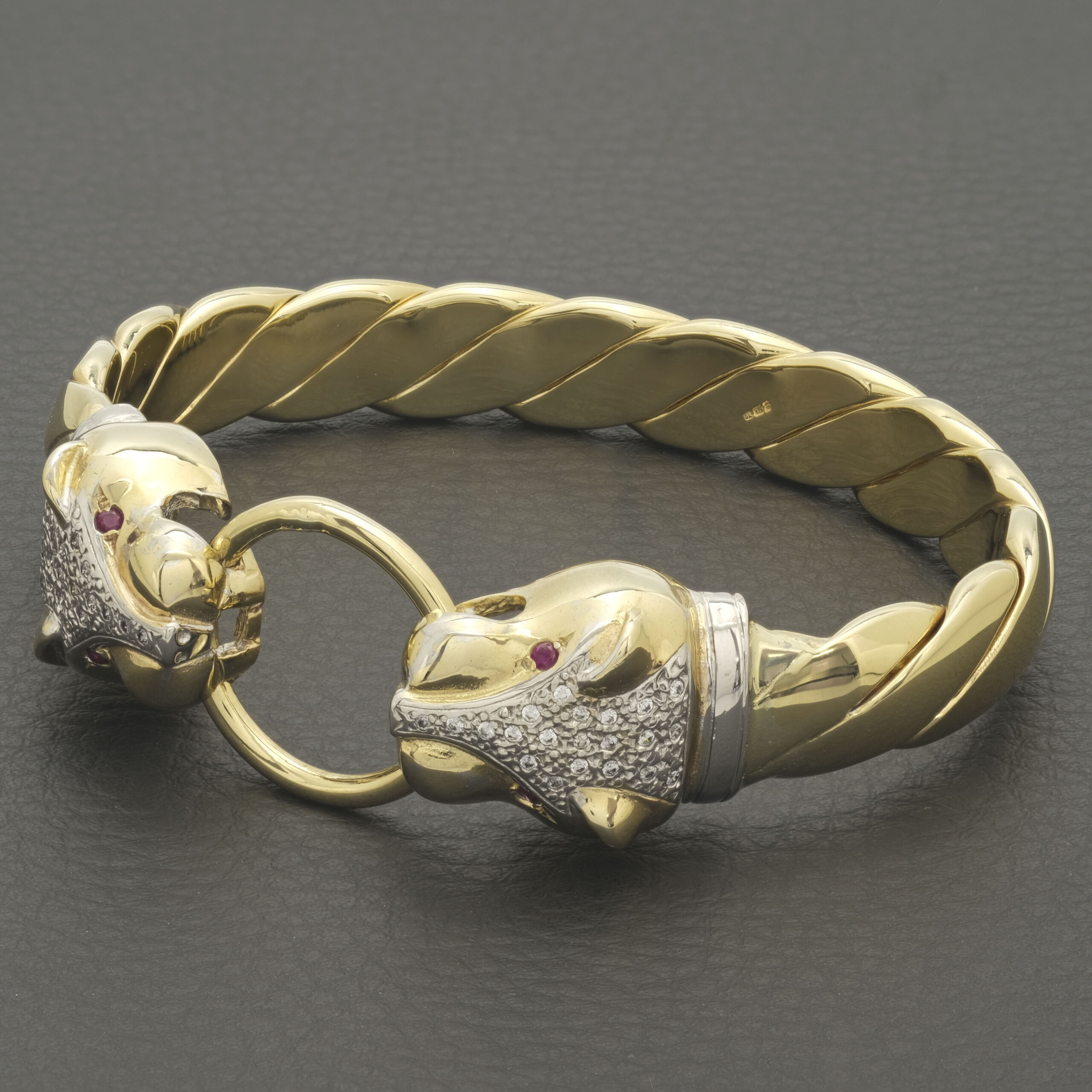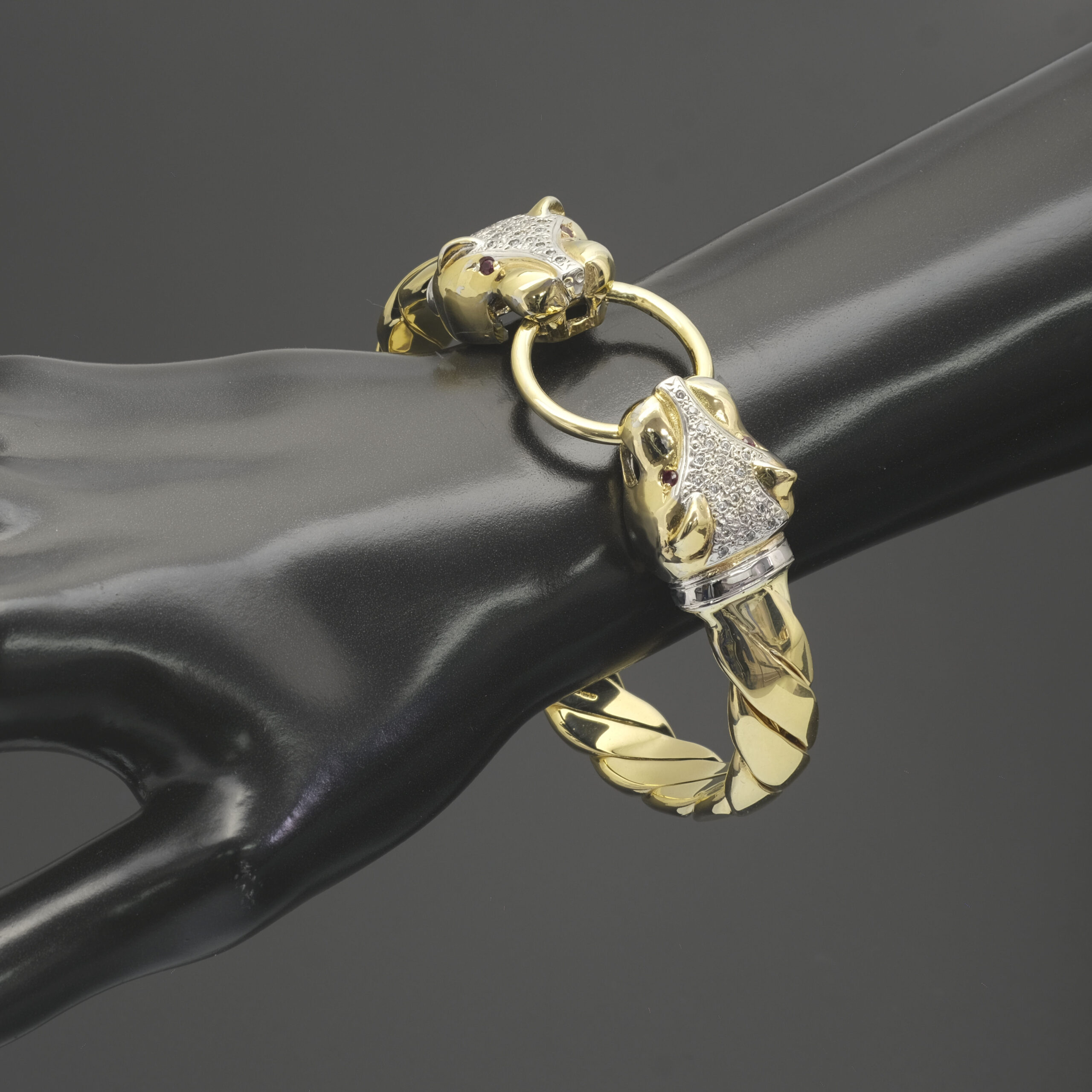 A beautiful solid pre-owned 9ct Yellow Gold Ruby & Gemstone Panther loop bangle measuring 70mm in width and an 11.5mm thickness. This bangle has a weight of 106.3g. Perfect for occasional or everyday wear.