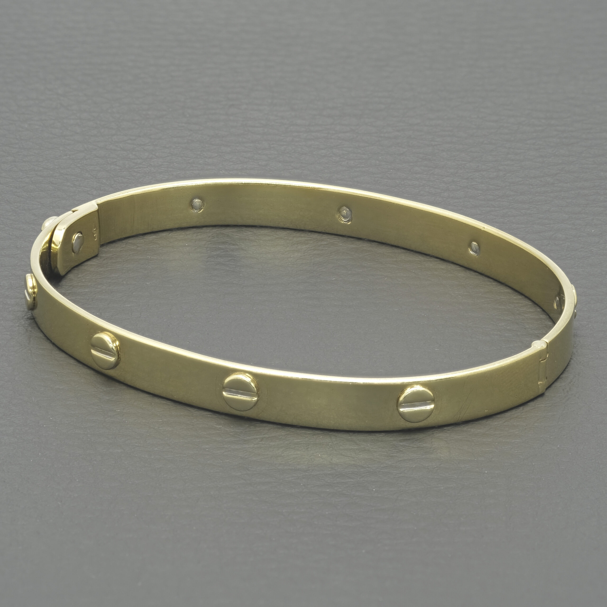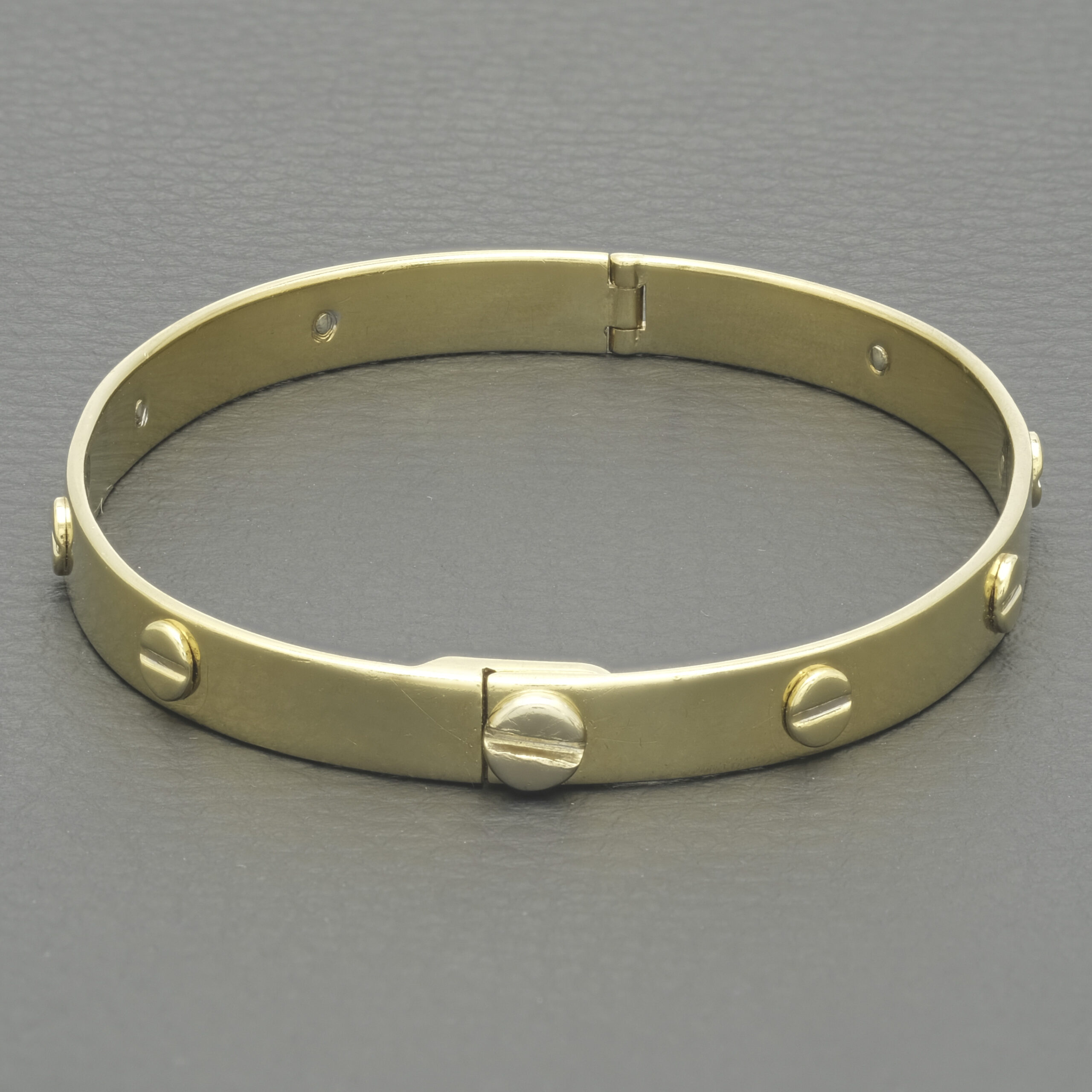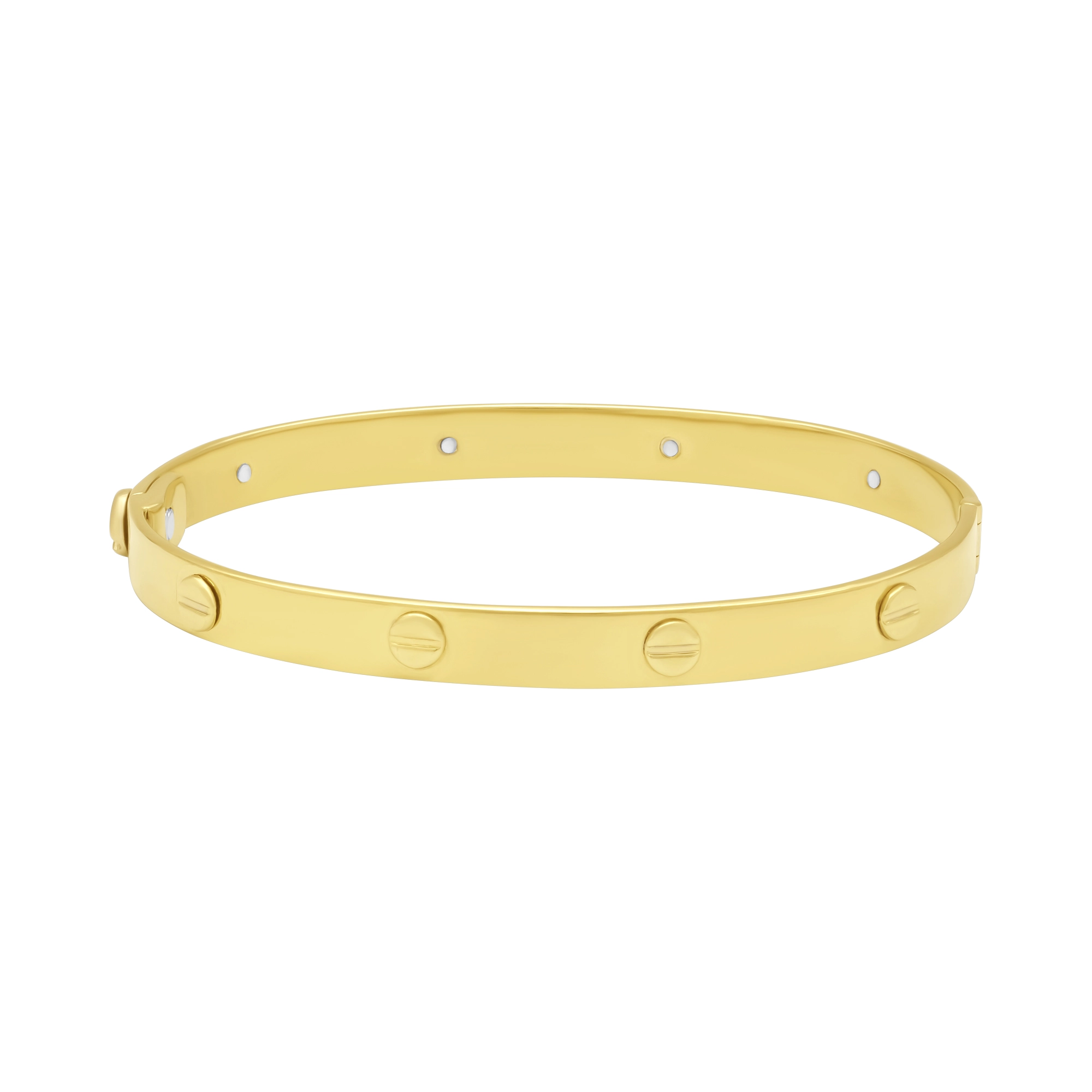 A pre-owned, 9ct yellow gold screw bangle that will stand the test of time. This bangle measures an internal width of 47mm and 6.5mm wide with a weight of 21.2g with a screw like patterns. This bracelet fastens with a screw clasp. A bracelet that will look great for any occasion.