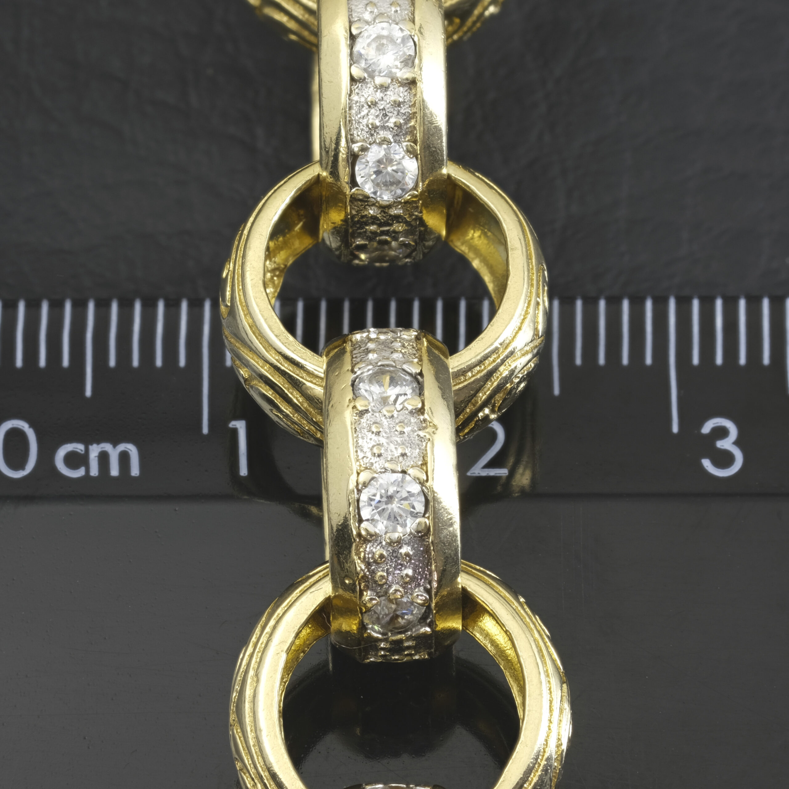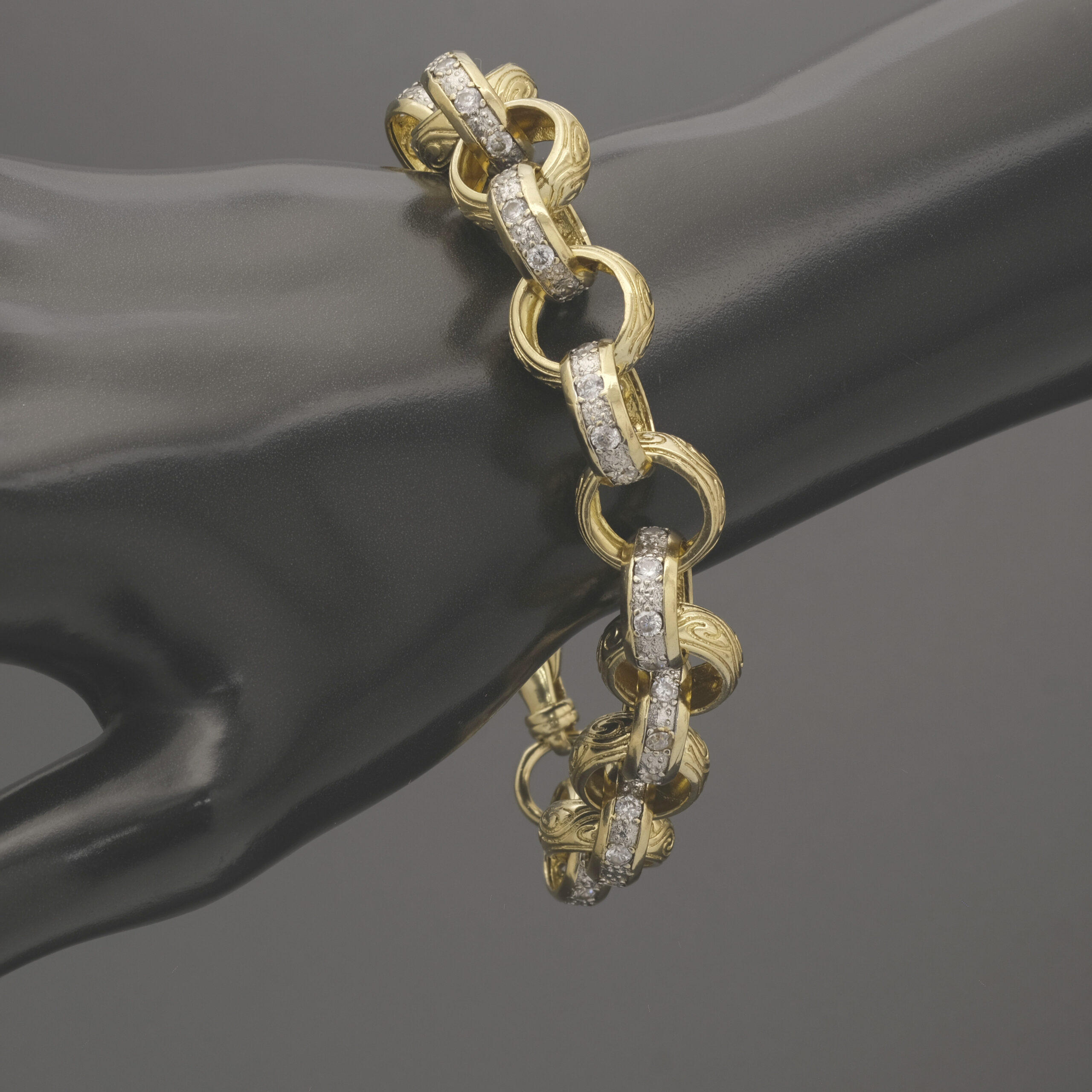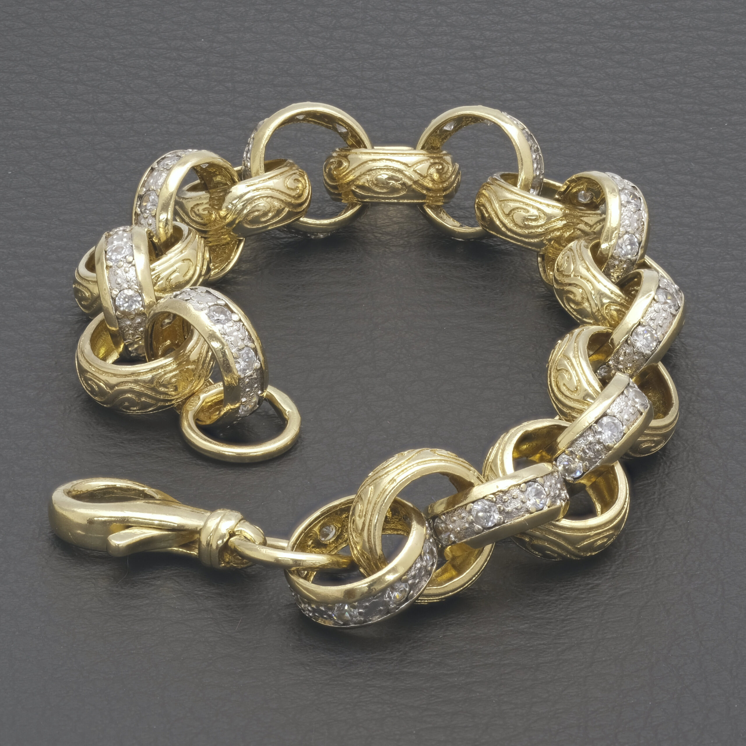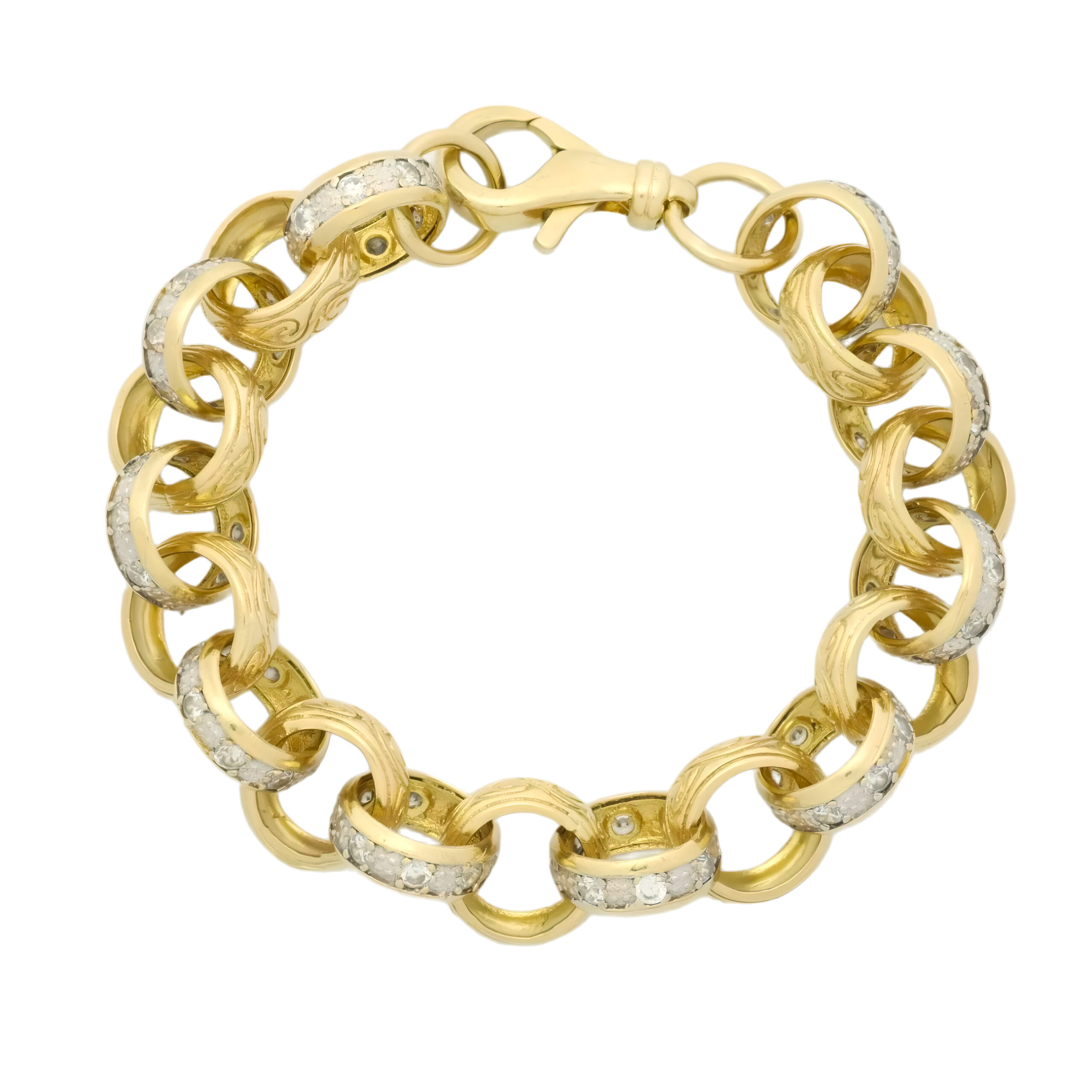 Made from 9ct yellow gold, this pre-owned solid gemstone belcher is perfect for occasional or everyday wear. This 8.5-inch belcher features 14mm links with white gemstones and patterned links that alternate giving this a classic look. Fastening with an Albert clasp, this is a perfect gift.