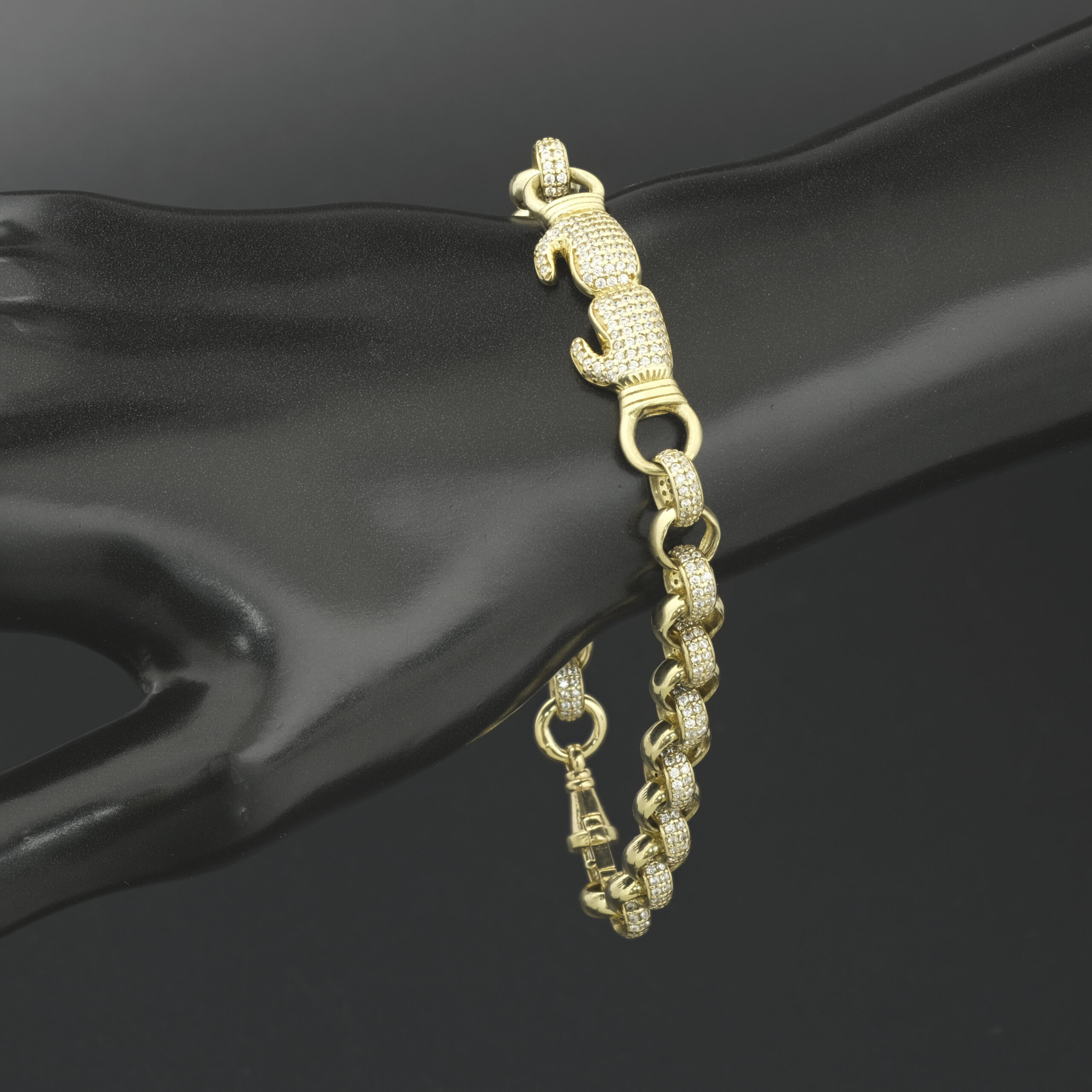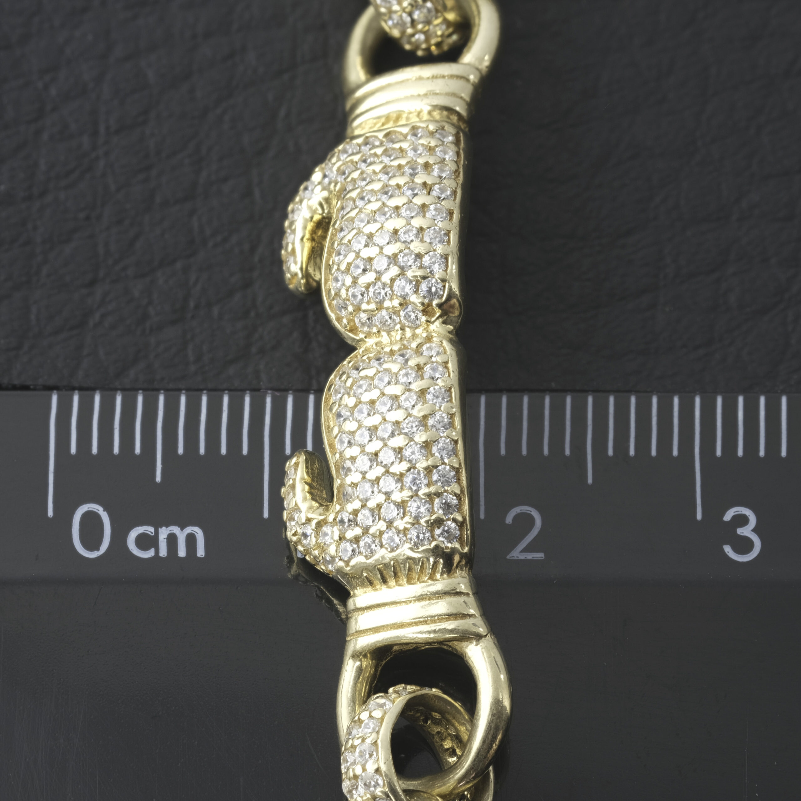 Made from solid 9ct yellow gold, this pre owned belcher bracelet with gemstone boxing gloves is perfect for occasional or everyday wear. This 9 inch belcher features 7.5mm gemstone and plain alternating links with a pair of boxing gloves in the middle full of cubic zirconia gemstones giving it a twist on a classic look. Fastening with an Albert clasp, this is a perfect gift.