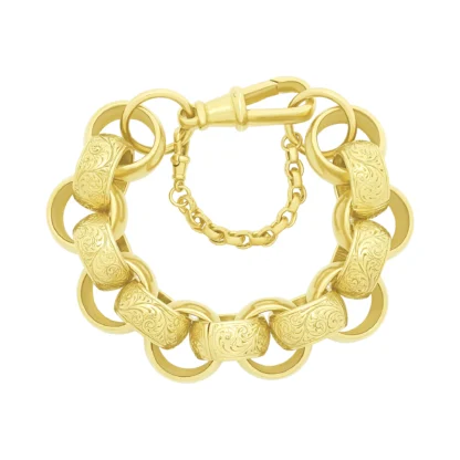 Made from solid 9ct yellow gold, this pre owned belcher is perfect for occasional or everyday wear. This 10 inch belcher features 22mm patterned and plain alternating links giving a classic look. Fastening with an albert clasp and a heavy belcher link safety chain for extra security, this is a perfect gift.