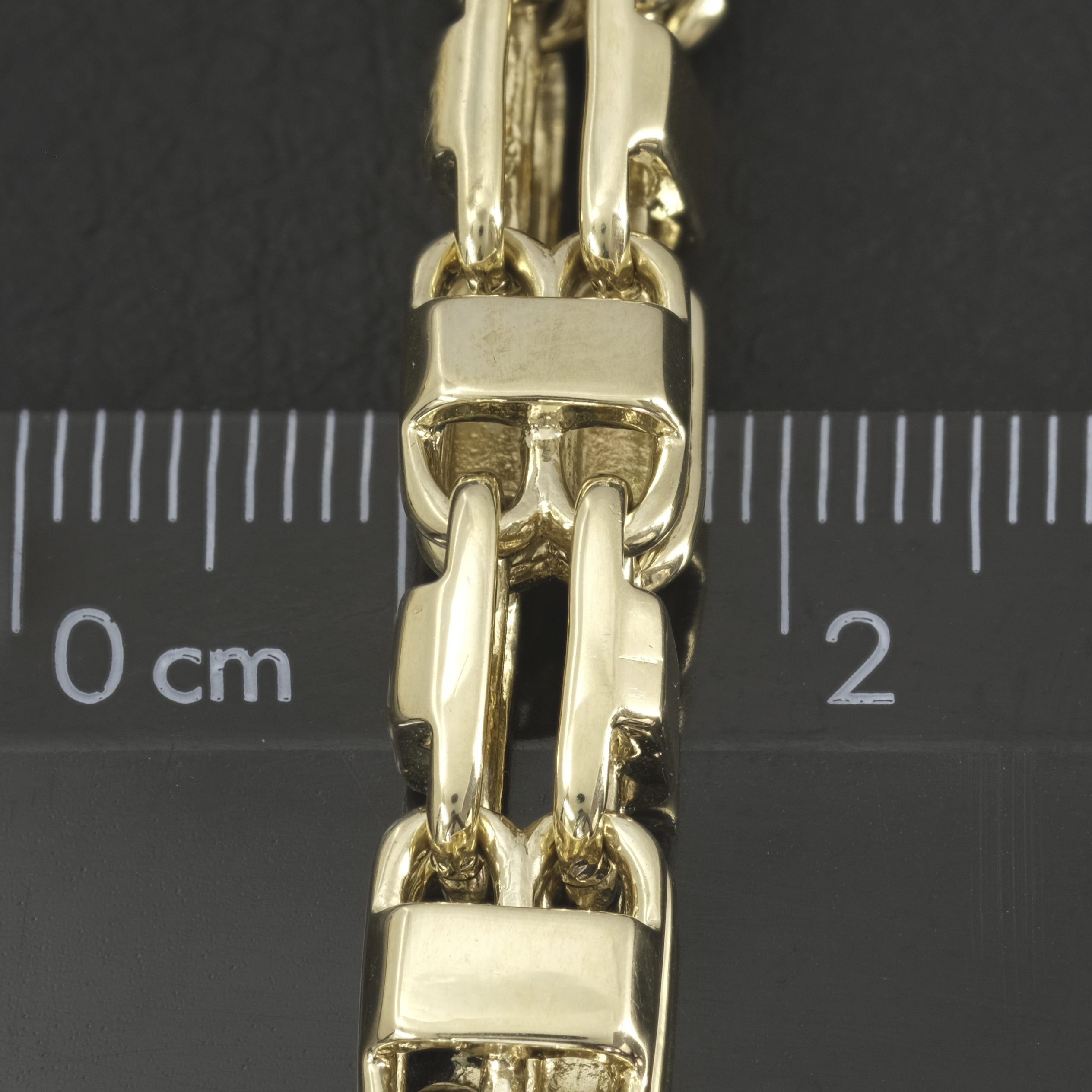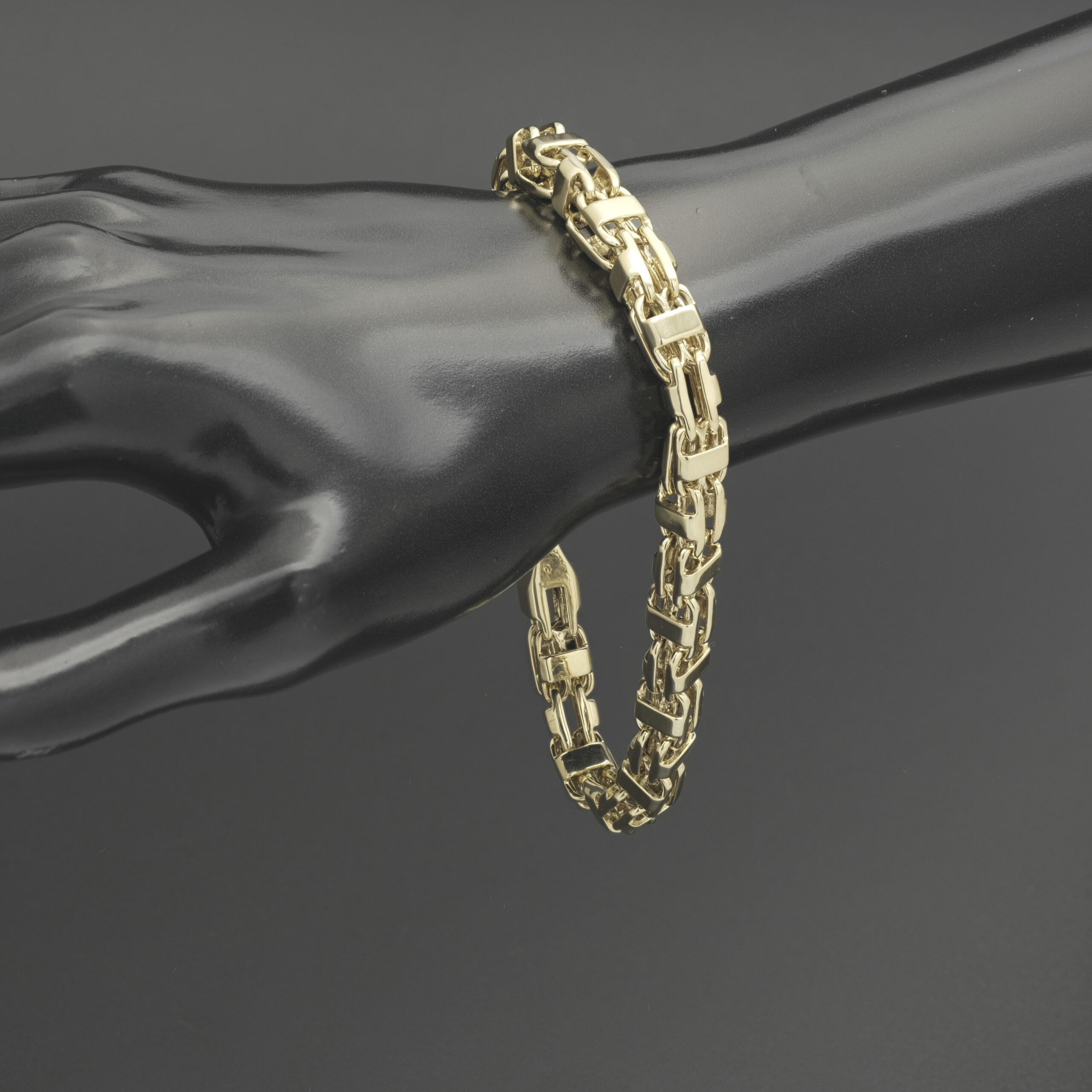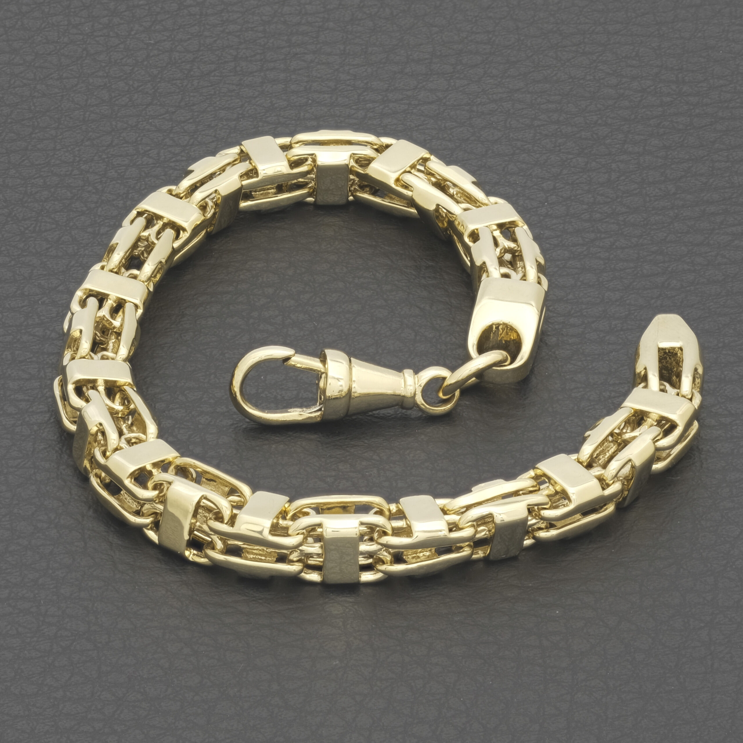 A pre-owned, solid 9ct yellow gold cage bracelet. Measuring 9.5 inches in length and 7.5mm in width, this beautifully polished bracelet makes a serious statement piece. This bracelet fastens with an Albert clasp for security and comfort.