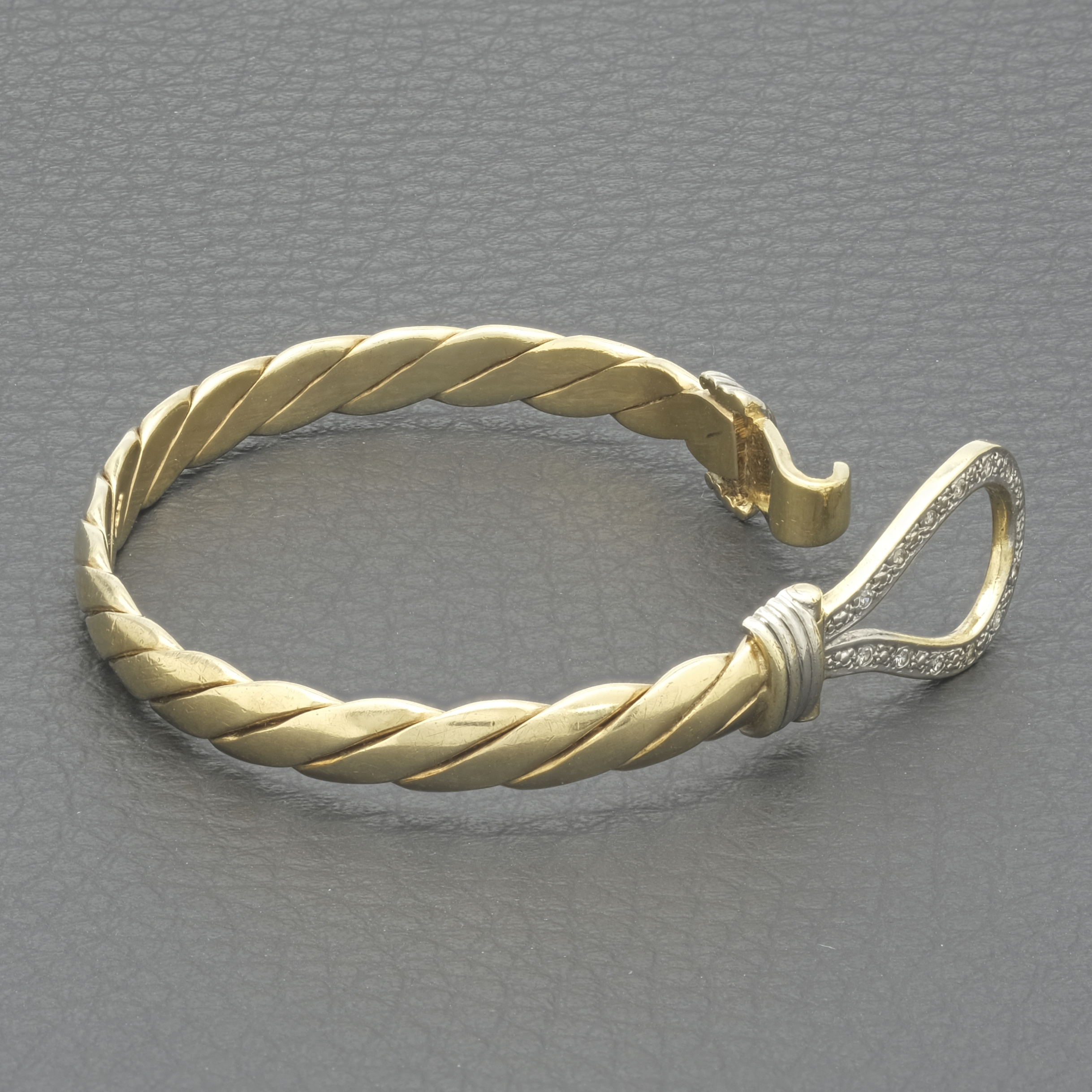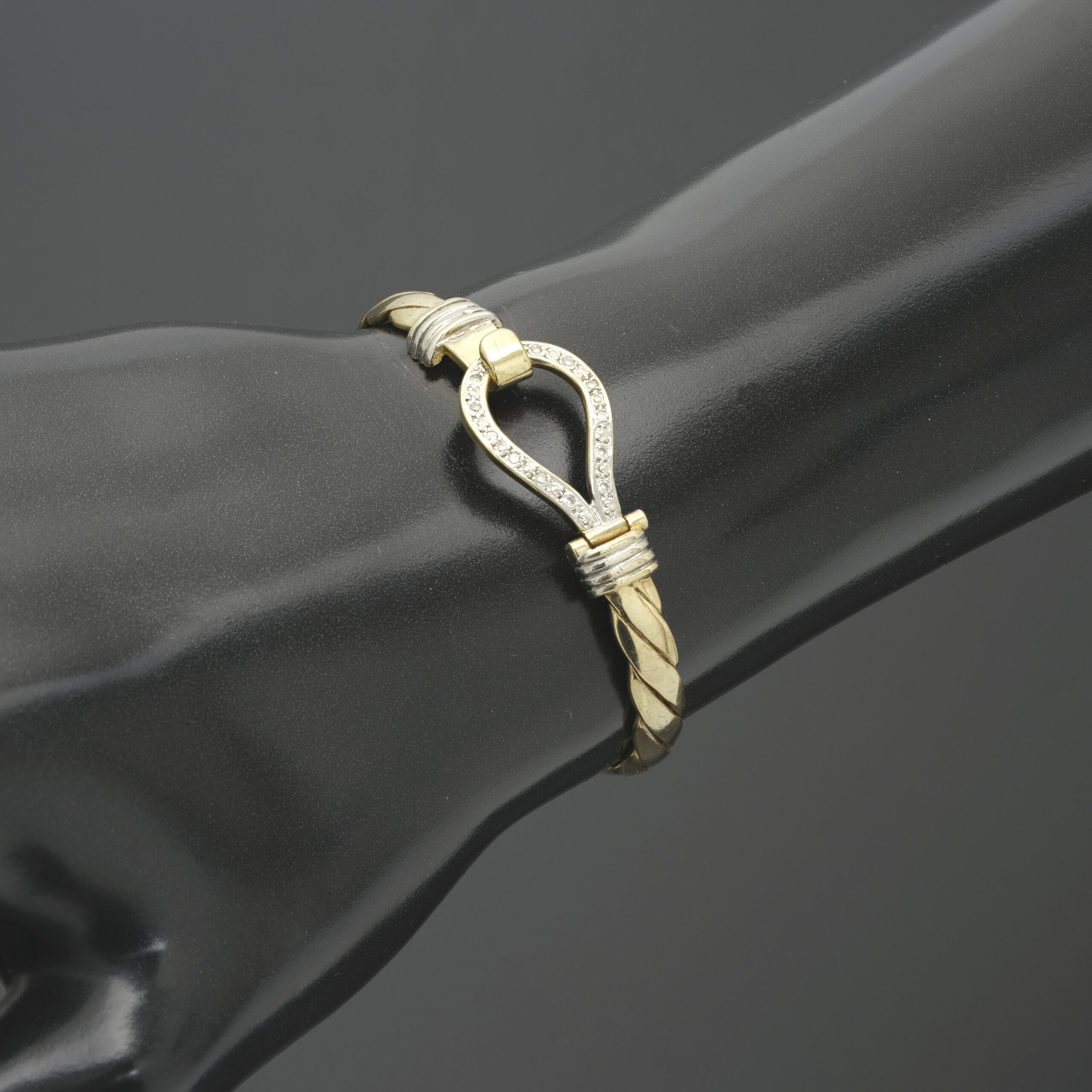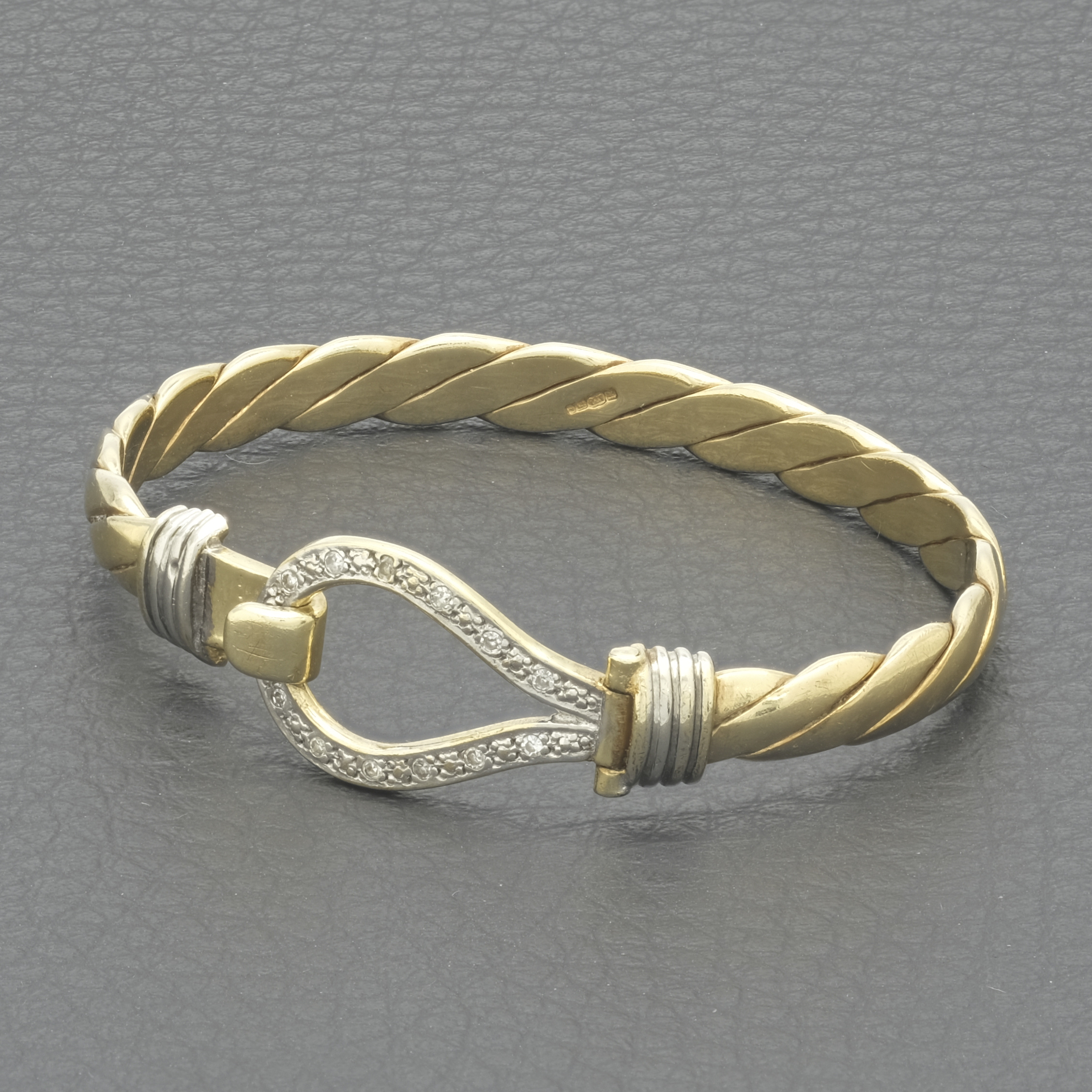 A beautiful solid pre-owned 9ct yellow gold diamond loop bangle measuring 44.5mm in width and an 4.5mm thickness. This bangle has a weight of 11.9g. Perfect for occasional or everyday wear.