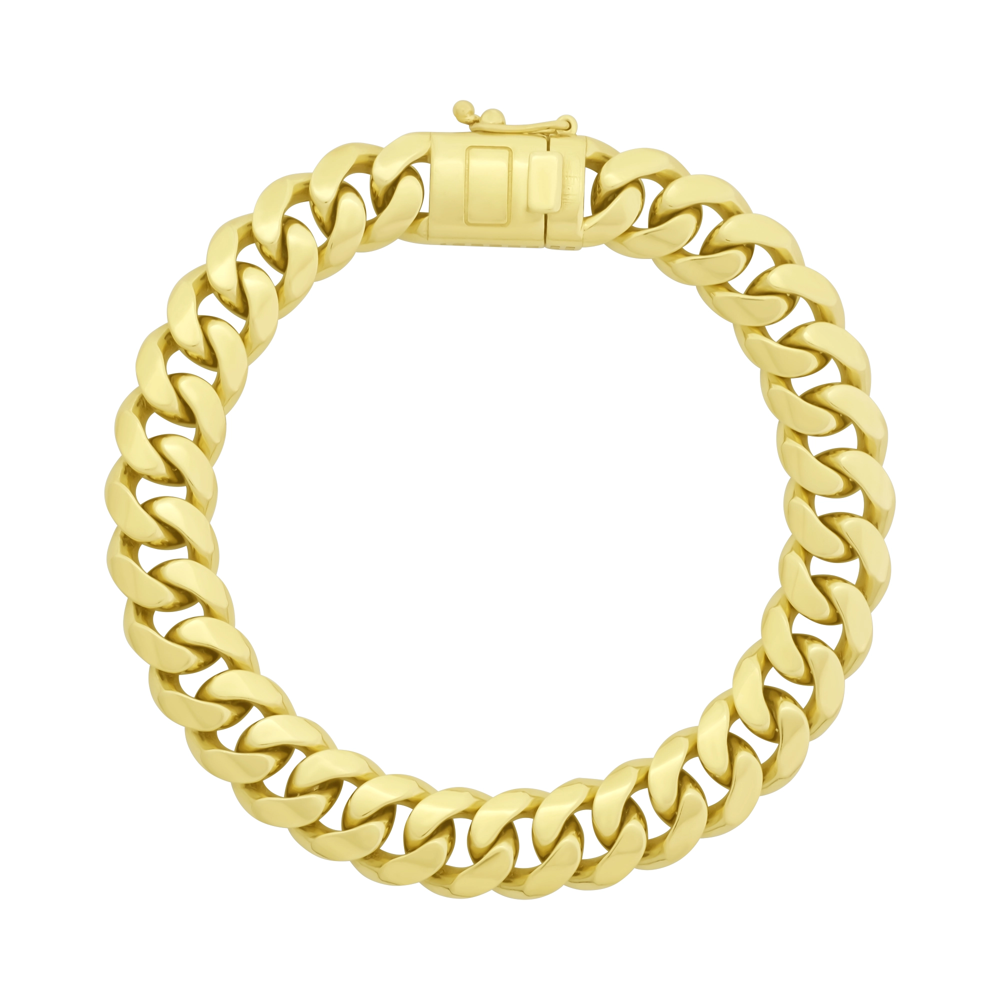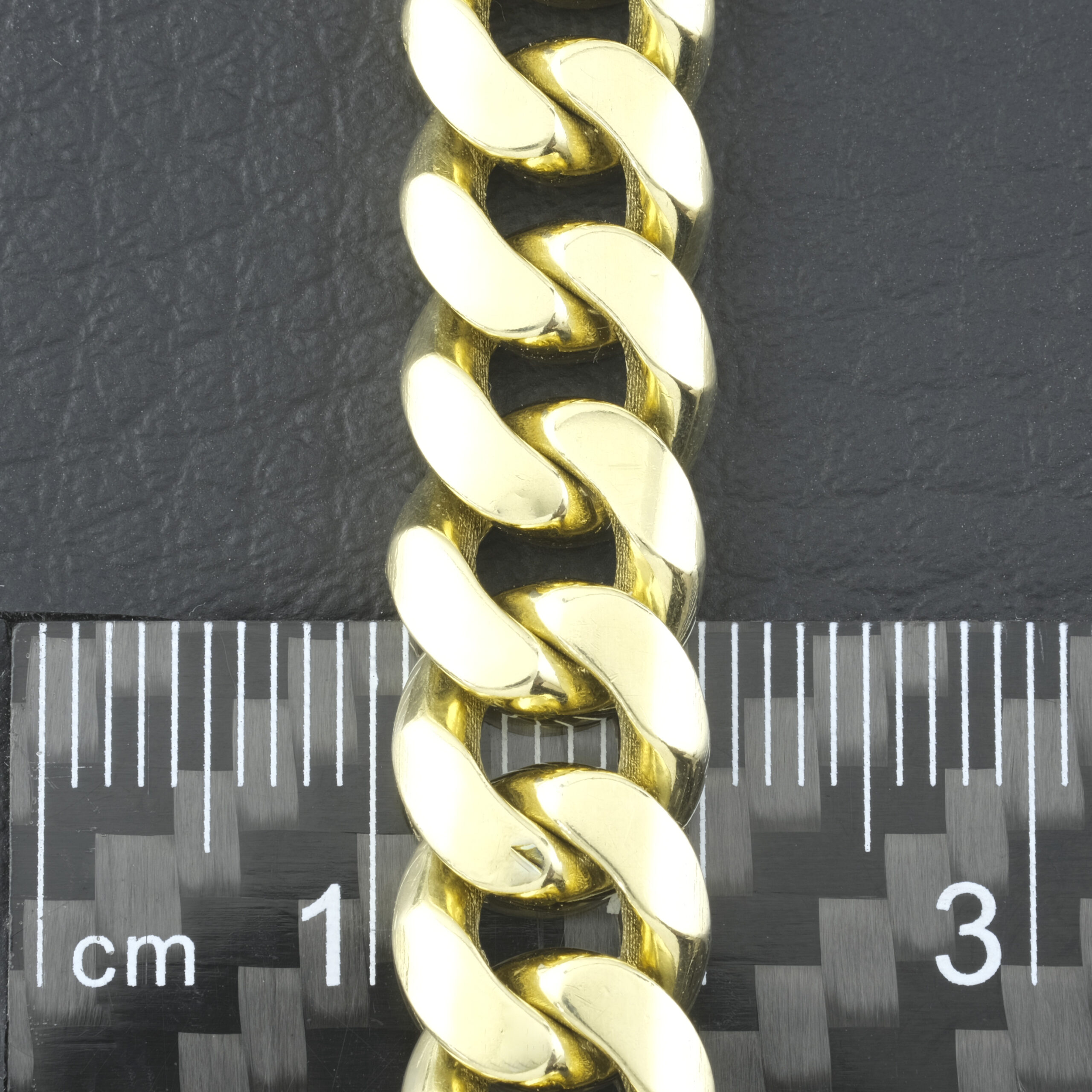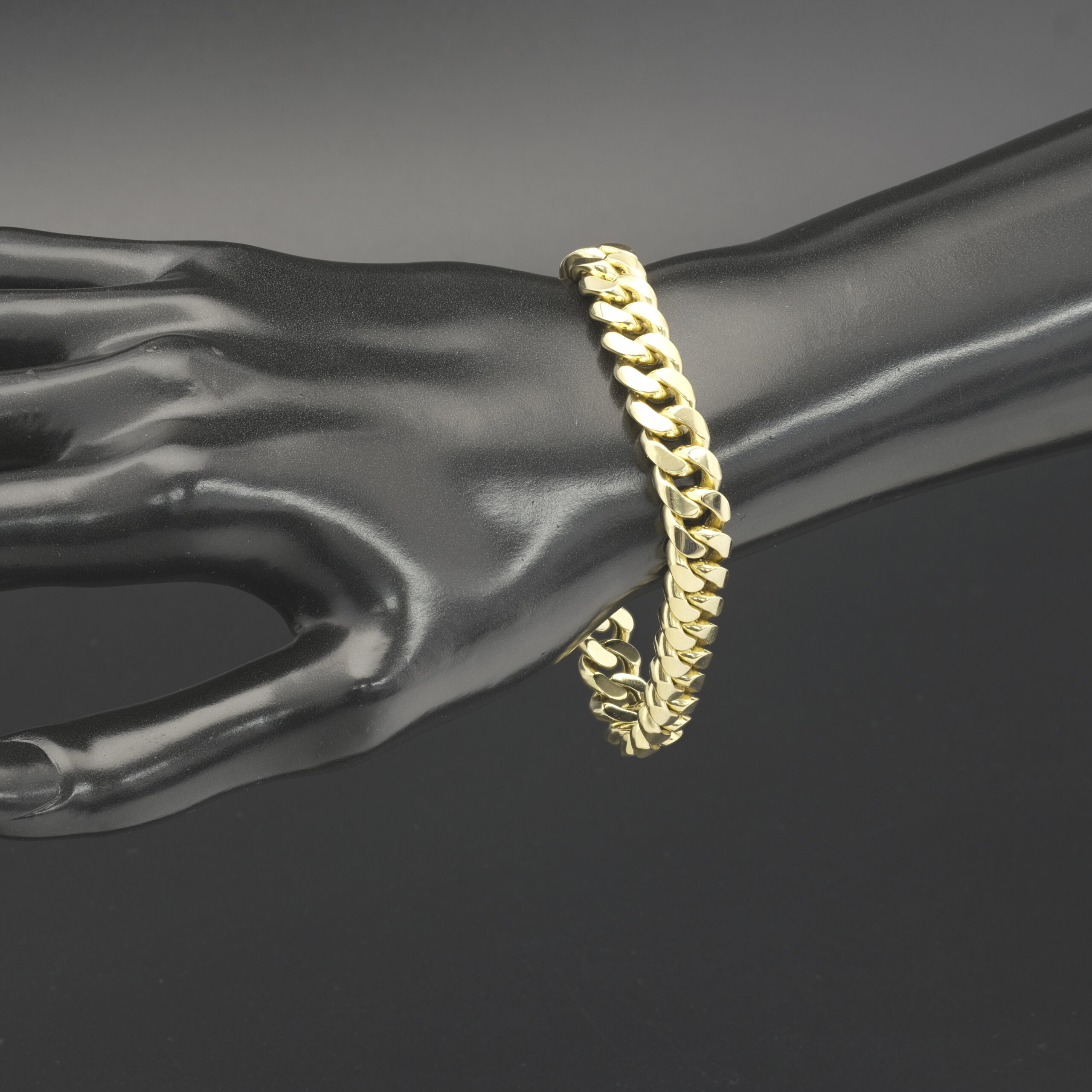 Crafted from 9ct yellow gold, this pre-owned Cuban bracelet is made using vacuum casting allowing this hollow Cuban to be lightweight with the strength for everyday wear. Measuring seven inches in length and 9.5mm in width, this Cuban fastens with a box clasp with safety catches on either side for added security.