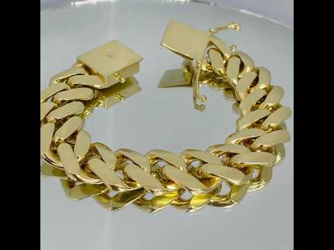 A highly polished, brand-new-Cuban bracelet crafted from solid 9ct yellow gold that is perfect for occasional or everyday wear. Measuring 8.5inch long and 20mm wide, this Cuban fastens with a box clasp with safety catches on either side for that extra security.