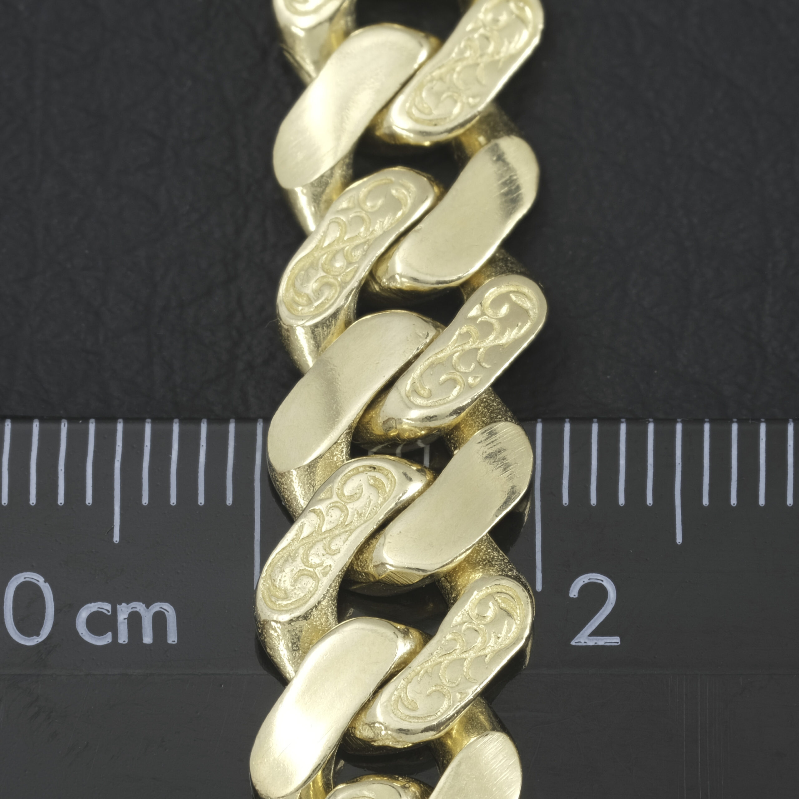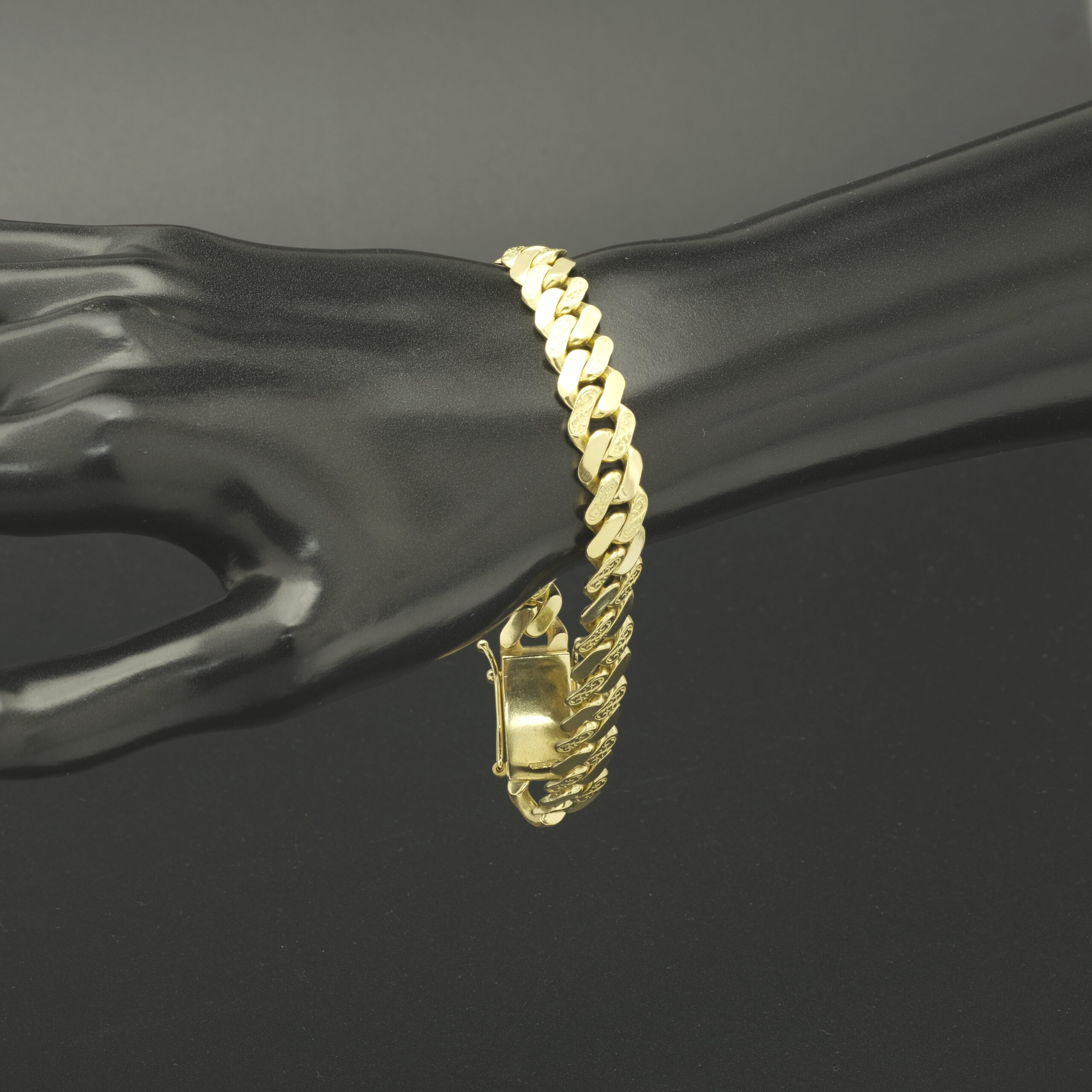 Crafted from 9ct yellow gold, this pre-owned solid Patterned Cuban bracelet. Measuring 8.5 inches in length and 10mm in width, this Cuban fastens with a box clasp with safety catches on either side for added security.