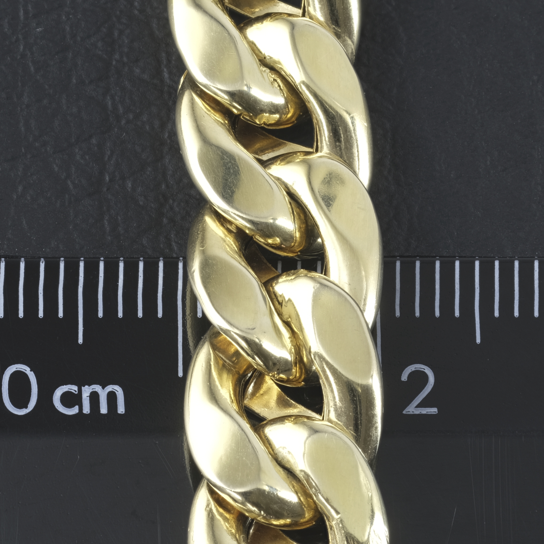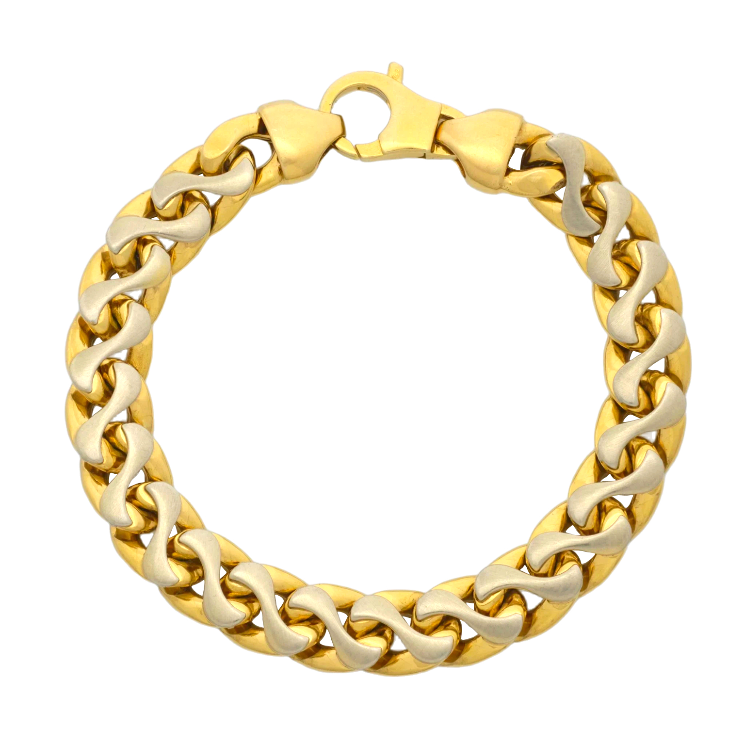 This stunning hollow highly polished pre-owned 9ct yellow and white gold fancy curb bracelet is sure to get you noticed. Measuring 7.5 inches in length and 10mm wide, this Curb fastens with a lobster claw clasp for comfort and security.
