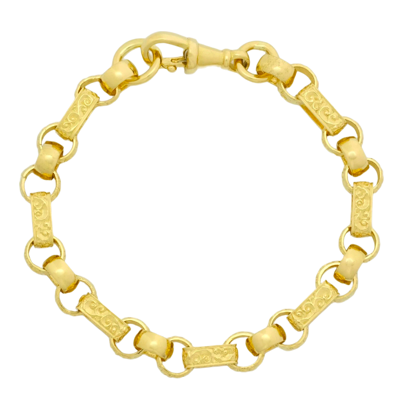 A change from the standard belcher, this gypsy link bracelet is a fantastic design. Made from solid 9ct yellow gold, this pre-owned bracelet is perfect for occasional and everyday wear. With 7.5mm plain and patterned alternating links, this bracelet measures 7.5inch in length, securely fastening with an Albert clasp for comfortable wear.