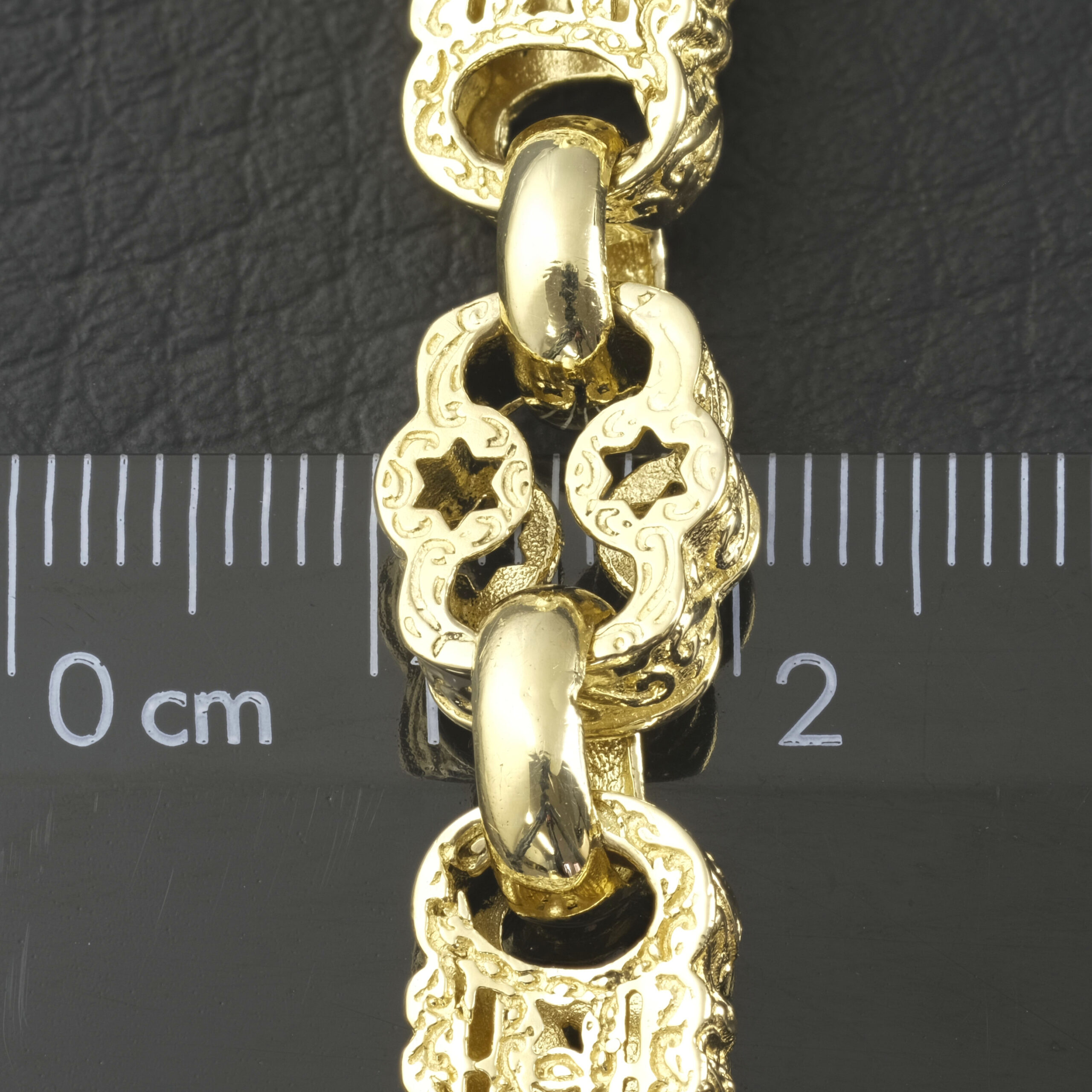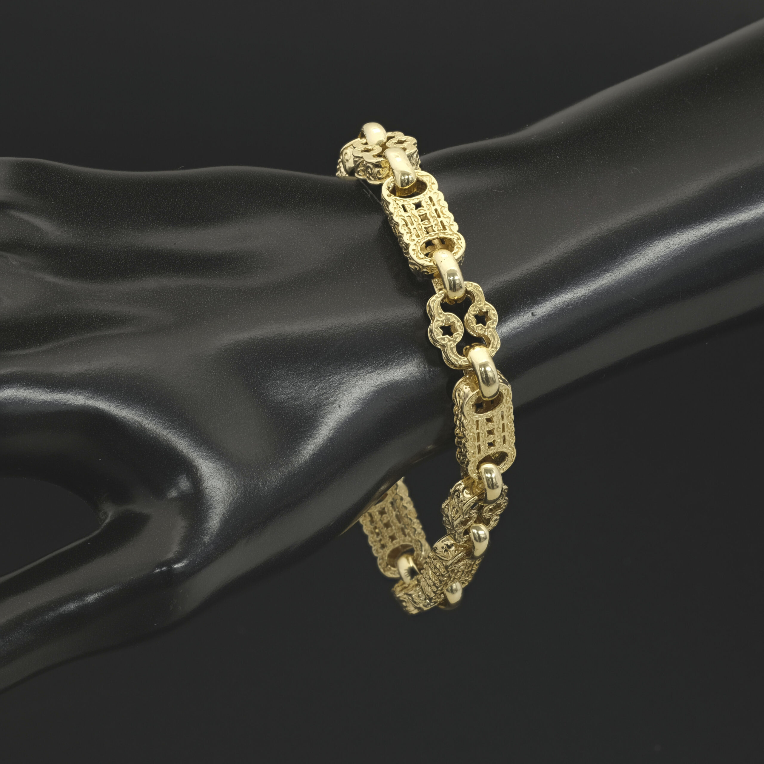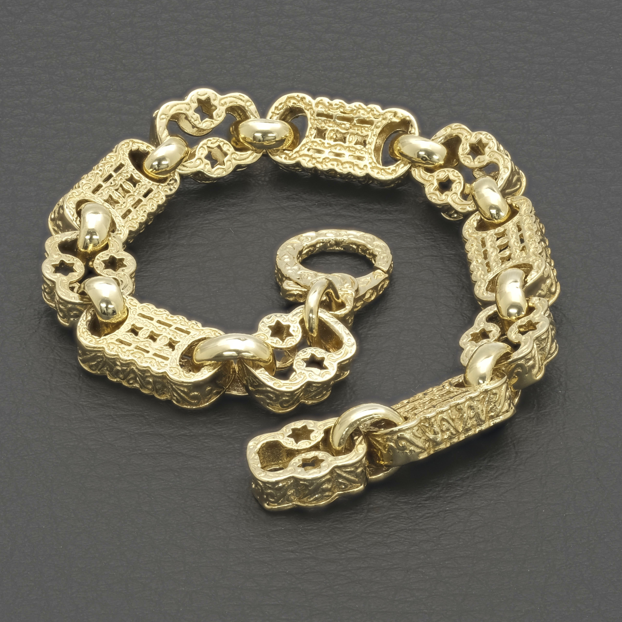 A pre owned hollow, 9ct yellow gold stars & bars bracelet that is perfect for occasional or everyday wear. This bracelet measures 8 inches in length and 10mm in width, fastening with a lobster claw clasp for secure and comfortable wear.
