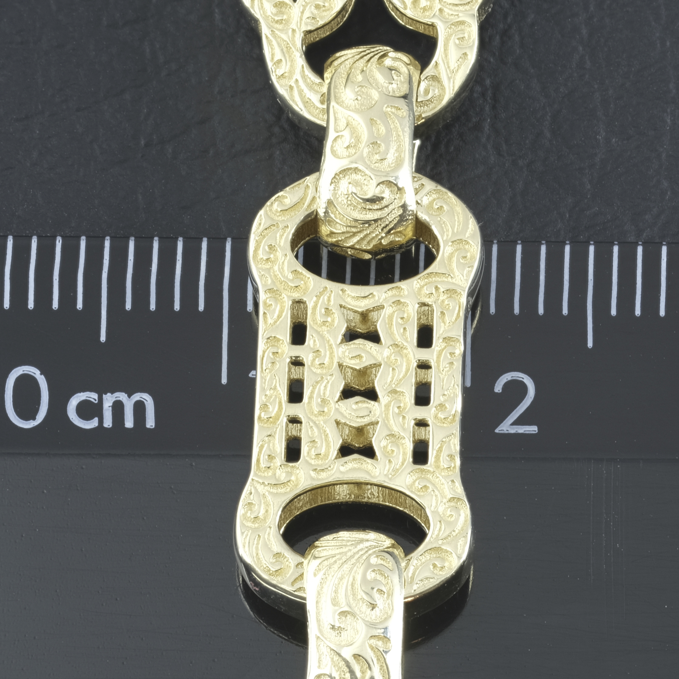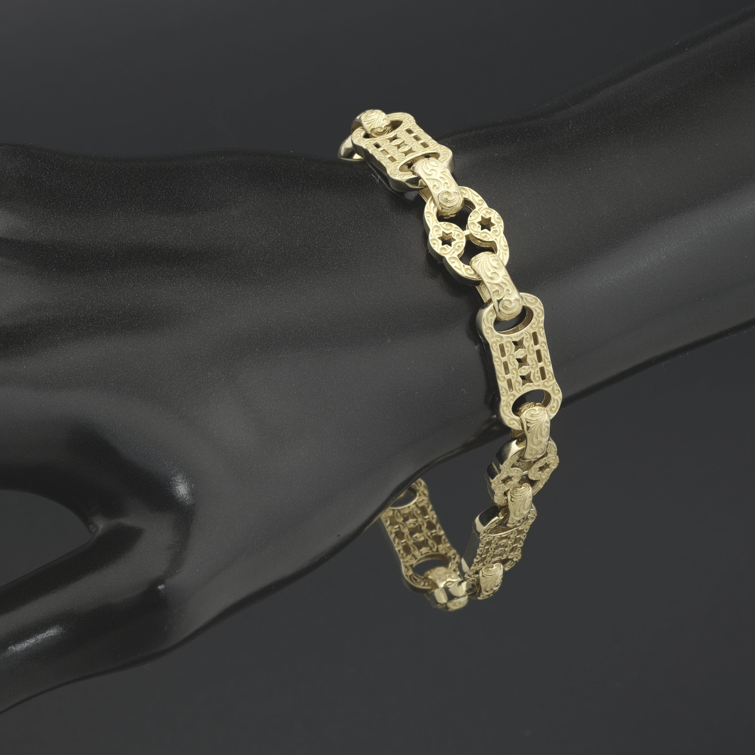 A pre-owned, 9ct yellow gold hollow stars & bars bracelet that is perfect for occasional or everyday wear. This bracelet measures 8 inches in length and 11mm in width, fastening with a albert clasp for secure, comfortable wear.