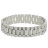 A stunning pre-owned 18ct white gold diamond watch strap bracelet. This bracelet consists of 360 round cut brilliant diamonds in total, with 12 diamonds set to each link. Colour G-H, clarity SI-I1. This bracelet measures 18mm in width and 8inch in length, securely fastening with a thumbpiece and folding curved clasp. This item comes with a SafeGuard Valuation for Insurance.