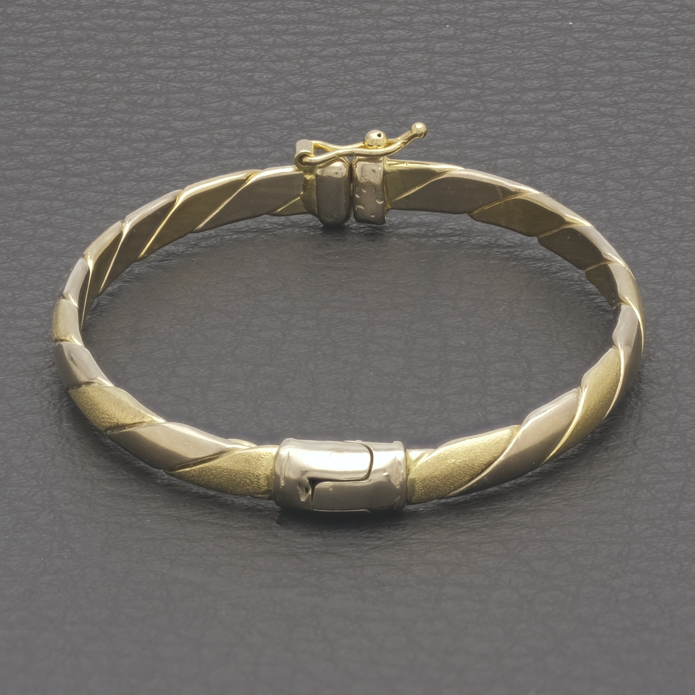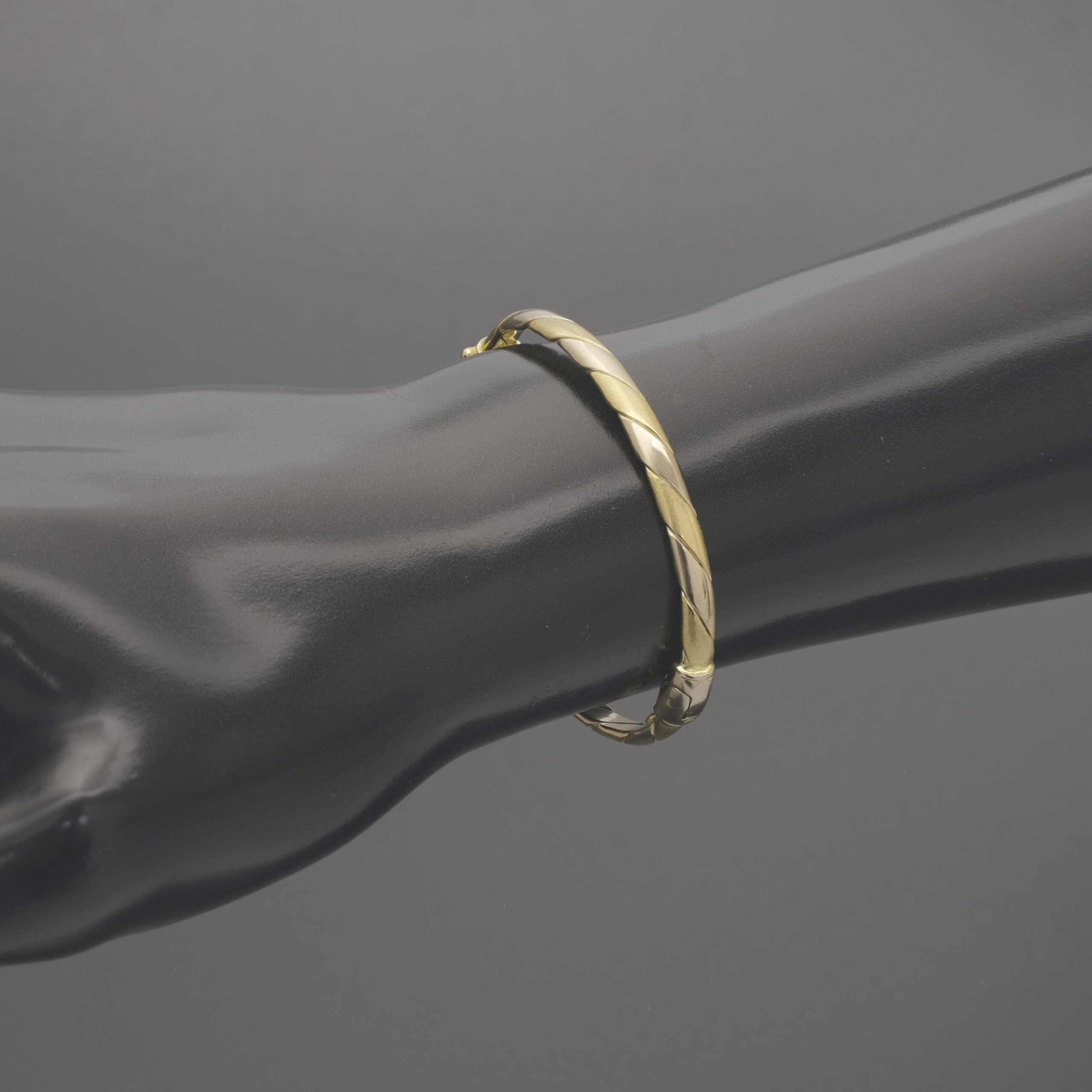 A beautiful pre-owned 18ct yellow & white children’s twist bangle measuring 33.5mm in width and an 4mm thickness. This gold bangle features a twisting pattern which alternates between the yellow and white gold. This bangle has a weight of 6.3g.