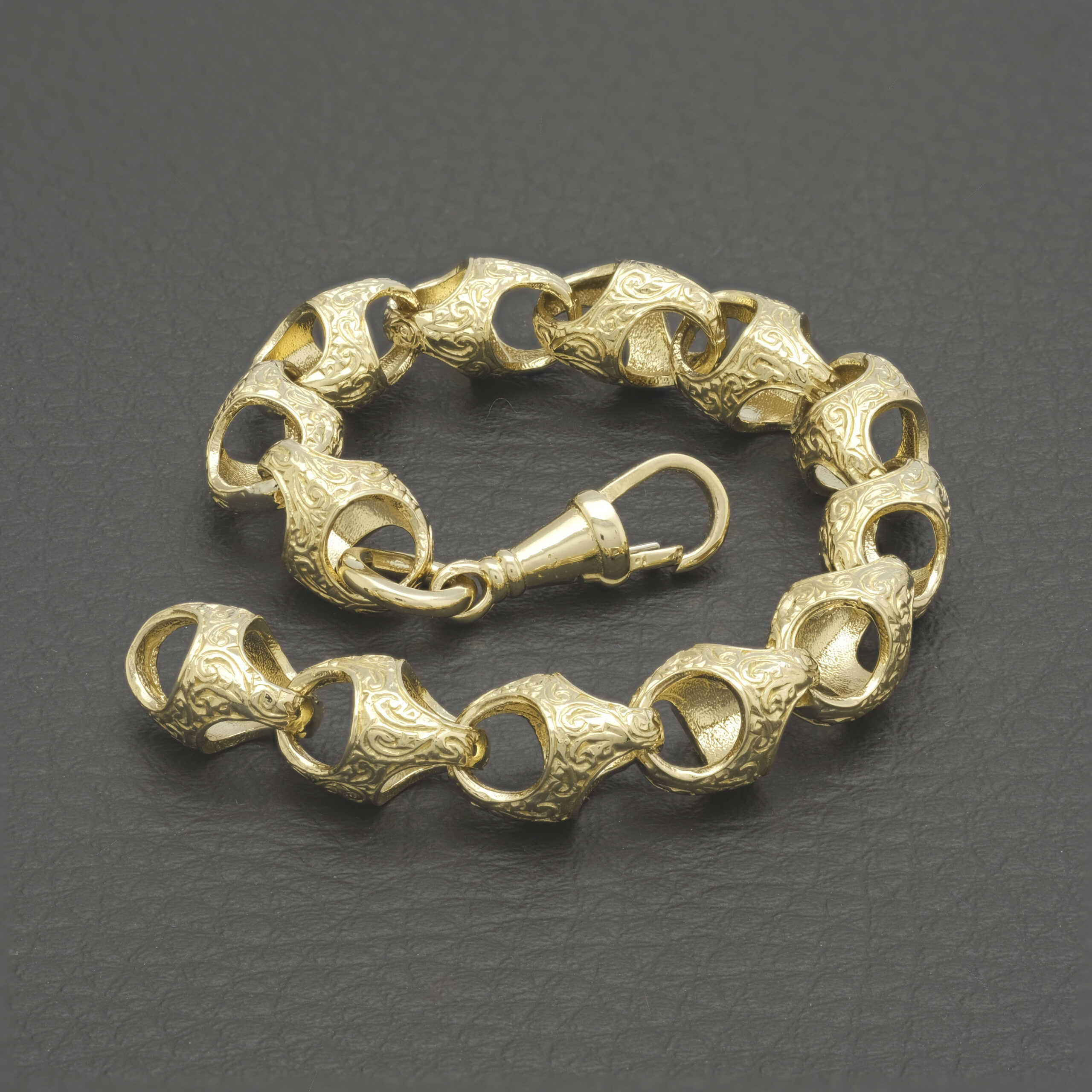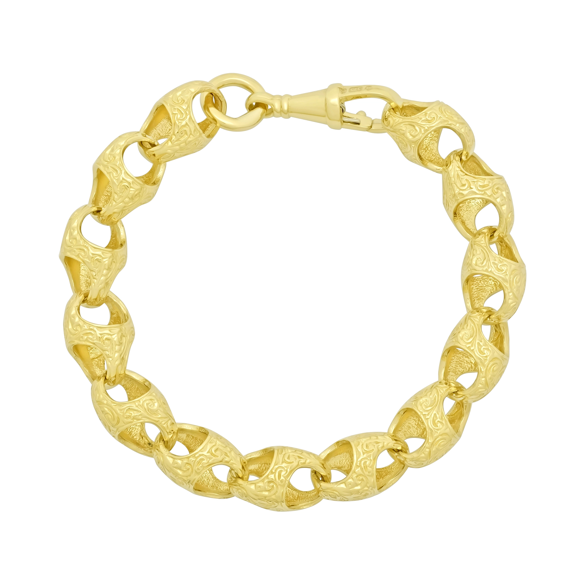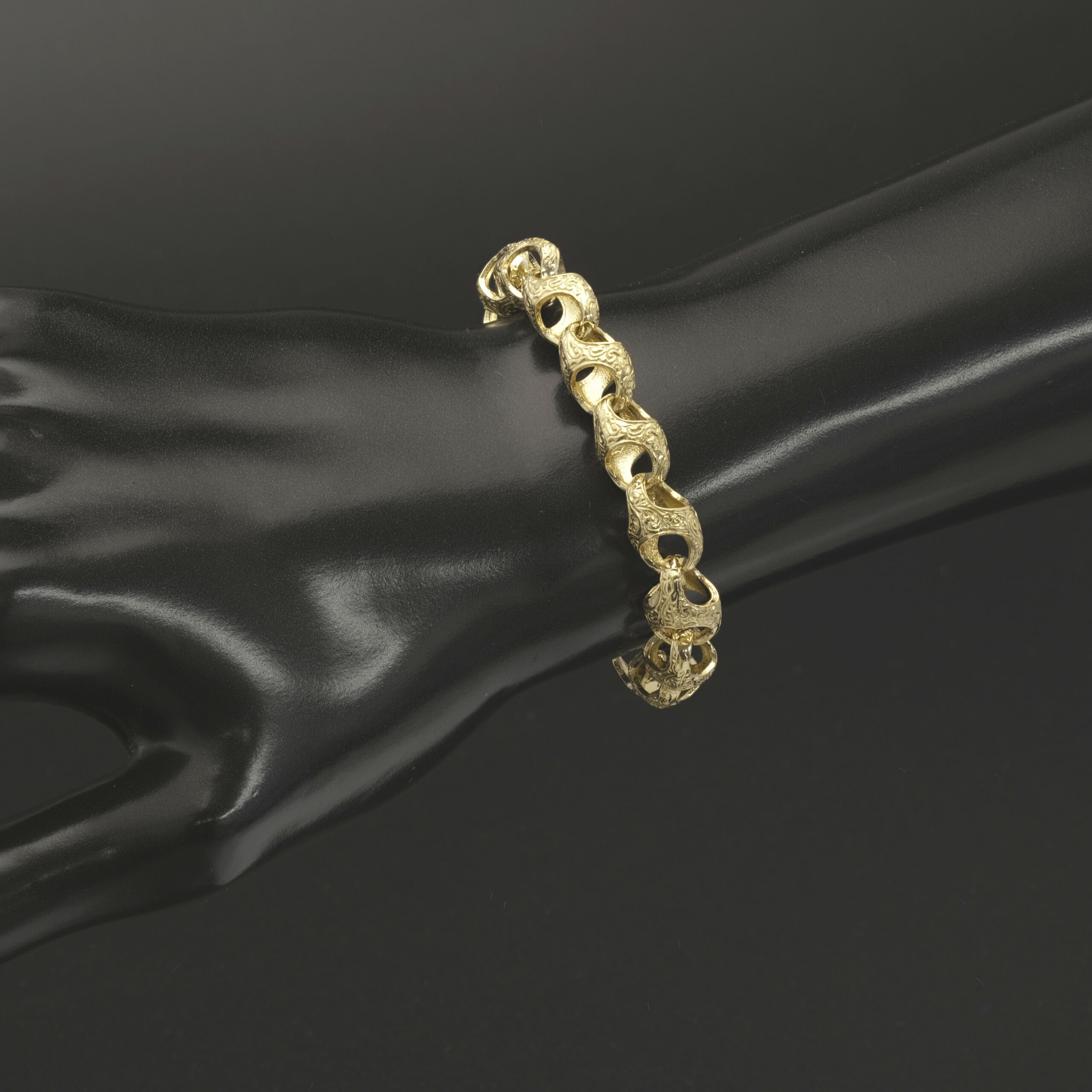 A pre-owned, highly polished solid acorn bracelet crafted from 9ct yellow gold which makes it perfect for everyday wear. Measuring 6 inches in length and 9mm wide, this bracelet fastens with a albert clasp for comfort and security.