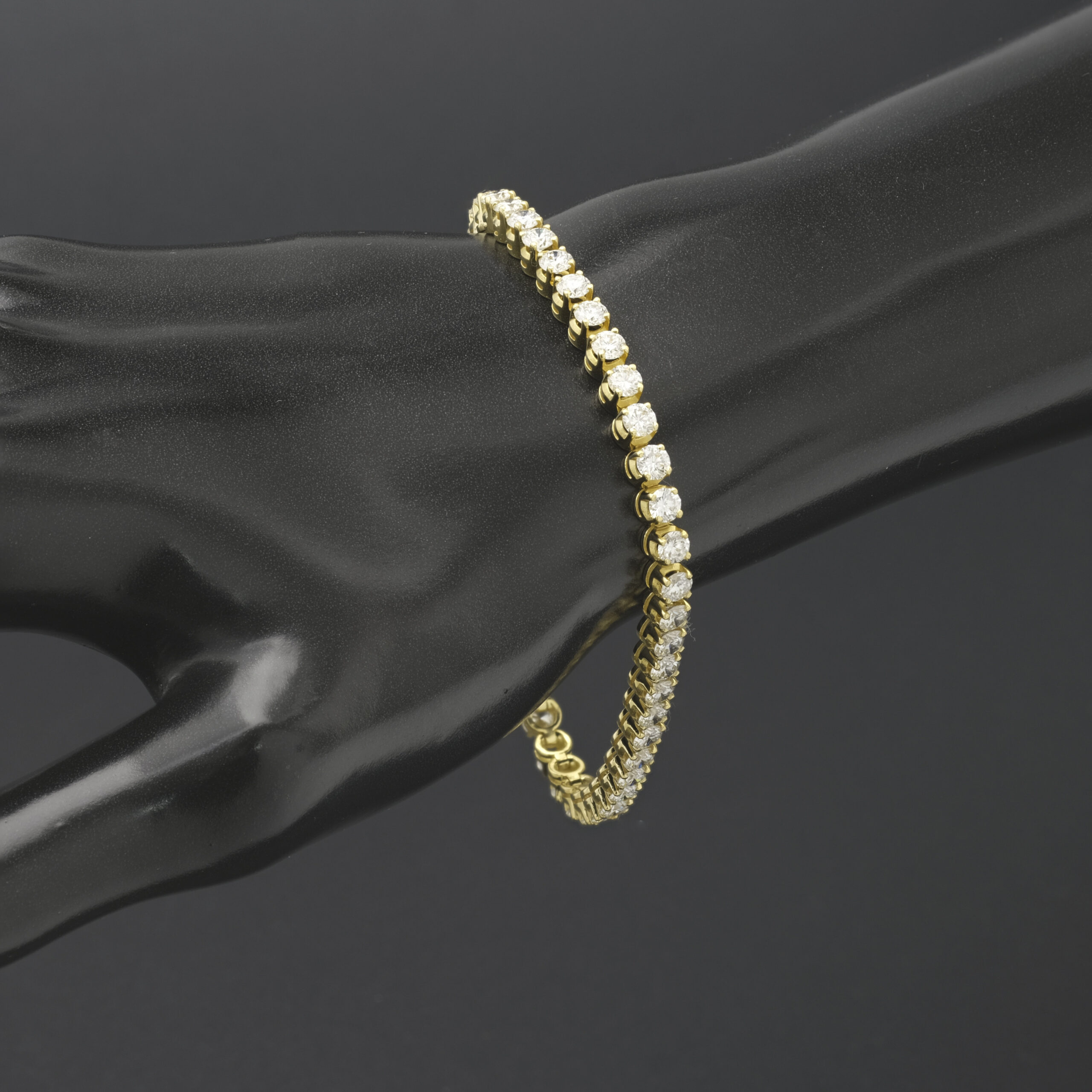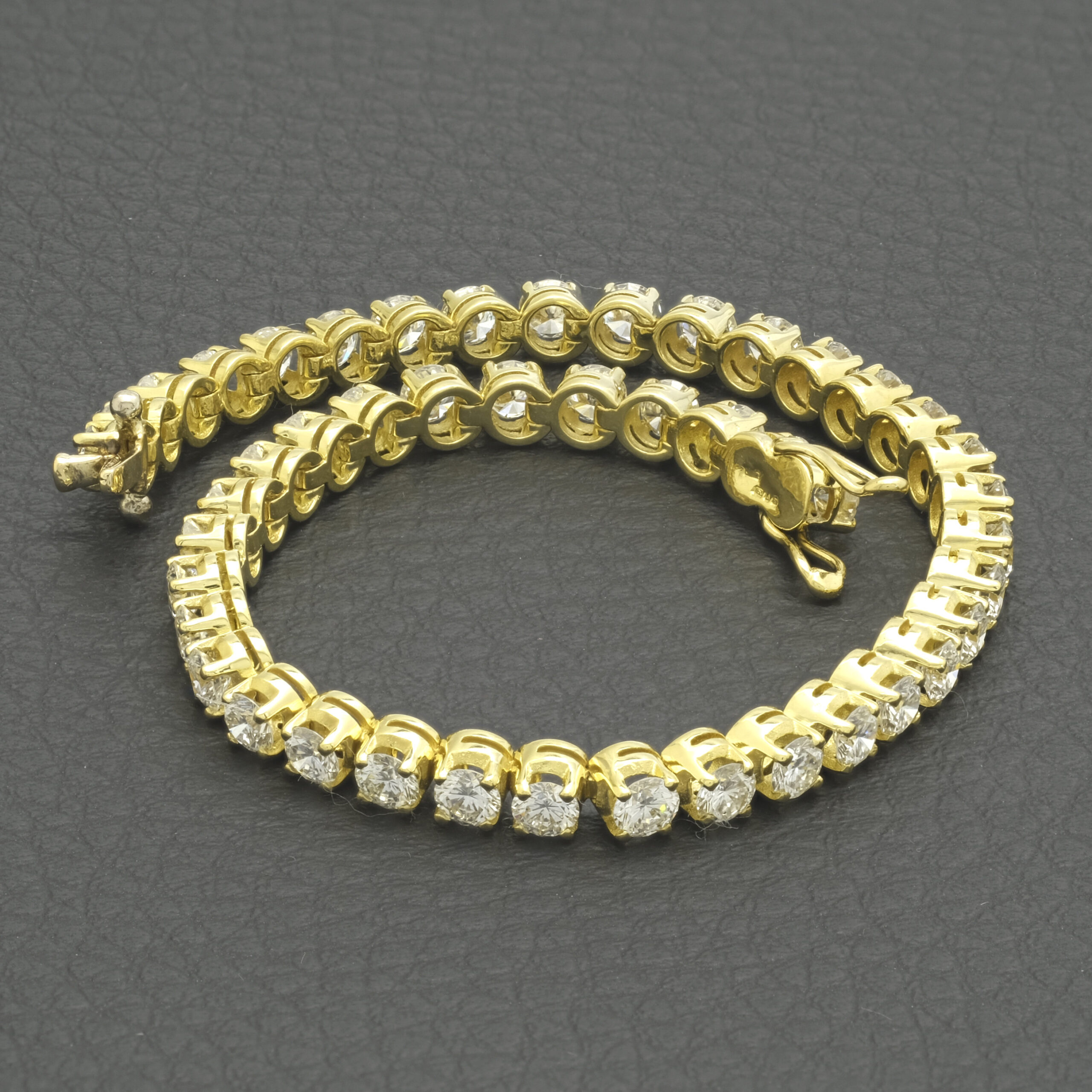 A stunning pre-owned 18ct yellow gold diamond line bracelet. A diamond line bracelet is the epitome of refined elegance, featuring a continuous row of meticulously cut diamonds that exude brilliance and sophistication. Each stone is precisely set in a delicate yet sturdy framework, ensuring maximum sparkle and durability. This diamond bracelet has a total carat weight of 6.90ct which has a colour of G-H and a clarity of VS2-SI1. The seamless design creates a graceful silhouette that perfectly adorns the wrist, making it an ideal choice for any special occasion or as an everyday statement of luxury.