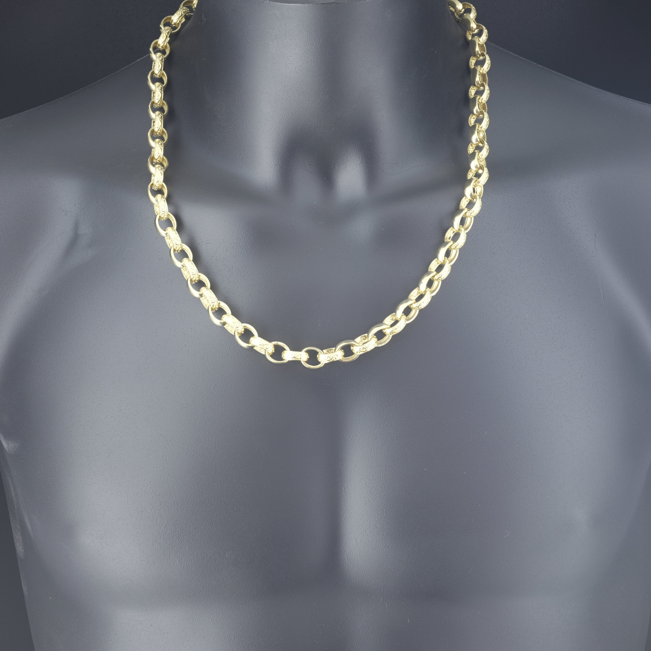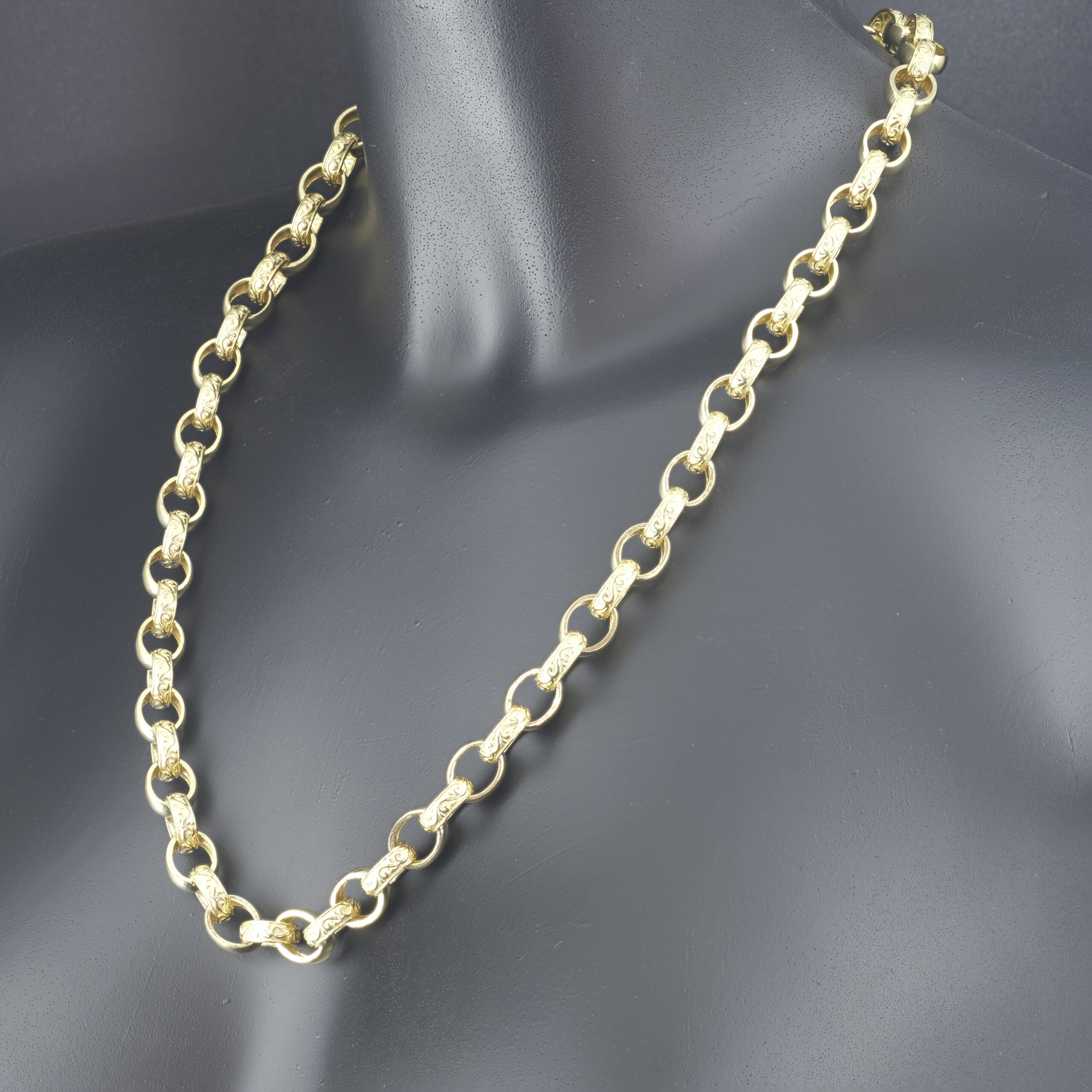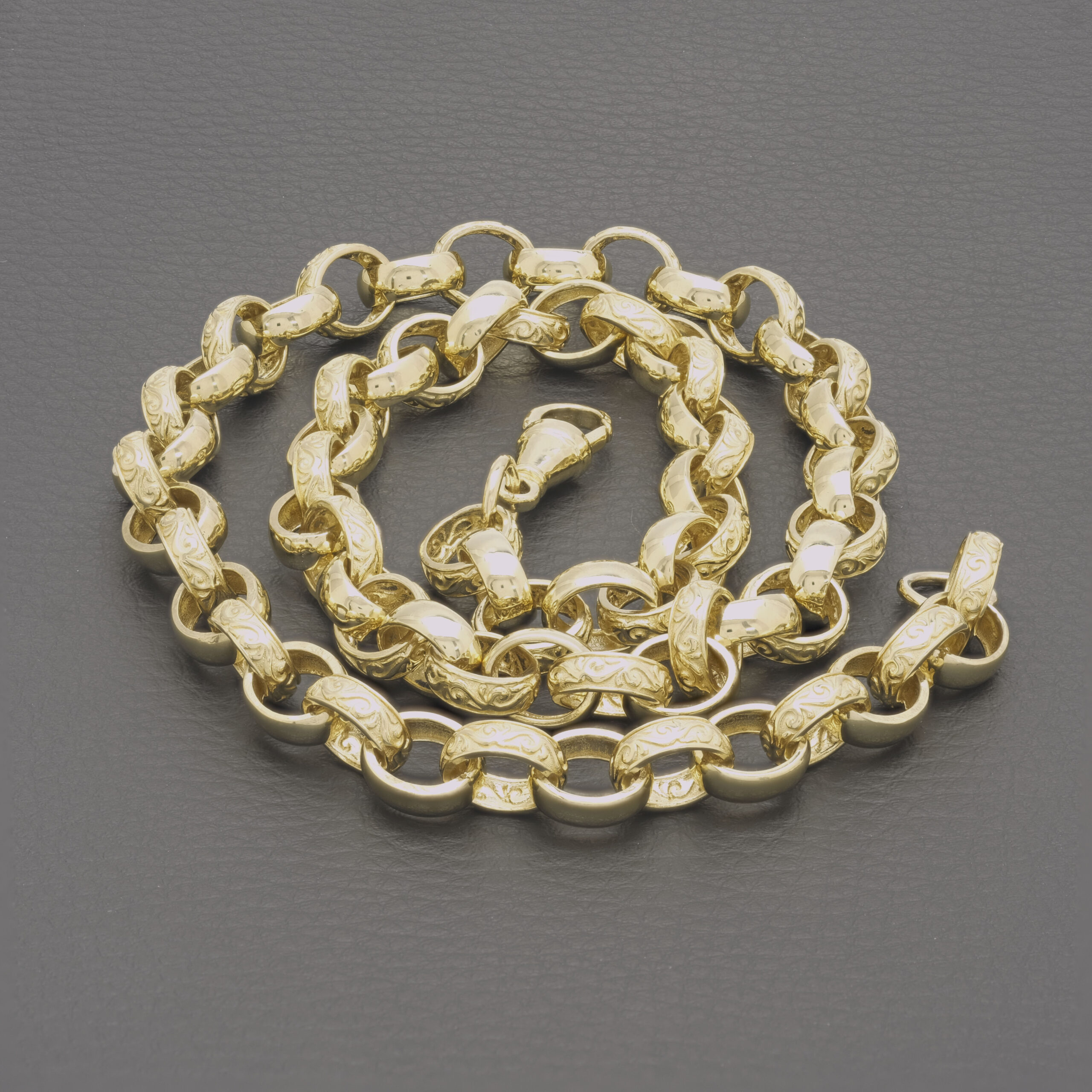 This stylish pre-owned solid belcher chain is made from 9ct yellow gold and is perfect for occasional or everyday wear. This chain measures 10.5mm in width and 23.5 inches in length with patterned and plain alternating links, perfect to hang a pendant from or wear alone. Fastening with a albert clasp ensures comfortable and secure wear