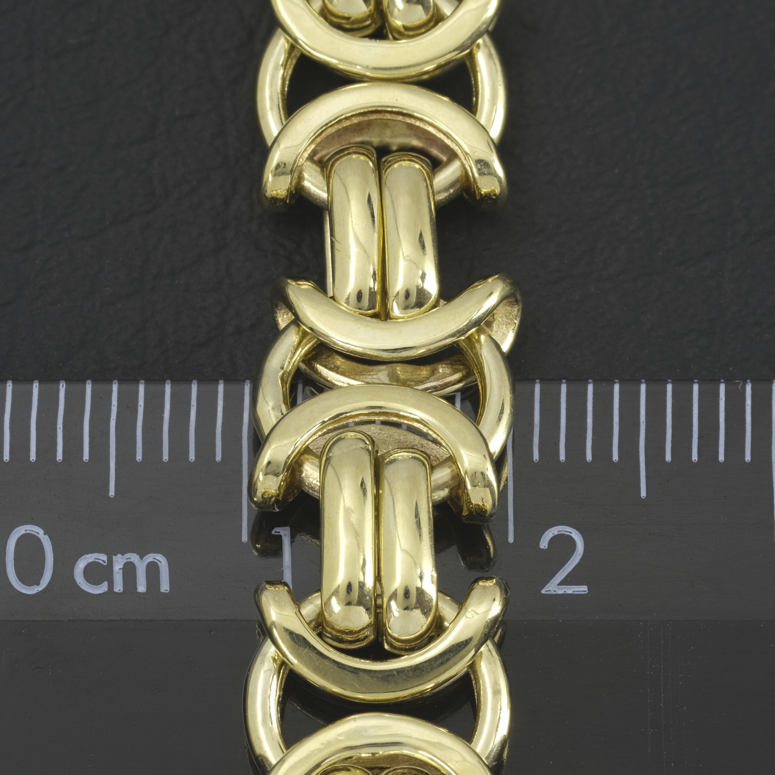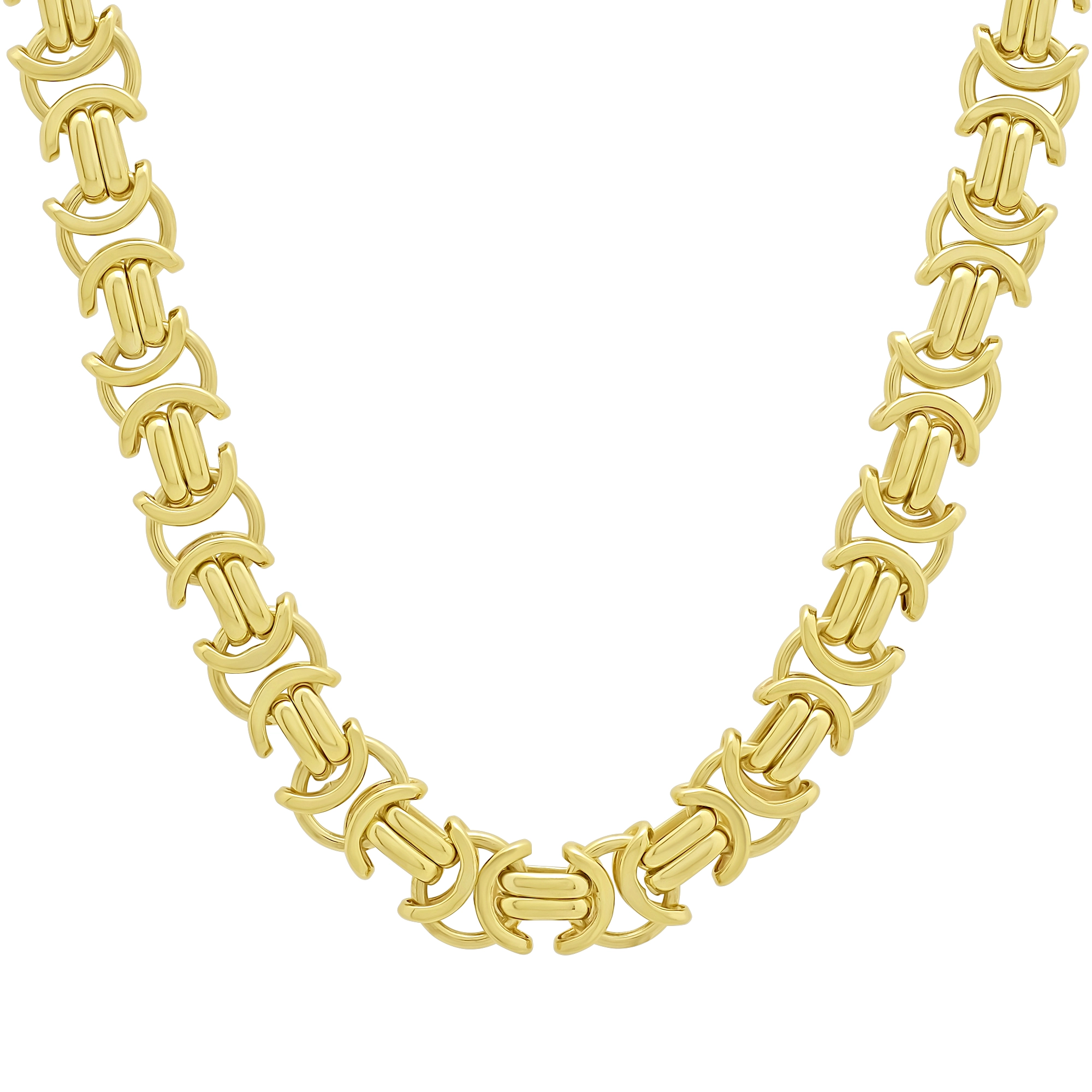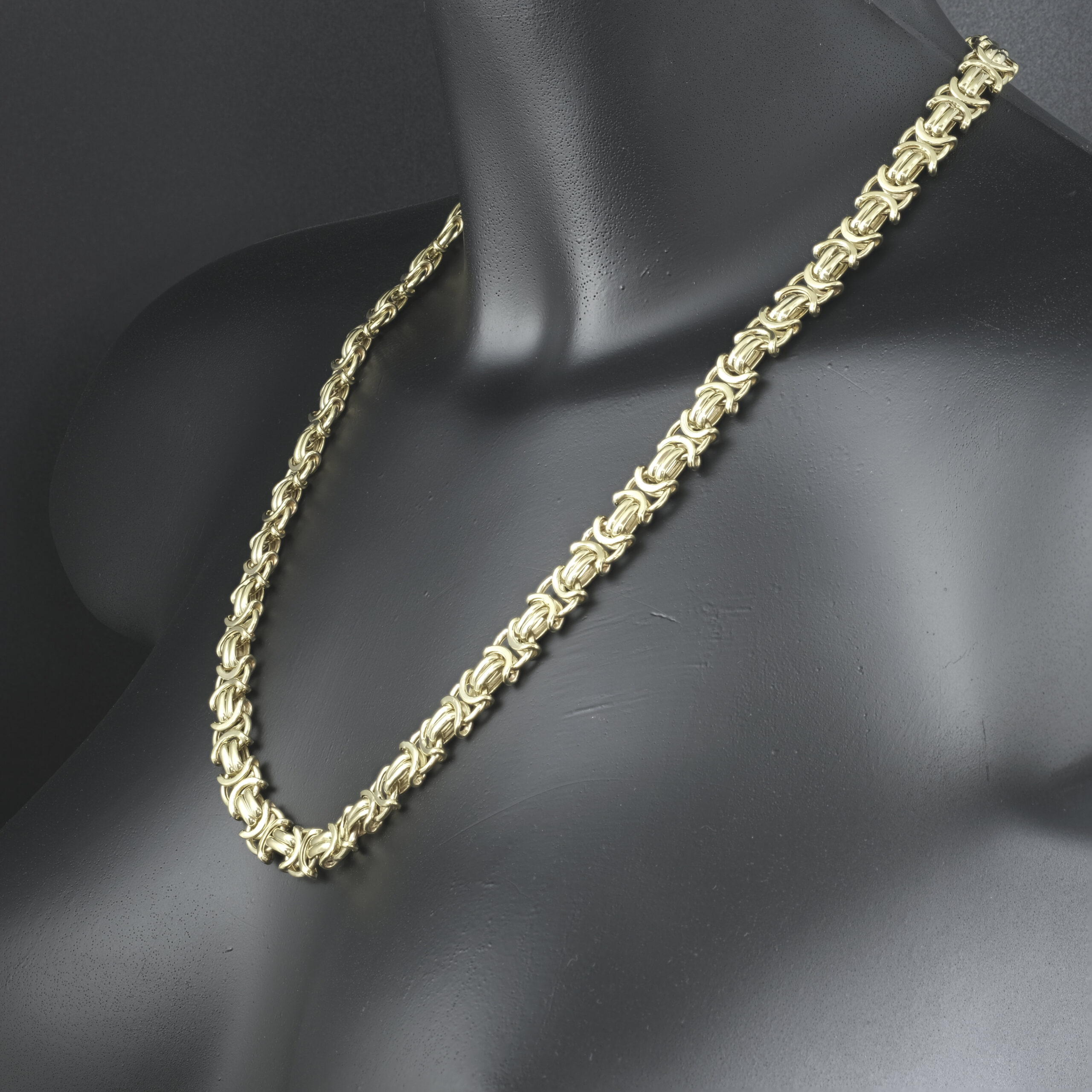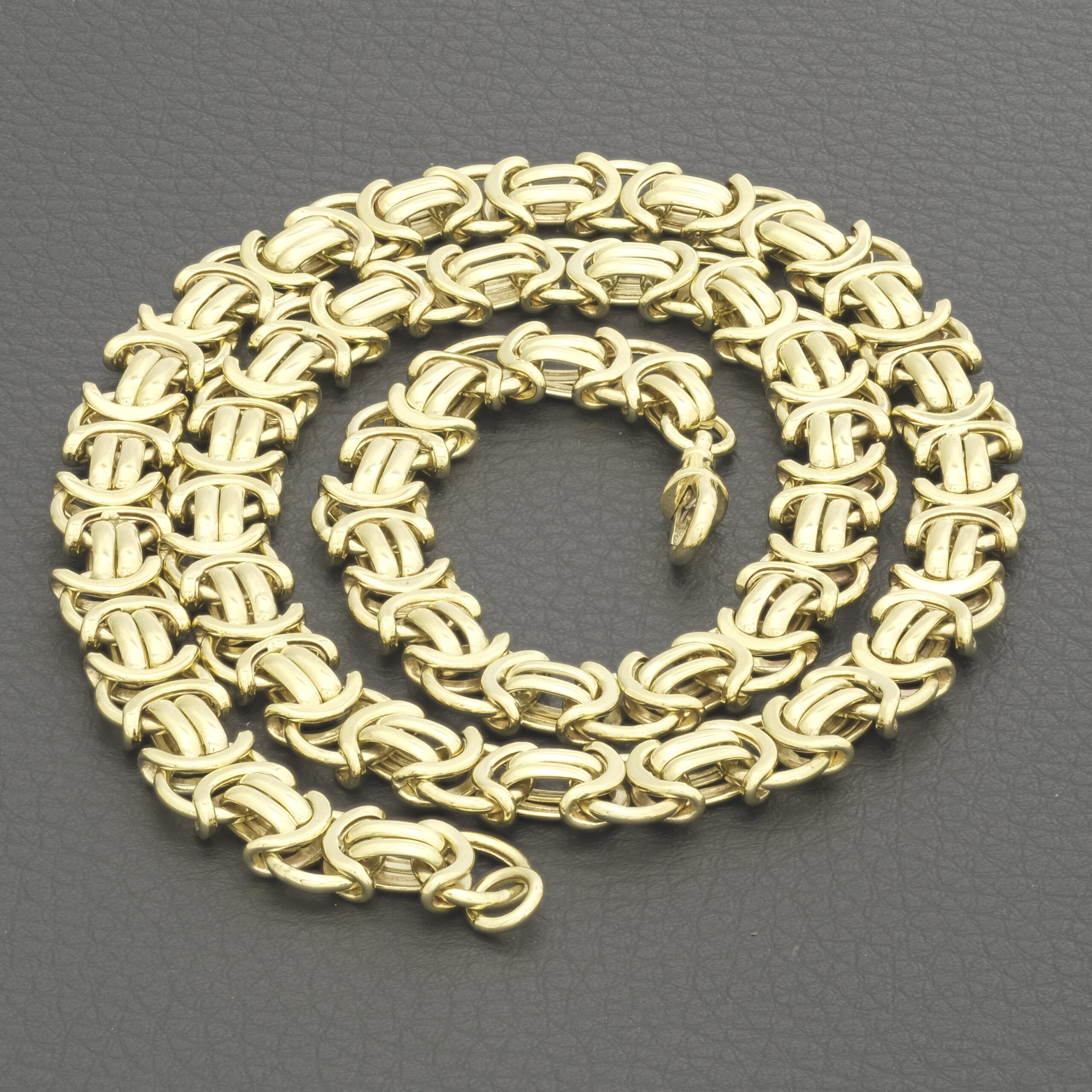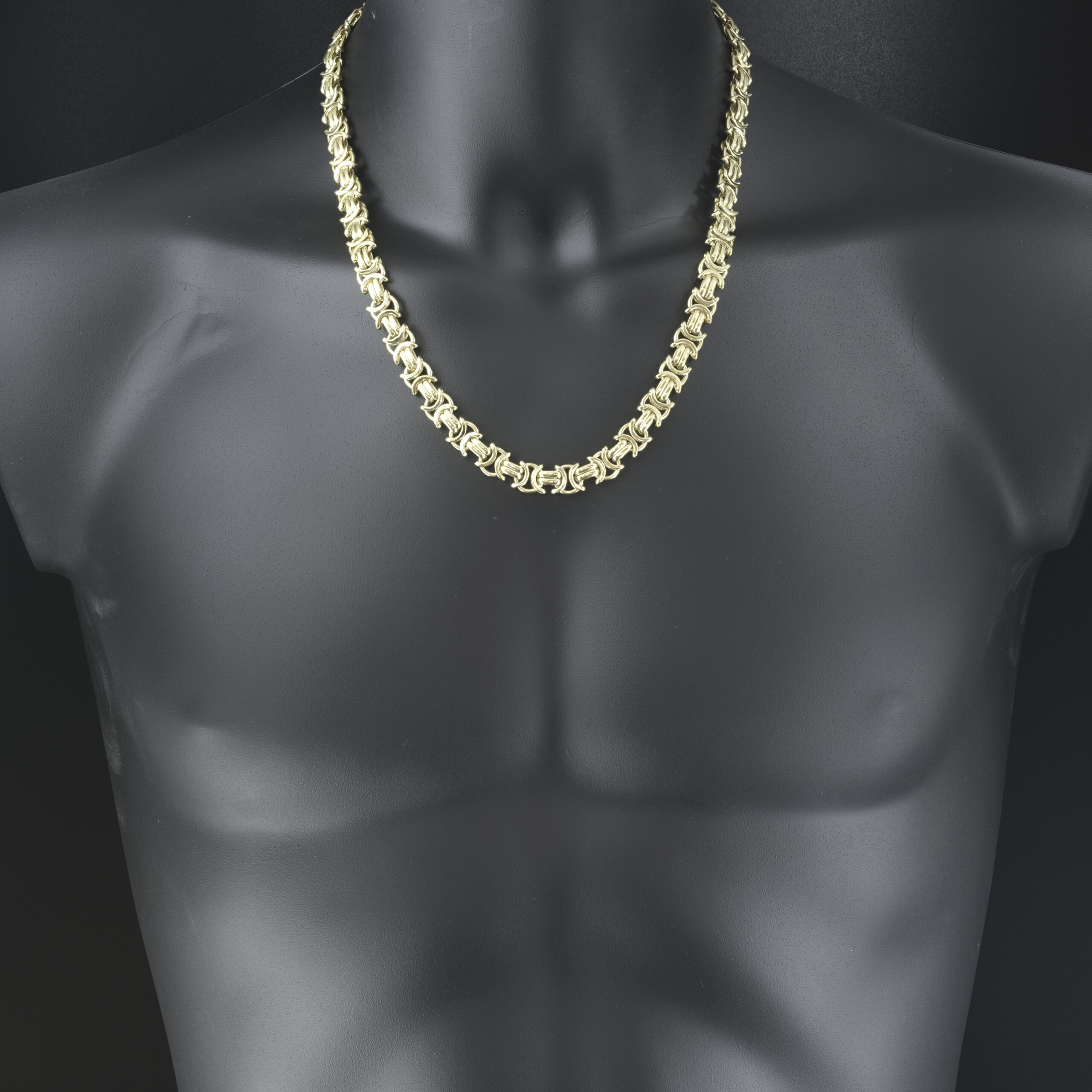 A modern-day European classic design the byzantine is unique and classy. This pre-owned byzantine is made using vacuum casting allowing this hollow byzantine to be lightweight whilst still being strong enough for everyday wear. This byzantine is 22.5 inches in length and 10mm wide fastening with an Albert clasp.