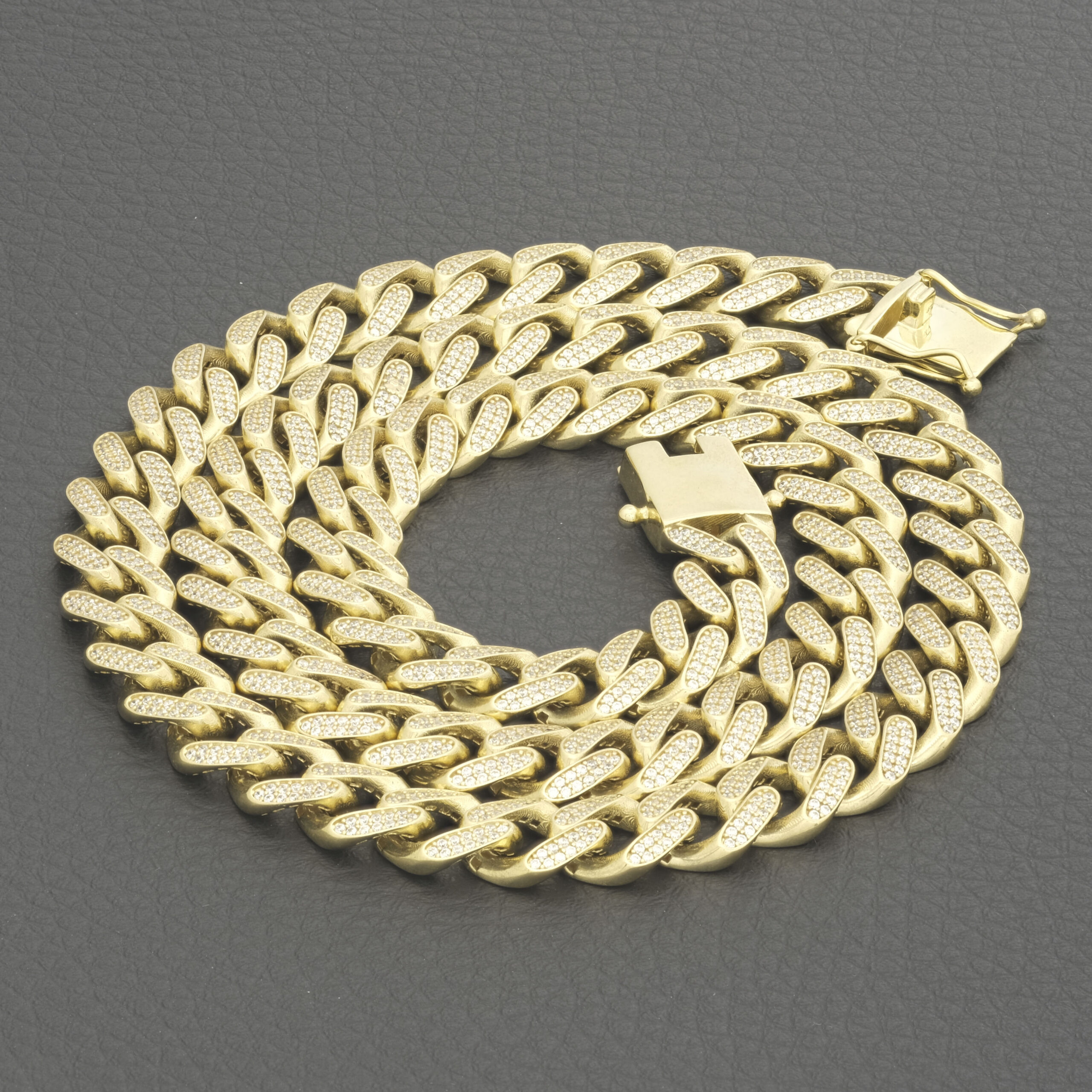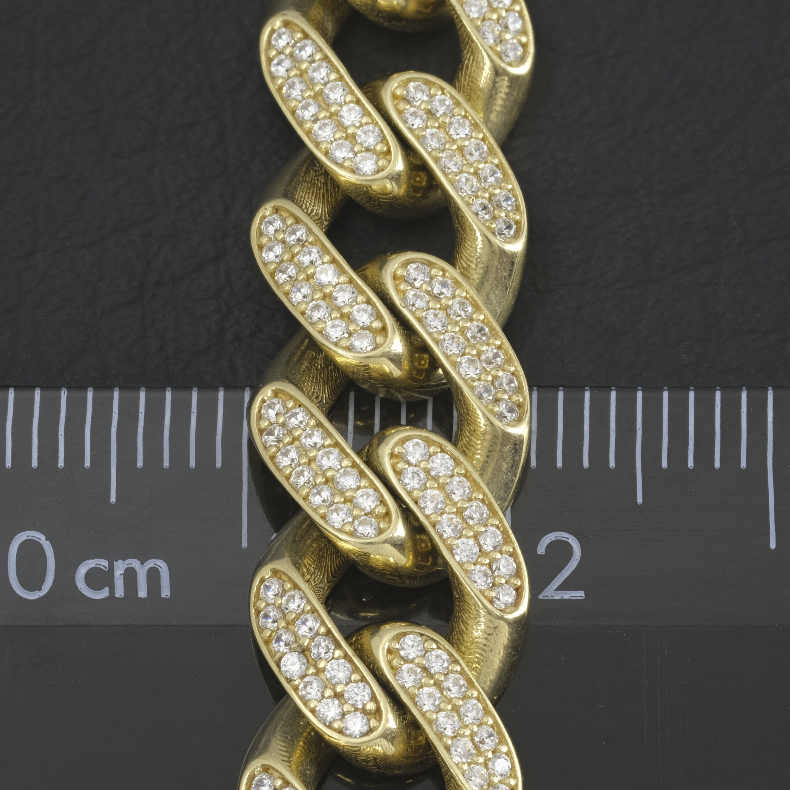 A beautiful, pre-owned hollow gemstone cuban chain made from 9ct yellow gold that is perfect for occasional or everyday wear. This highly polished chain measures 24 inches in length and 10.5mm in width with white gemstones on the links, making it a stylish piece to wear for any occasion. This cuban chain fastens with a box clasp with a tongue for comfort and security.