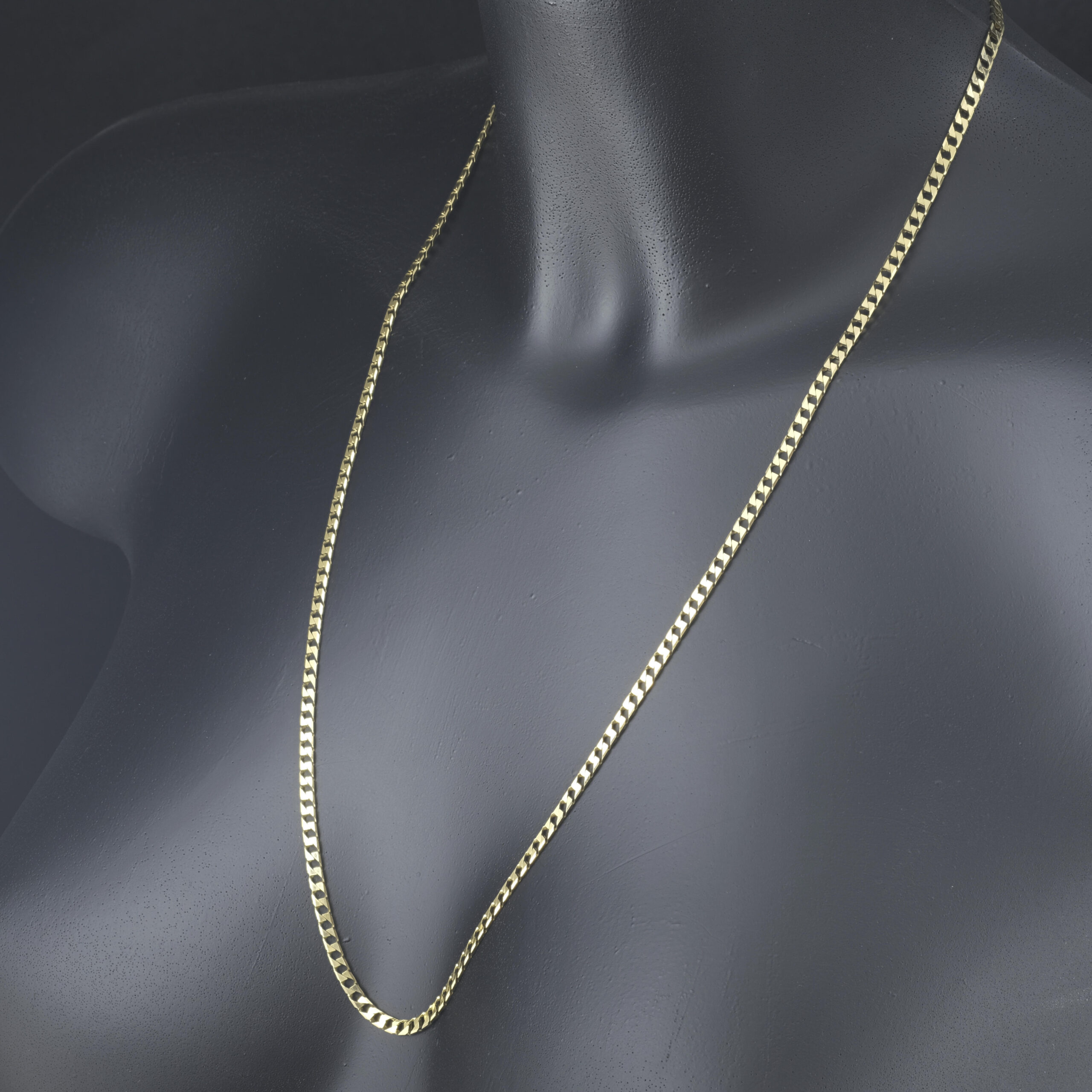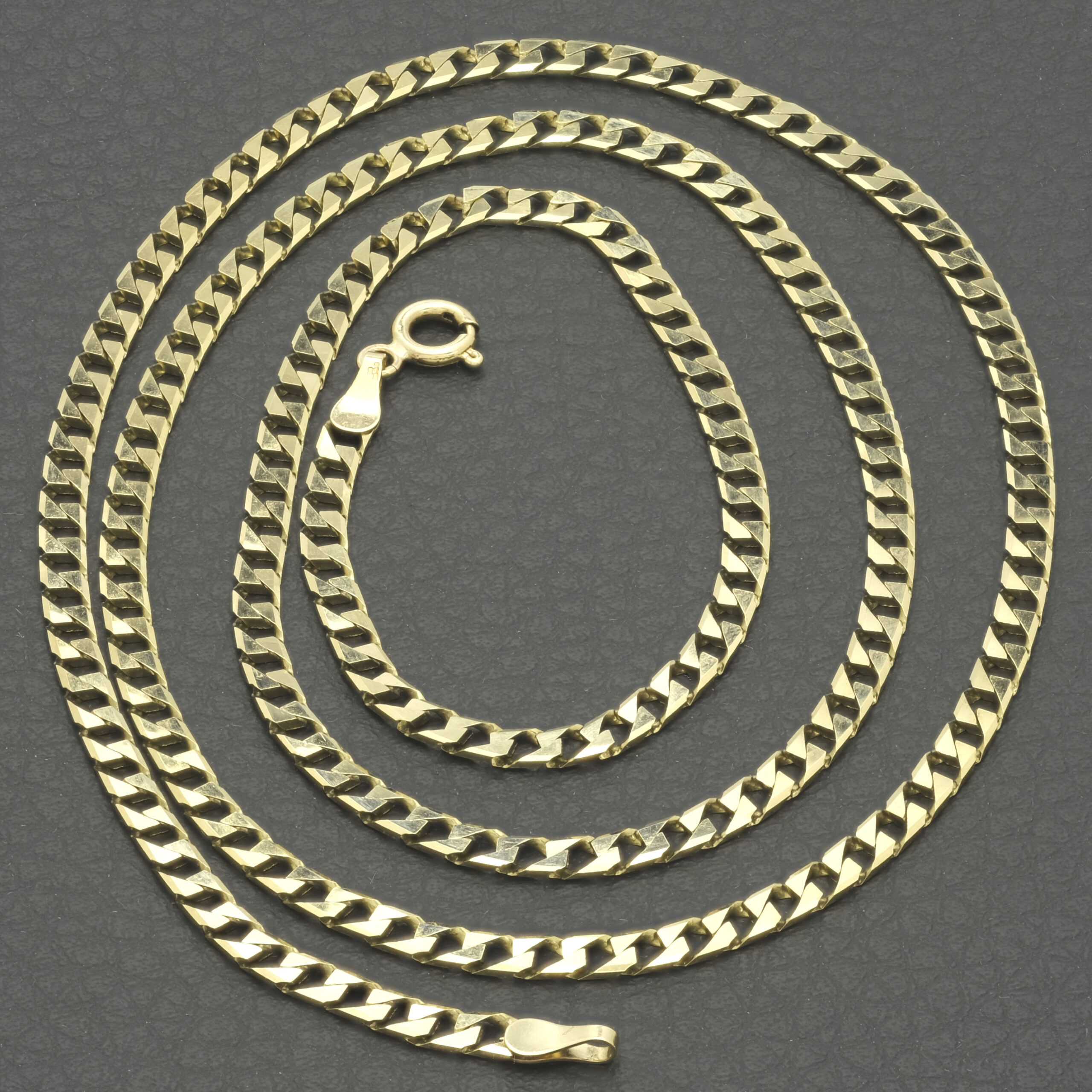 This pre-owned solid gold curb chain is a timeless and versatile piece of jewellery, characterised by its interlocking, uniform links that lie flat against the skin. Known for its durability and sleek design, this curb chain is crafted from 9ct yellow gold, offering a luxurious and polished finish. This curb has a length of 24 inches and a width of 3mm. Its classic style makes it a popular choice for both men and women, whether worn as a standalone statement piece or paired with a pendant. This gold curb chain seamlessly blends elegance with everyday wearability, making it a staple accessory for any jewellery collection. This chain fastens with a bolt ring clasp for comfort and security.