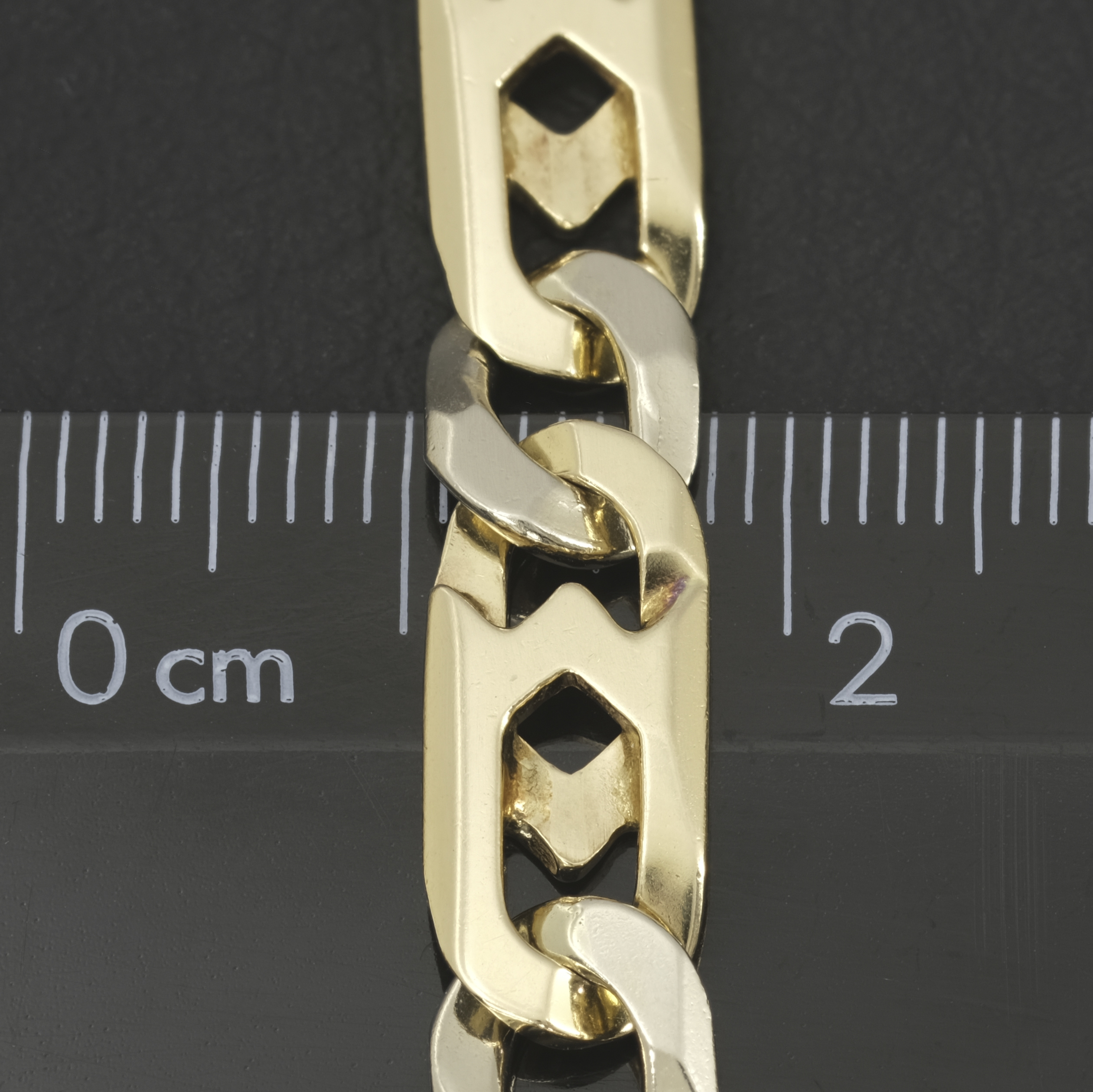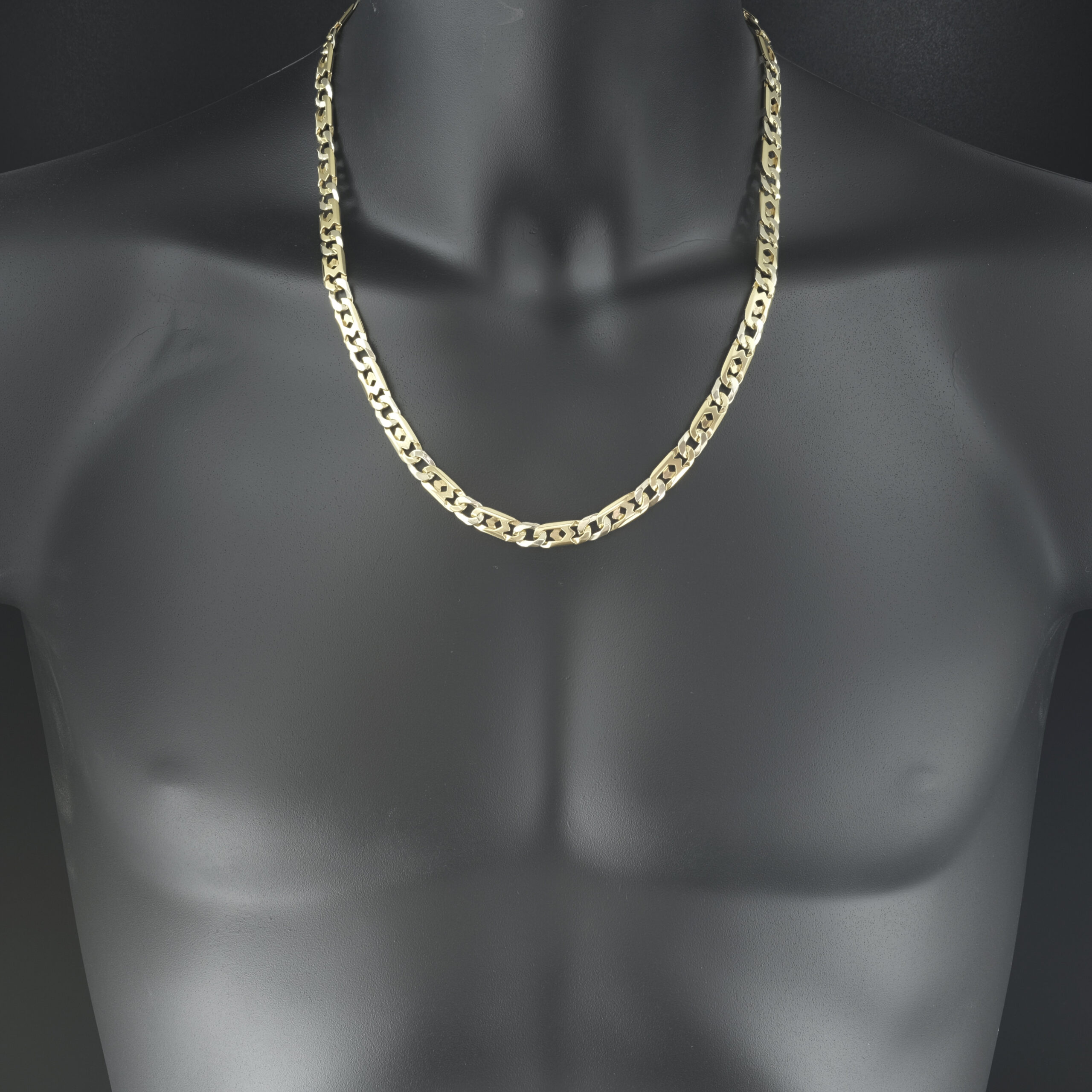 This solid pre-owned fancy figaro chain is crafted from 14ct yellow & white gold, suitable for occasional or everyday wear. It measures 7.5mm in width and 23 inches in length, making it a perfect accessory for any occasion. This chain is beautifully polished and fastens with a lobster claw clasp for secure and comfortable wear.