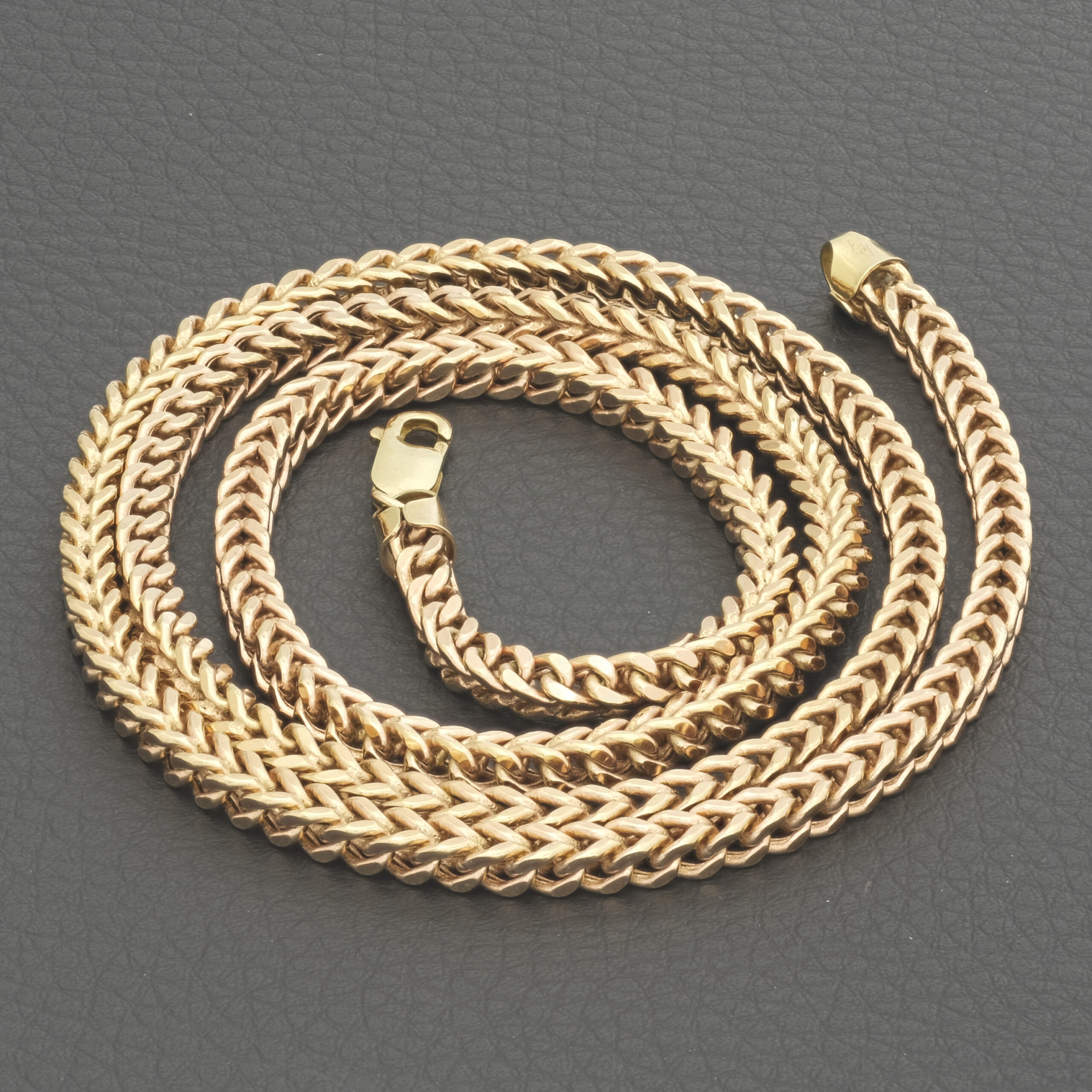 A highly polished, pre-owned hollow franco chain crafted from 9ct rose gold. This franco chain would be perfect to hang a pendant from or wear as a stand-alone piece, this chain measures 27.5 inches in length and 4mm in width. This franco chain fastens with an Lobster clasp for comfortable wear.