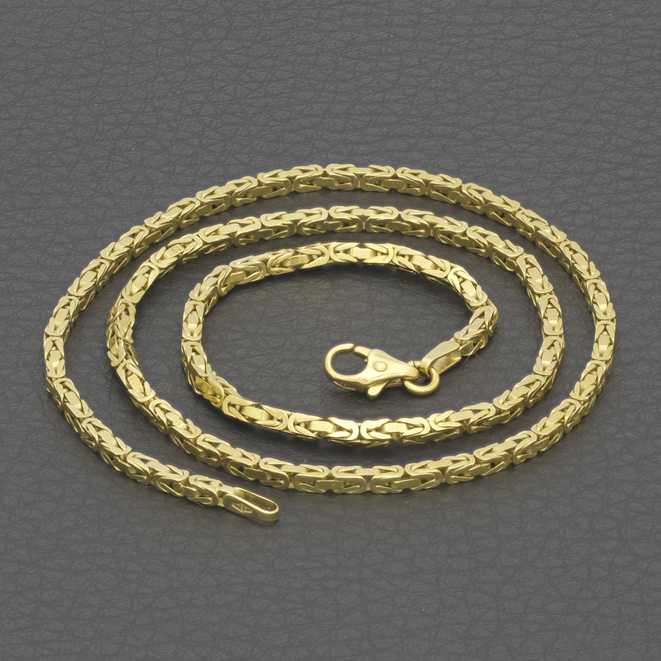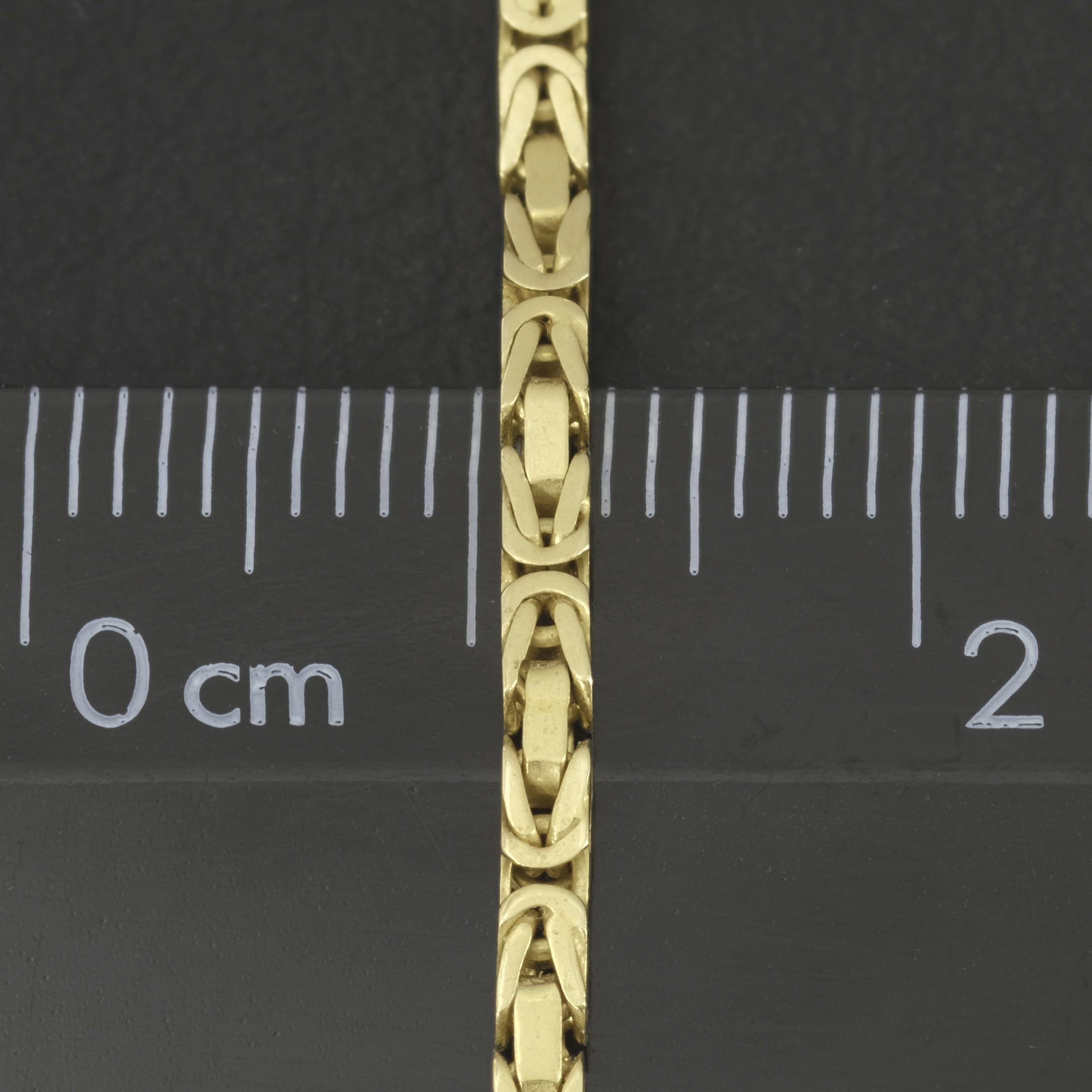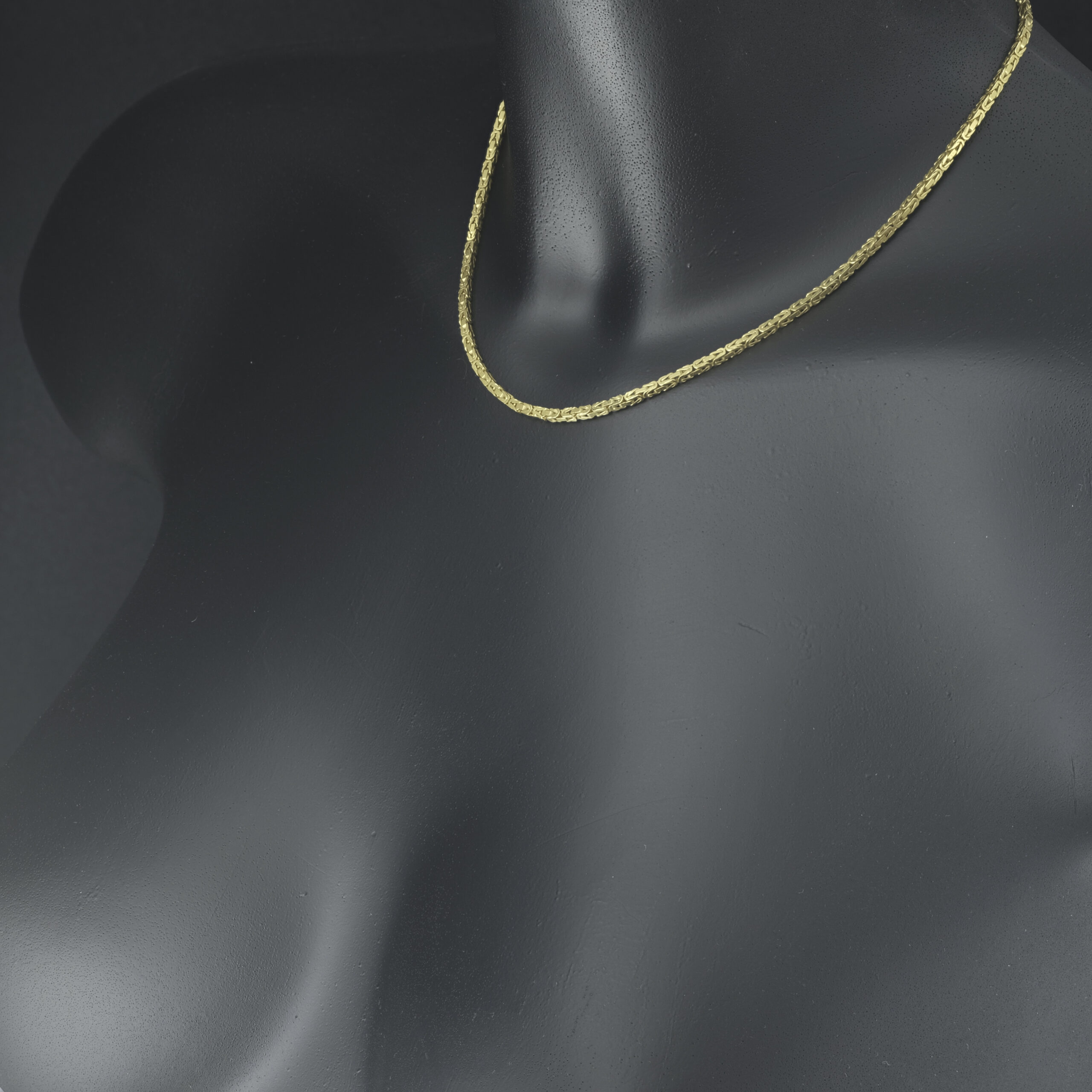 This pre-owned solid 18ct yellow gold king chain, is a luxurious and intricate jewellery design that exudes elegance and sophistication. Characterized by its unique interlocking pattern, the chain features a series of meticulously woven links that create a textured, rope-like appearance. This king chain measures at 15.5 inches in length and 2mm in width. This king fastens with a lobster claw clasp for comfort and security.