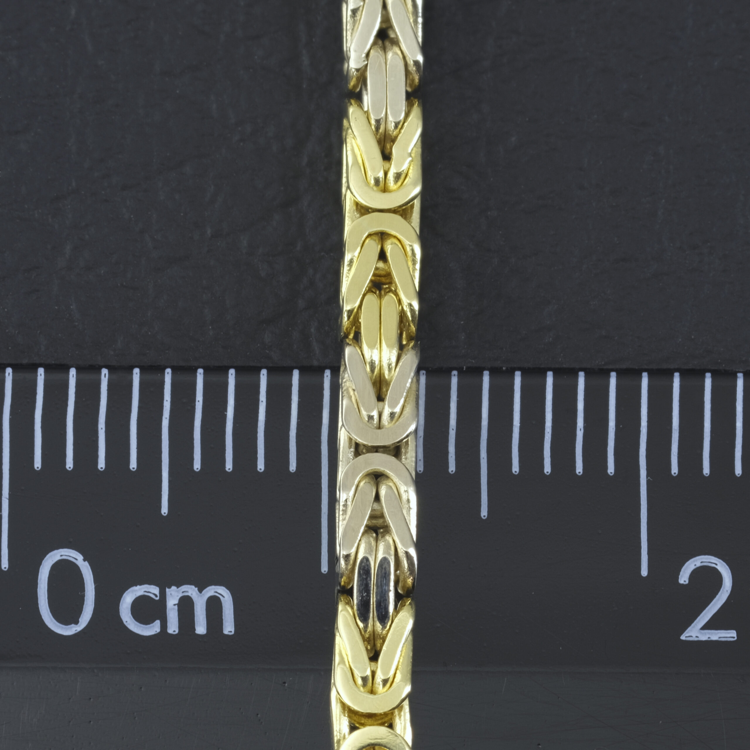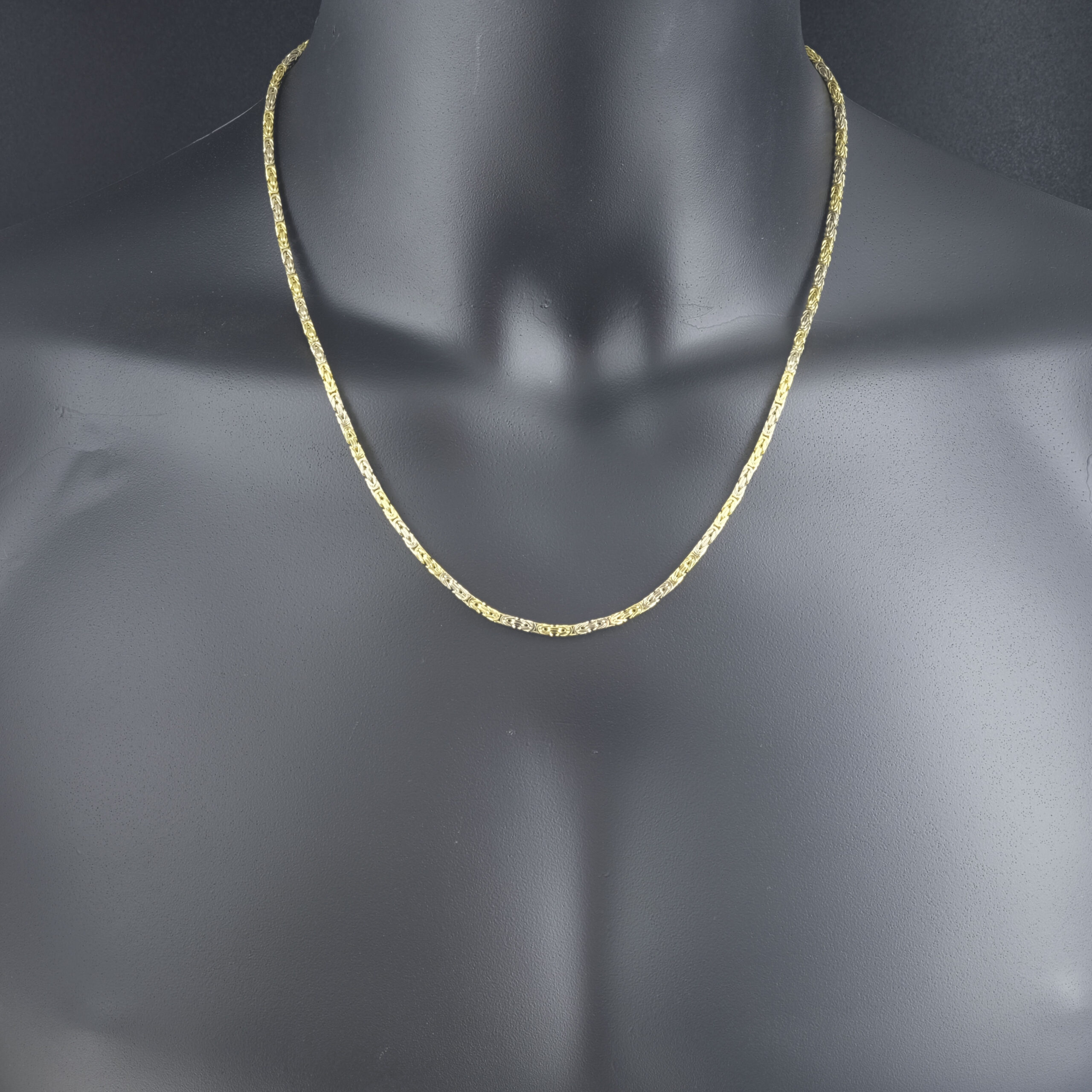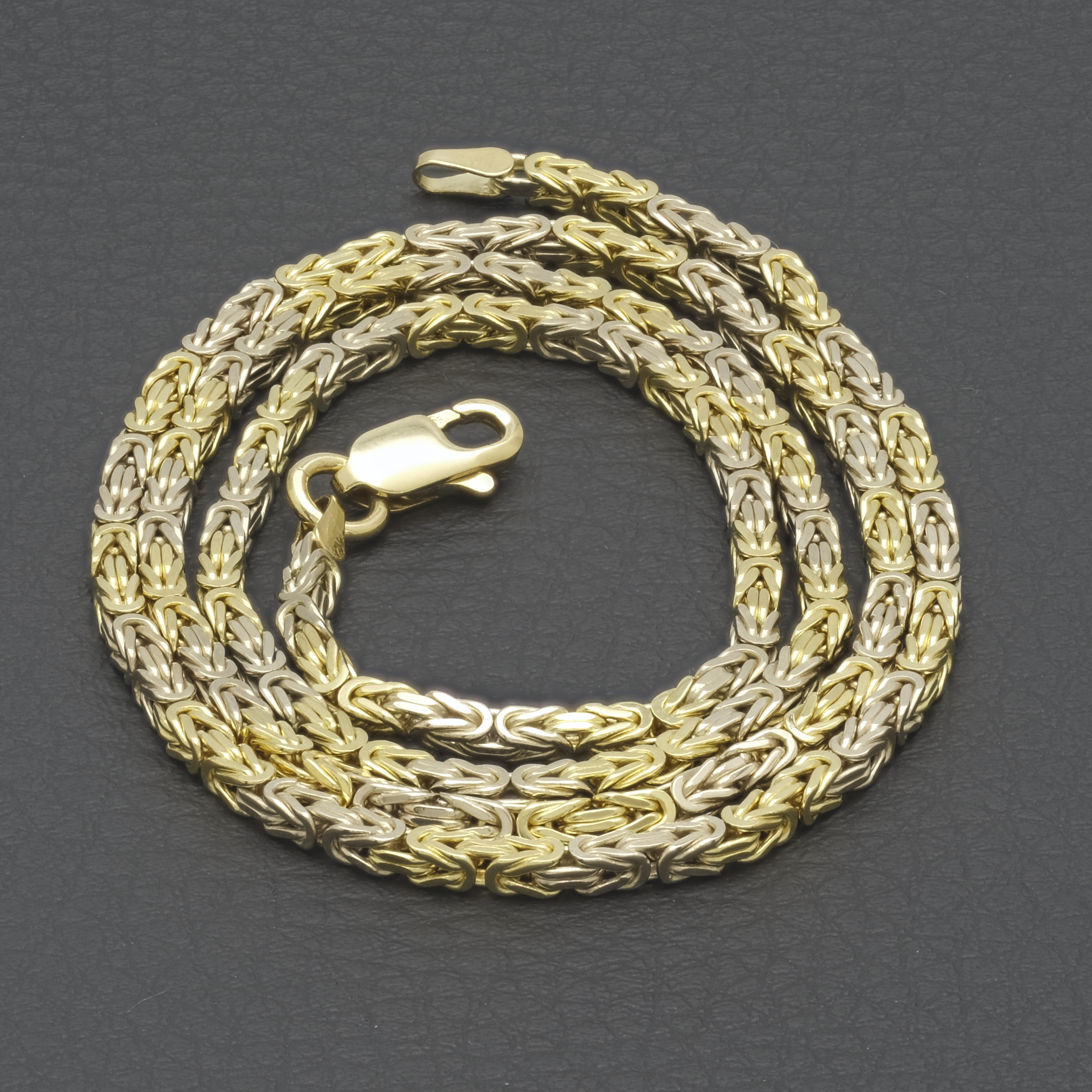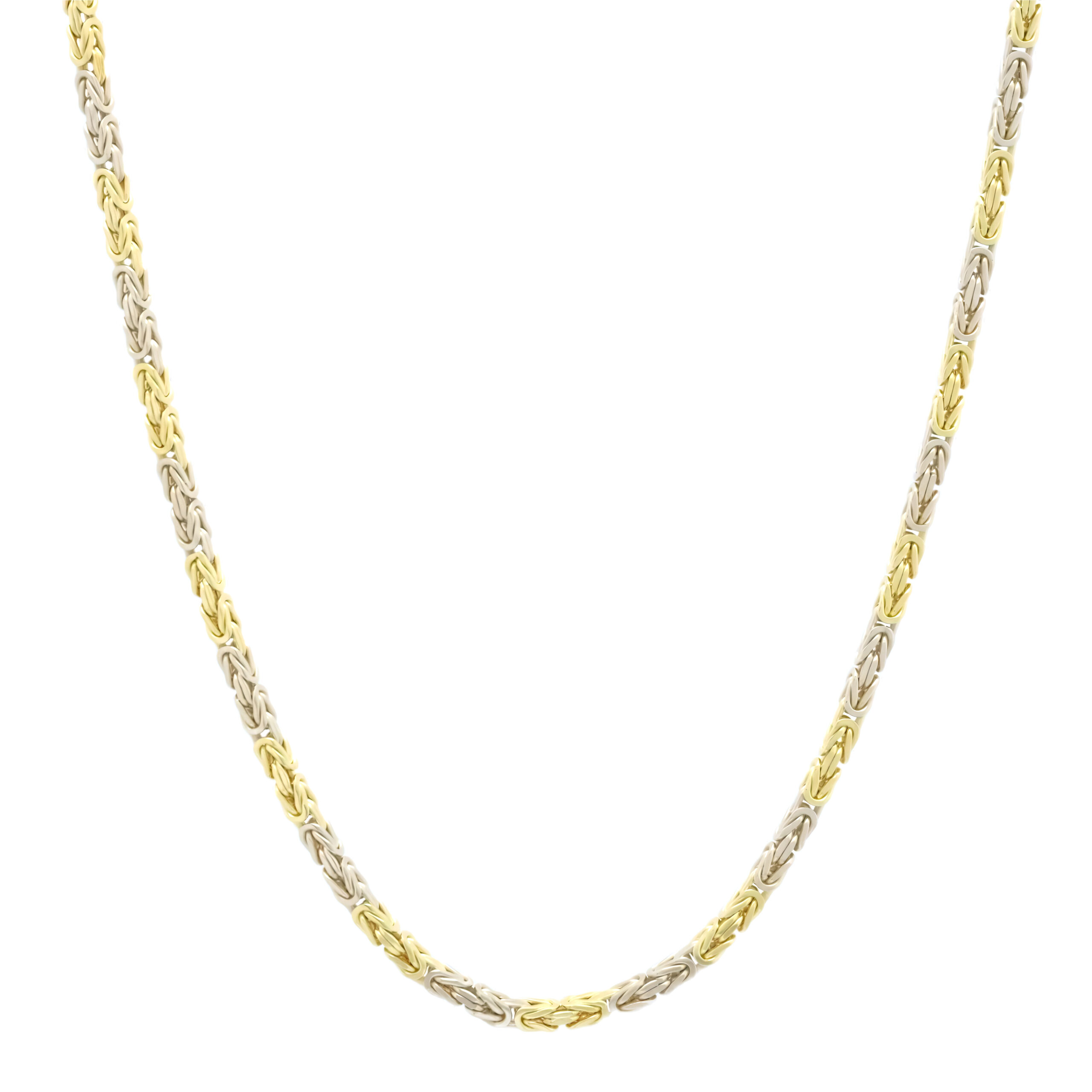 This pre-owned solid 18ct yellow & white gold king chain, is a luxurious and intricate jewellery design that exudes elegance and sophistication. Characterized by its unique interlocking pattern, the chain features a series of meticulously woven links that create a textured, rope-like appearance. This king chain measures at 21.5 inches in length and 2.5mm in width. This king fastens with a lobster claw clasp for comfort and security.