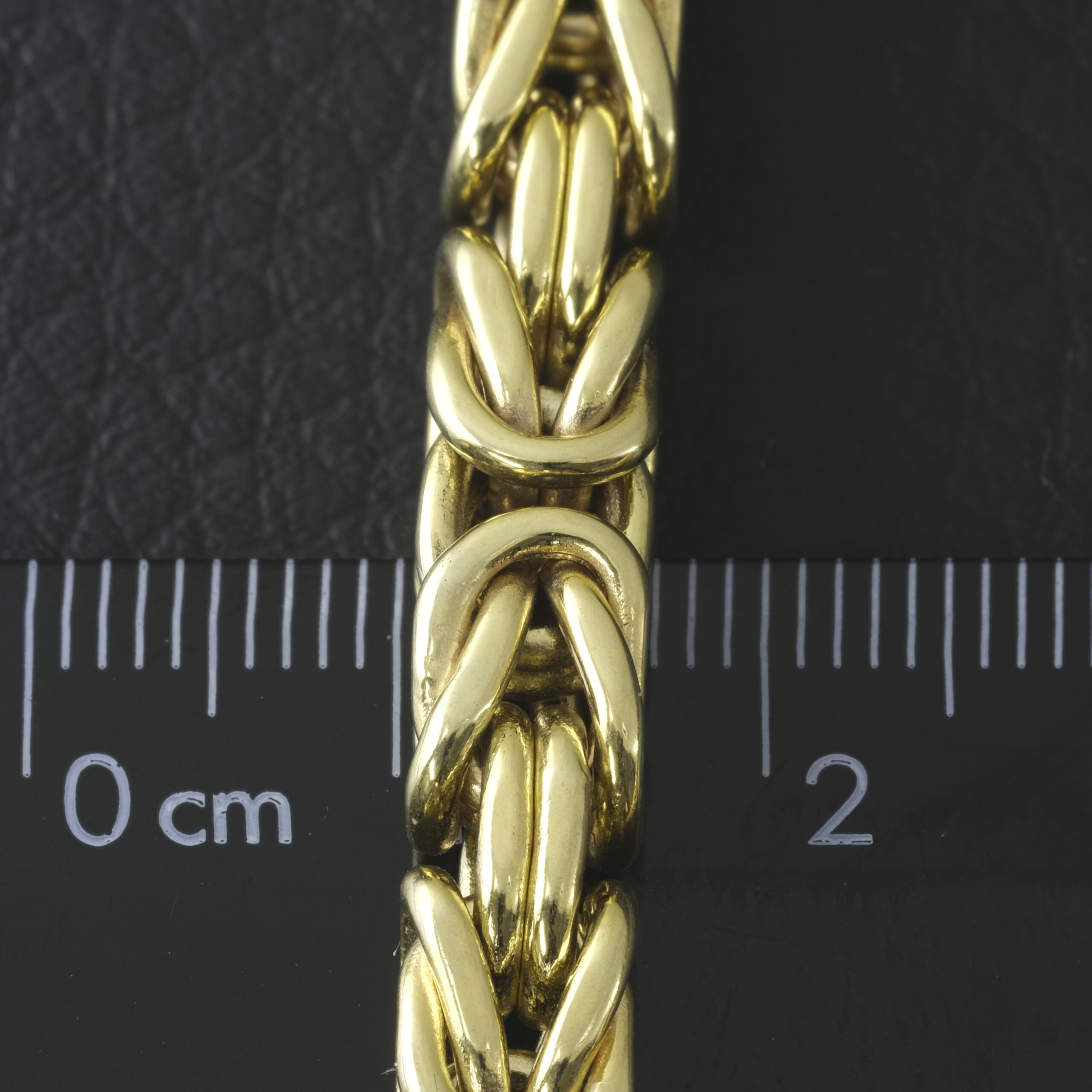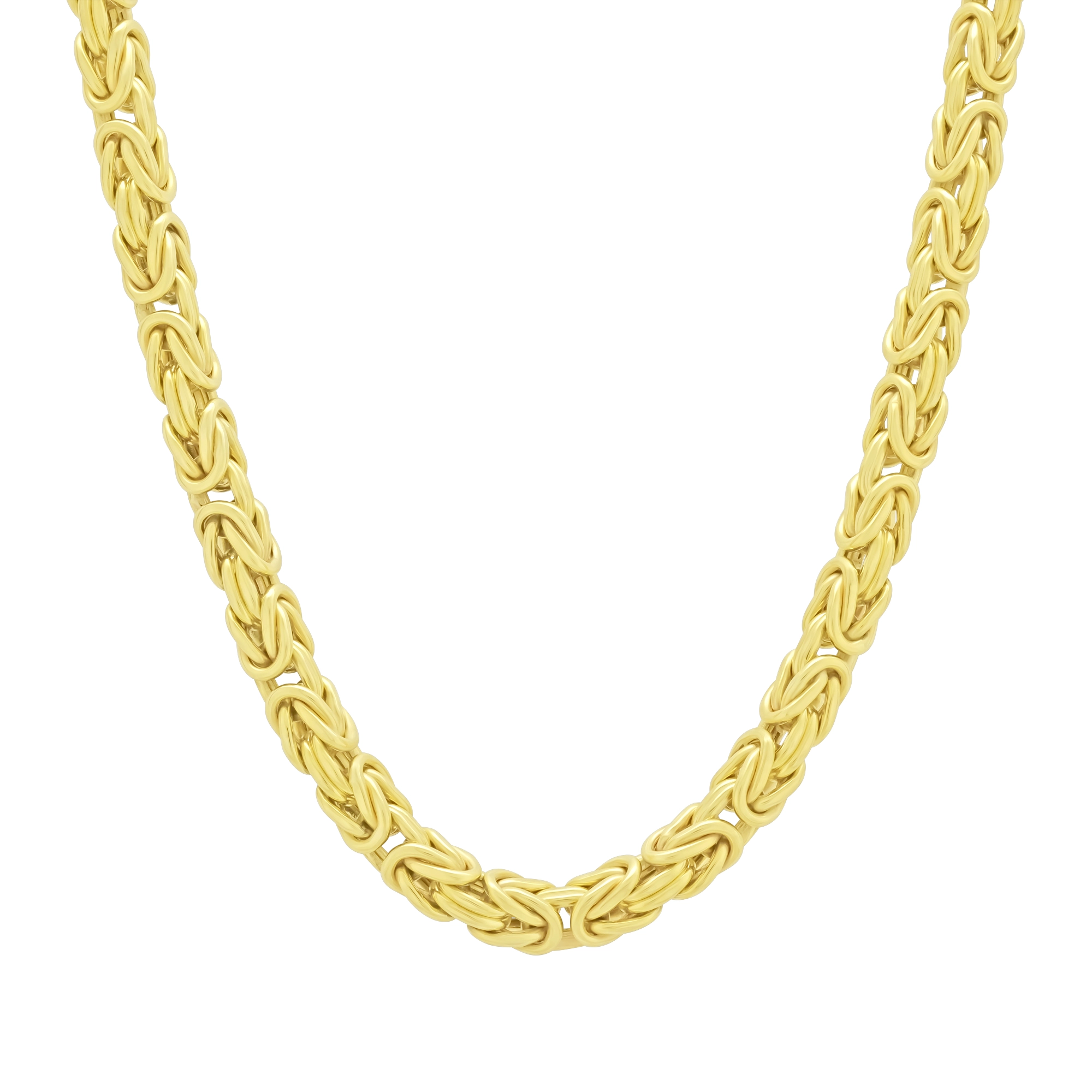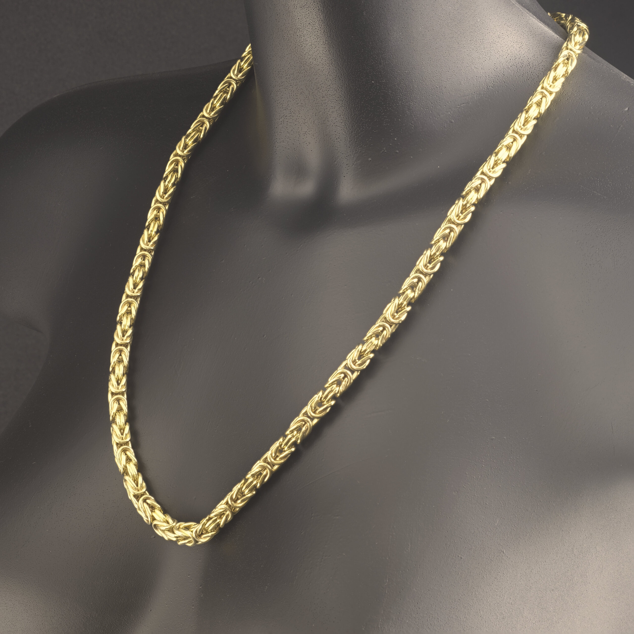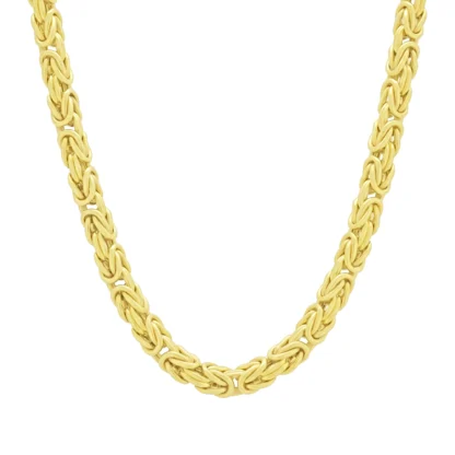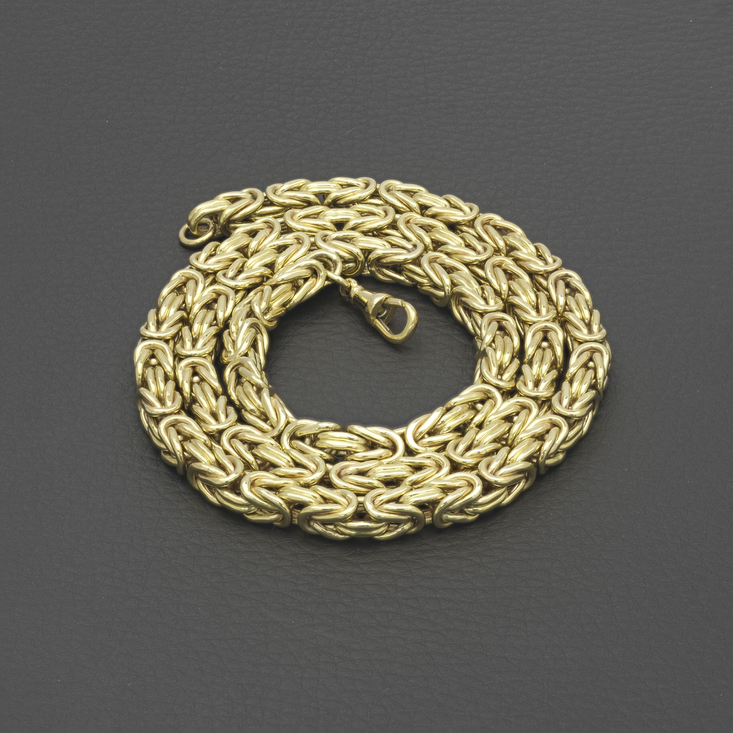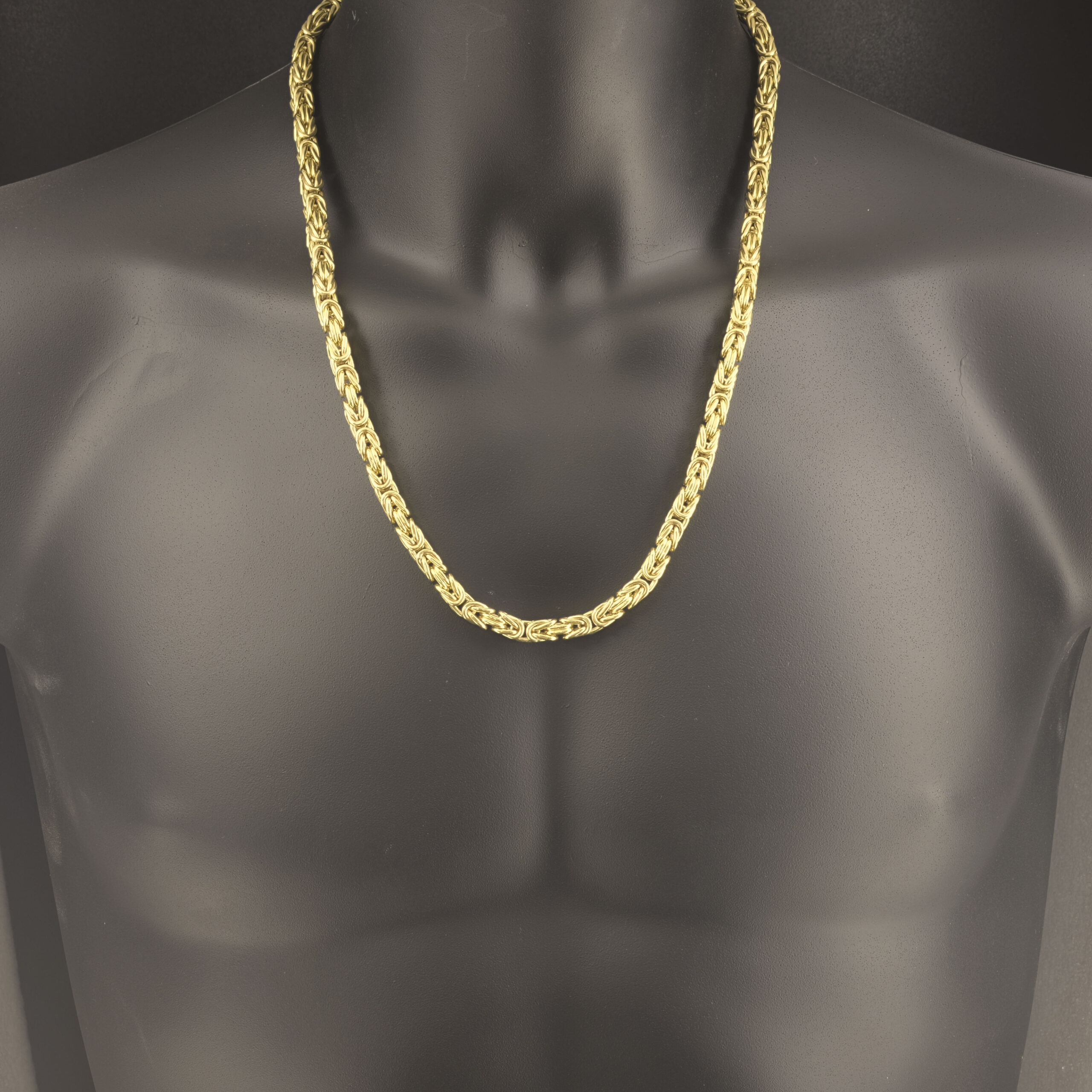 This pre-owned solid 9ct yellow gold King chain, is a luxurious and intricate jewellery design that exudes elegance and sophistication. Characterised by its unique interlocking pattern, the chain features a series of meticulously woven links that create a textured, rope-like appearance. This king chain measures at 24 inches in length and 6.5mm in width. This king fastens with a albert claw clasp for comfort and security.