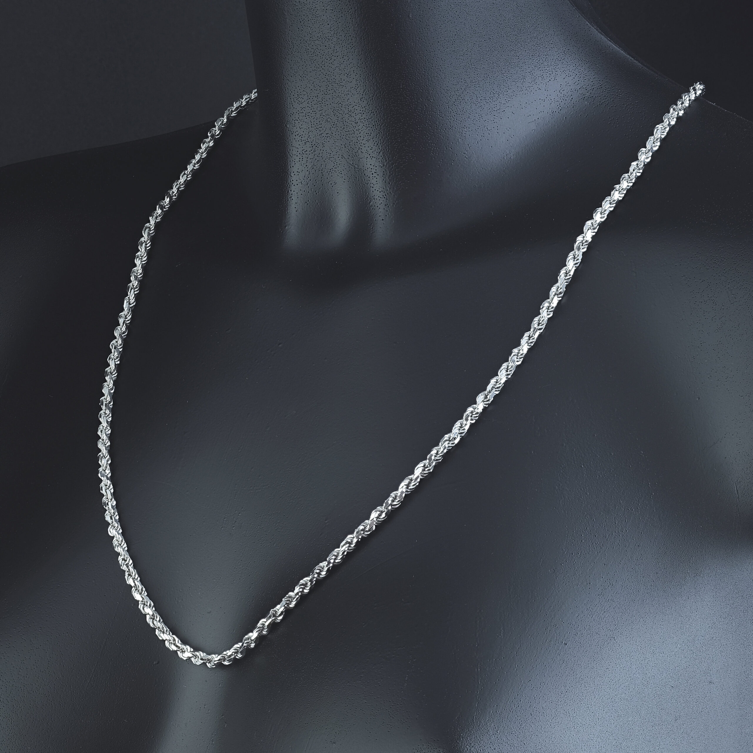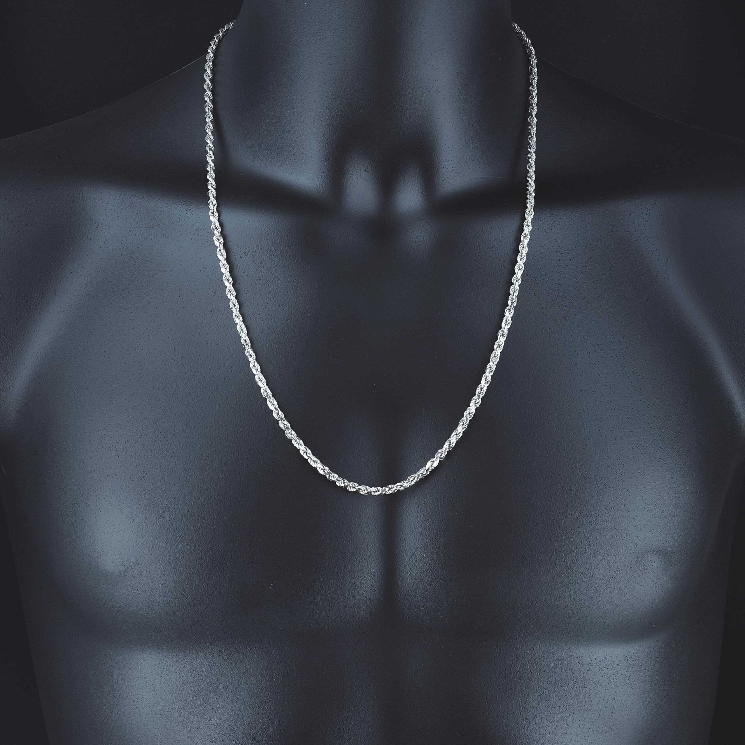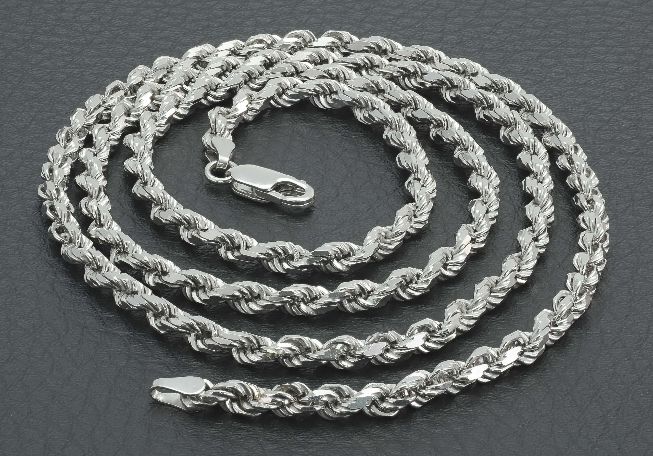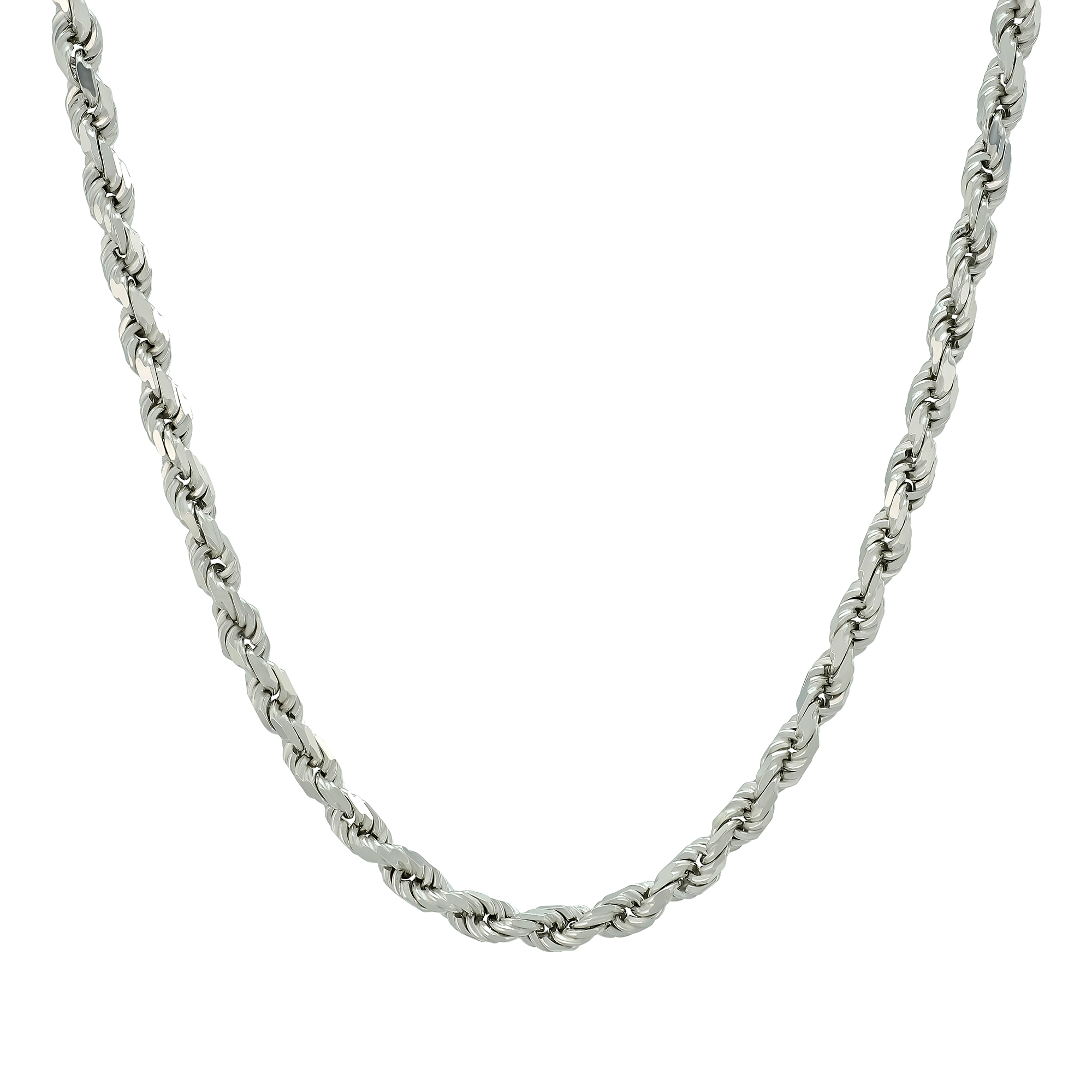 A stylish, pre-owned 9ct white gold rope chain that is perfect for occasional or everyday wear. This rope measures 26inches in length and 4mm in width, this chain fastens with a lobster claw clasp for secure and comfortable wear.