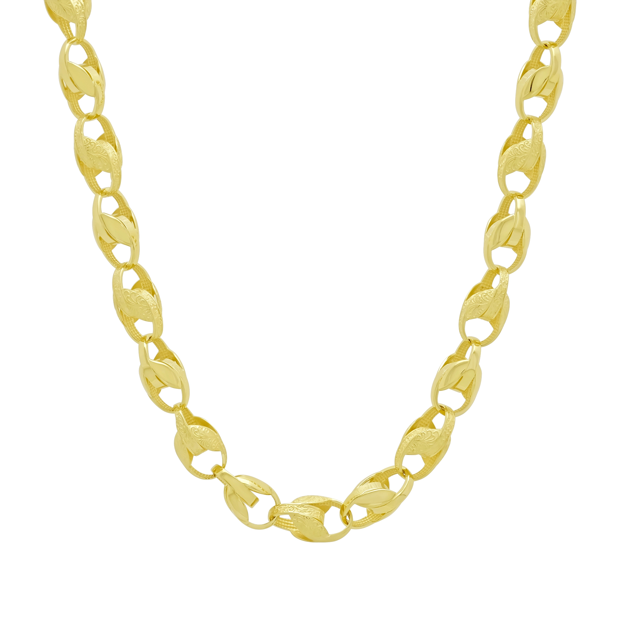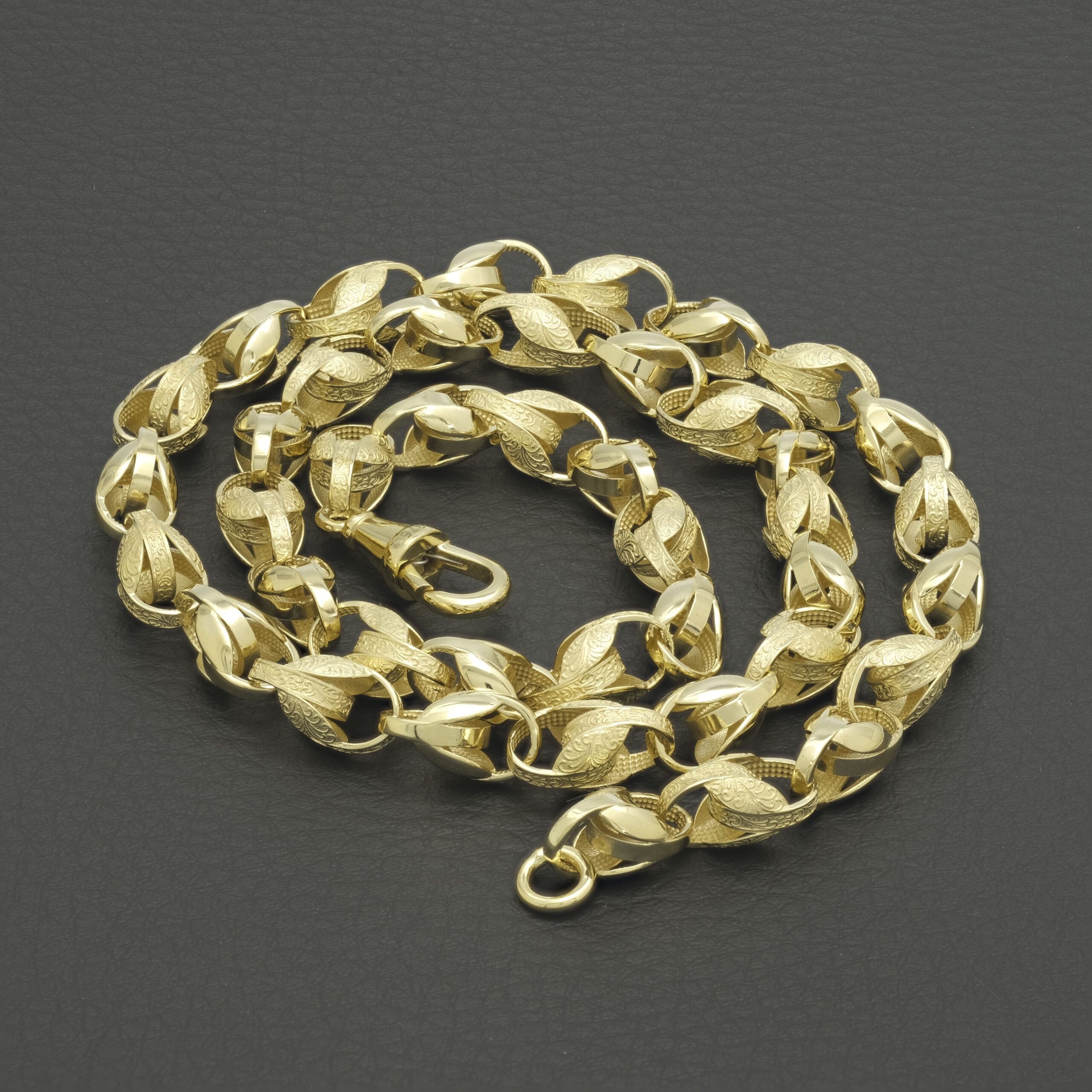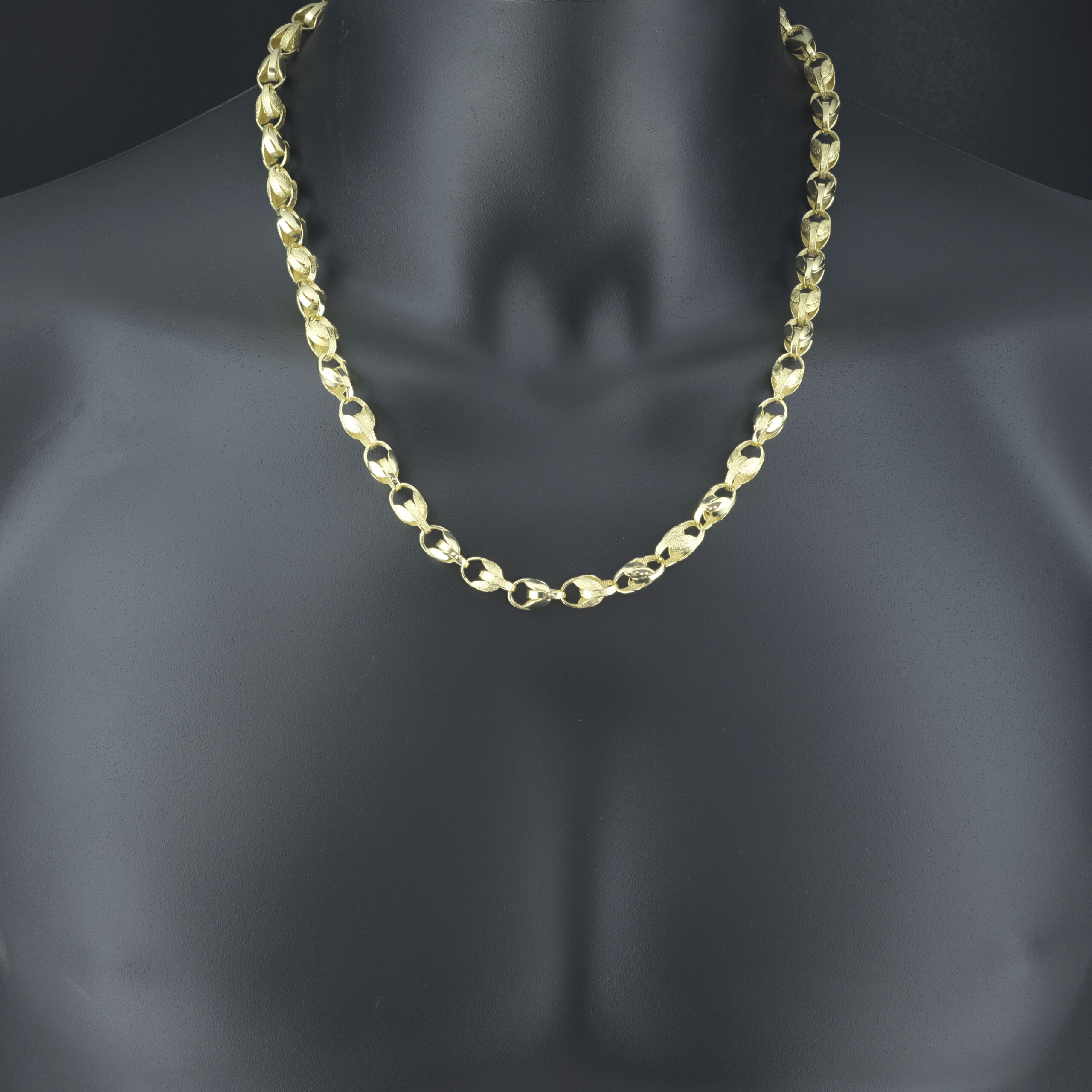 A solid pre-owned, beautifully polished solid 9ct yellow gold tulip chain is great for occasional or everyday wear. Each link alternates from plain to patterned for a classic look. This chain measures 7.5mm in width and 22 inches in length, securing with an Albert clasp for comfortable wear.