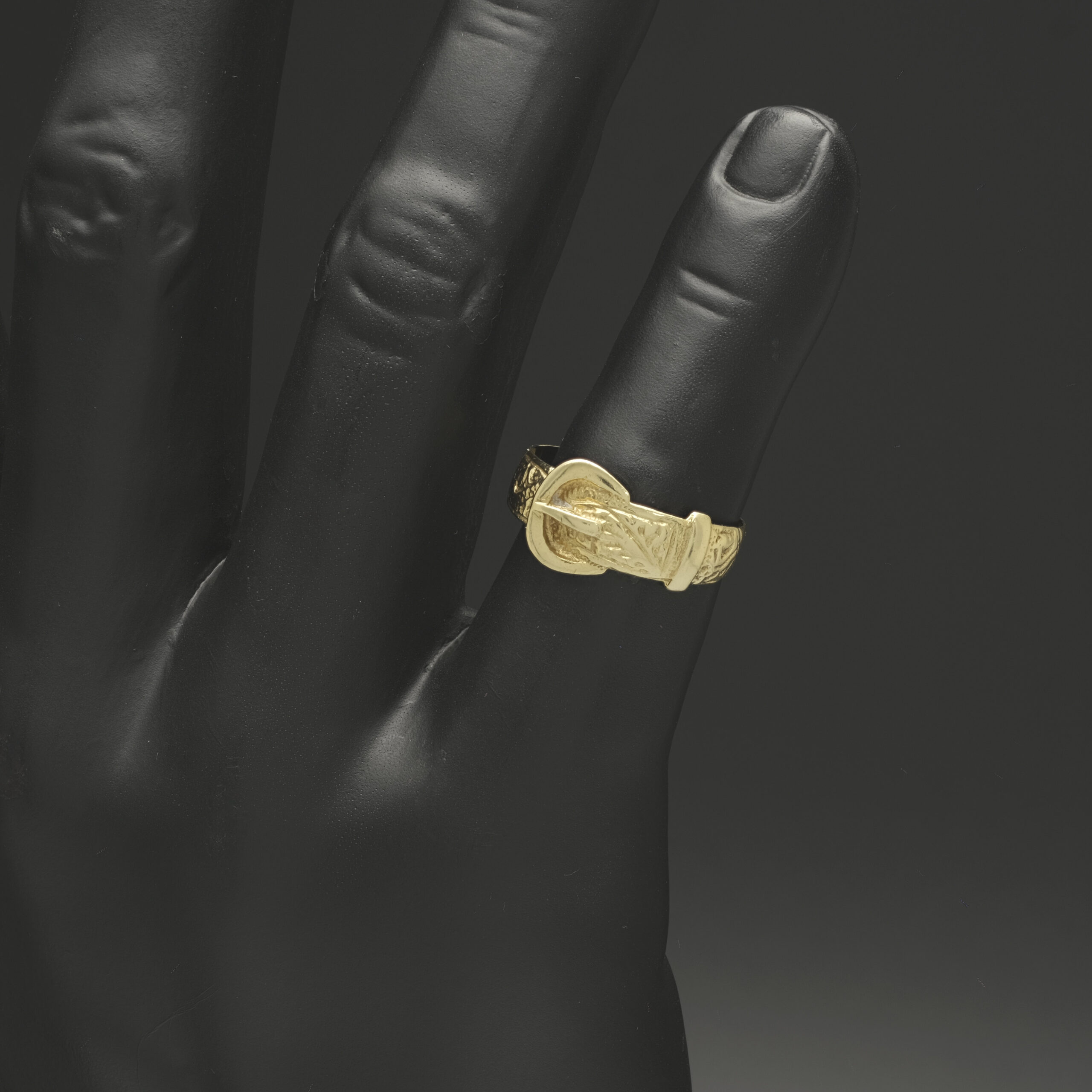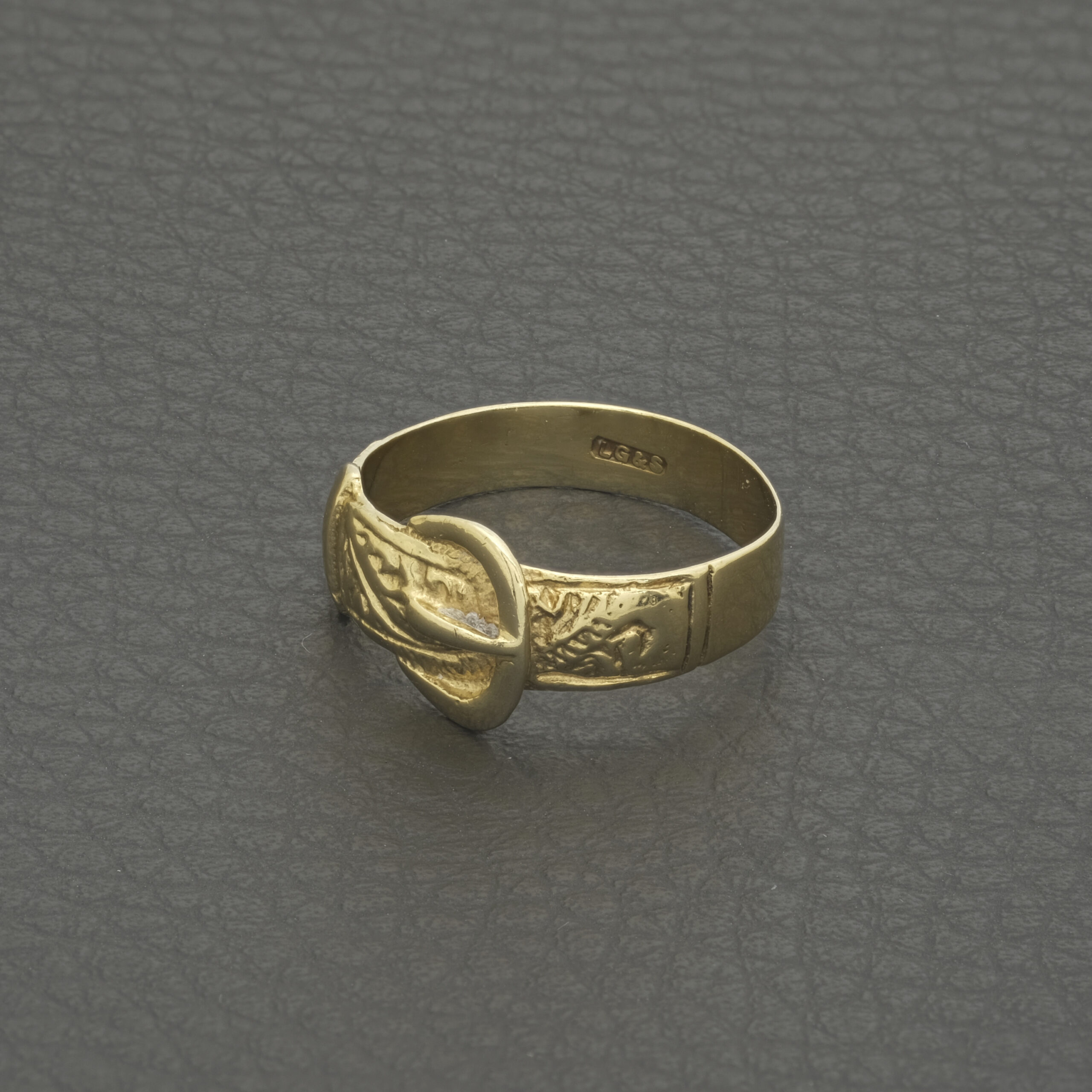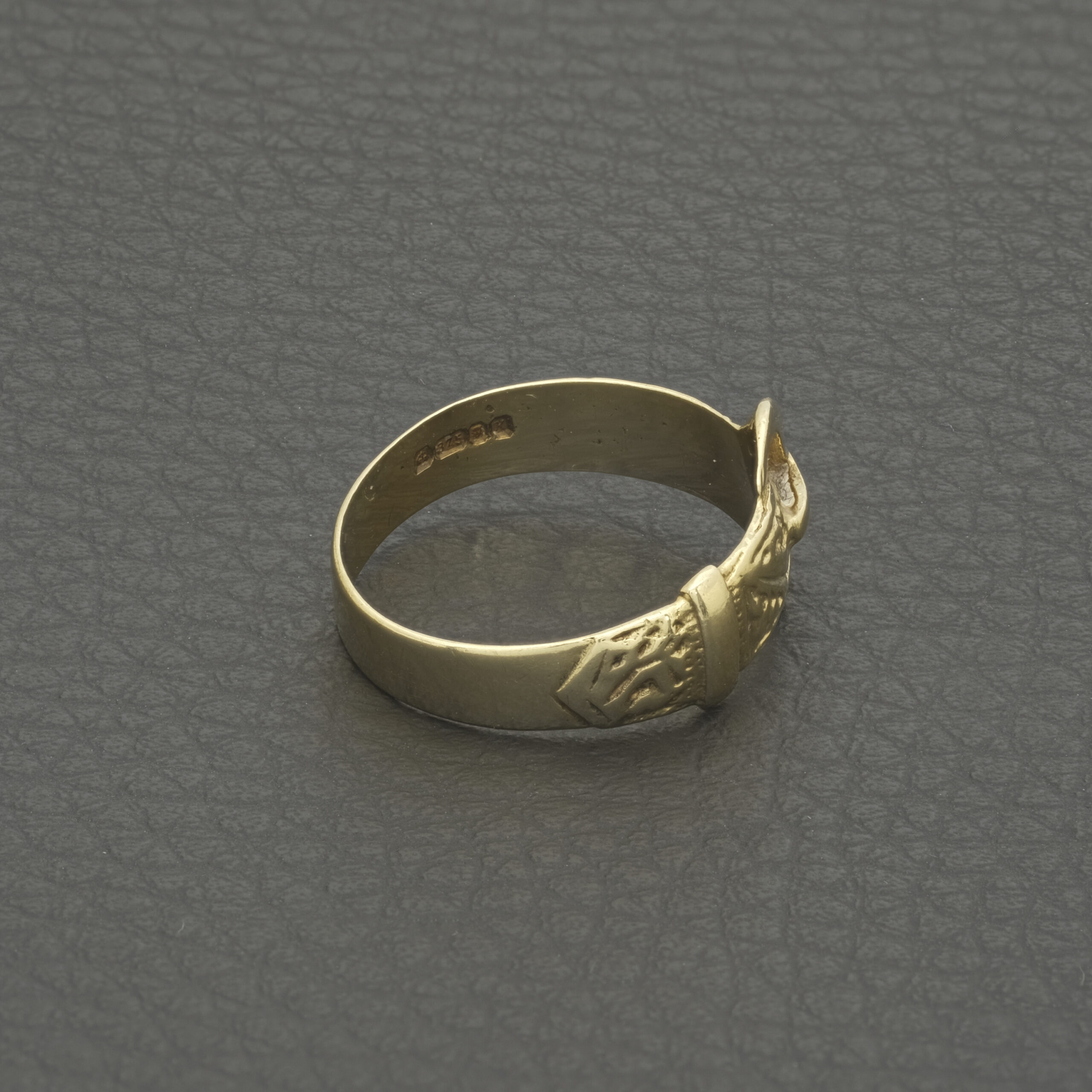 A stylish, pre-owned 9ct yellow gold buckle ring. This timeless buckle ring is a ring that goes with all outfits. Made from solid 9ct yellow gold, this ring has strength for everyday wear. Featuring a single plain buckle and a patterned band this ring is a classic look.