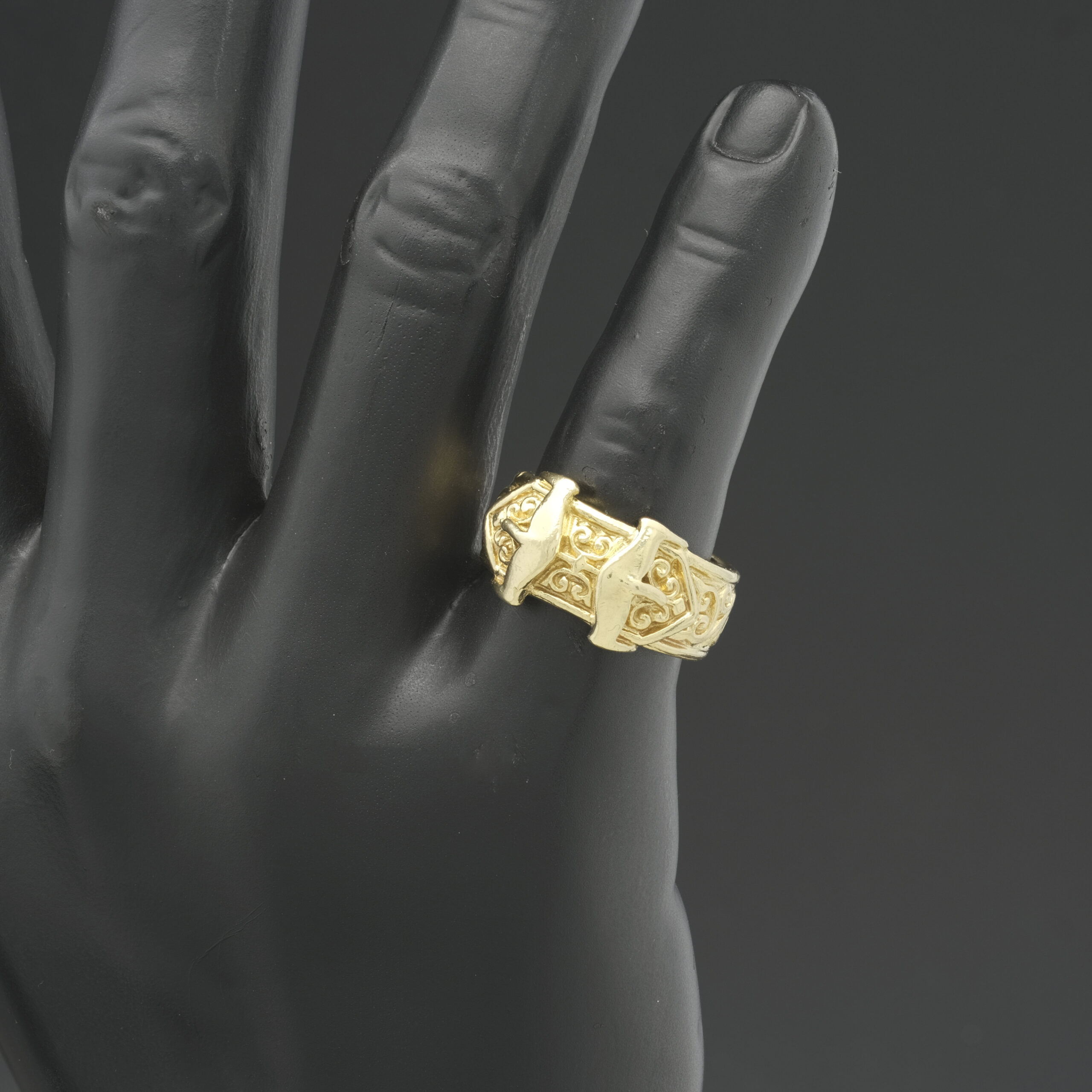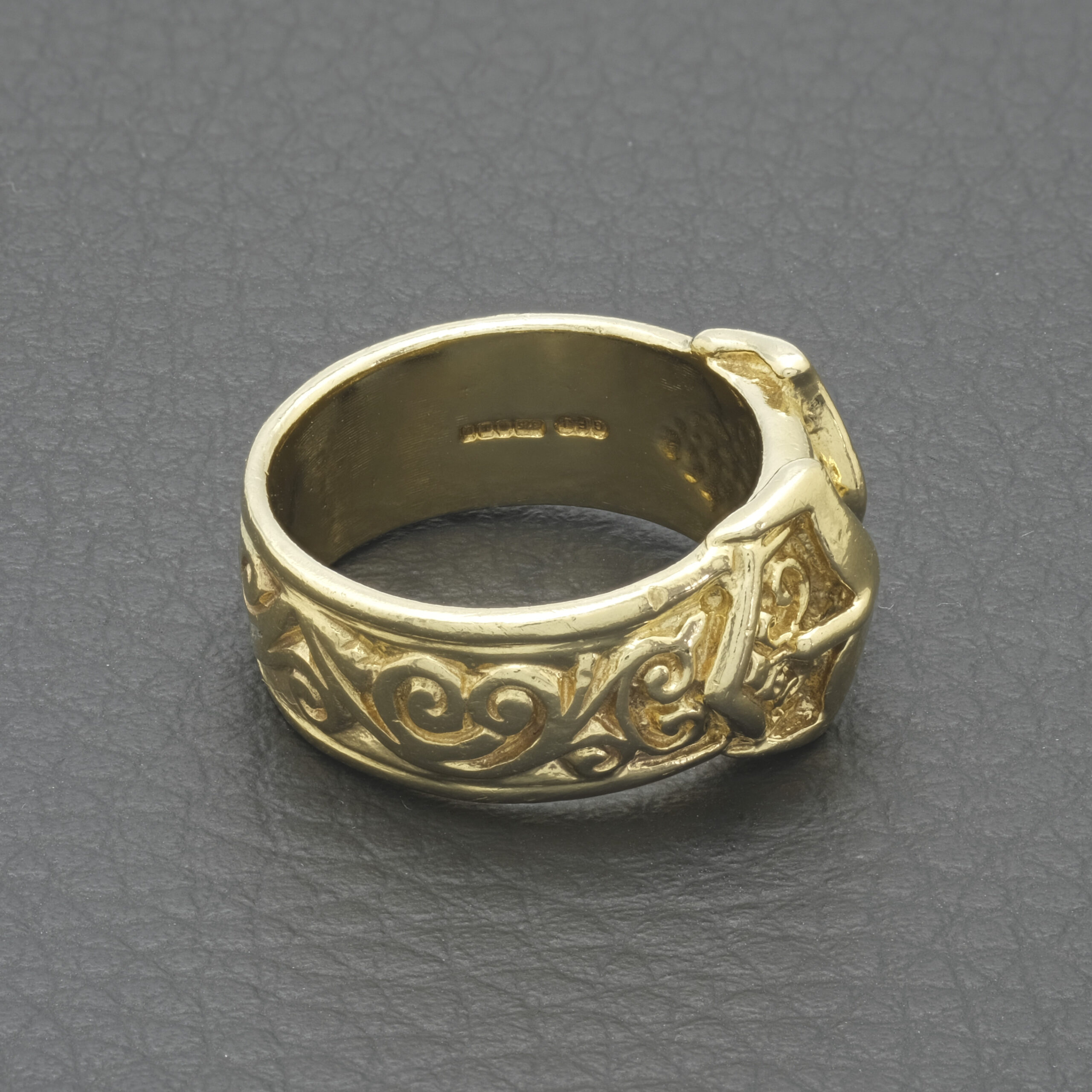 A stylish, pre-owned 9ct yellow gold buckle ring. This timeless buckle ring is a ring that goes with all outfits. Made from solid 9ct yellow gold, this ring has strength for everyday wear. Featuring a double plain buckle and a patterned band this ring is a classic look.