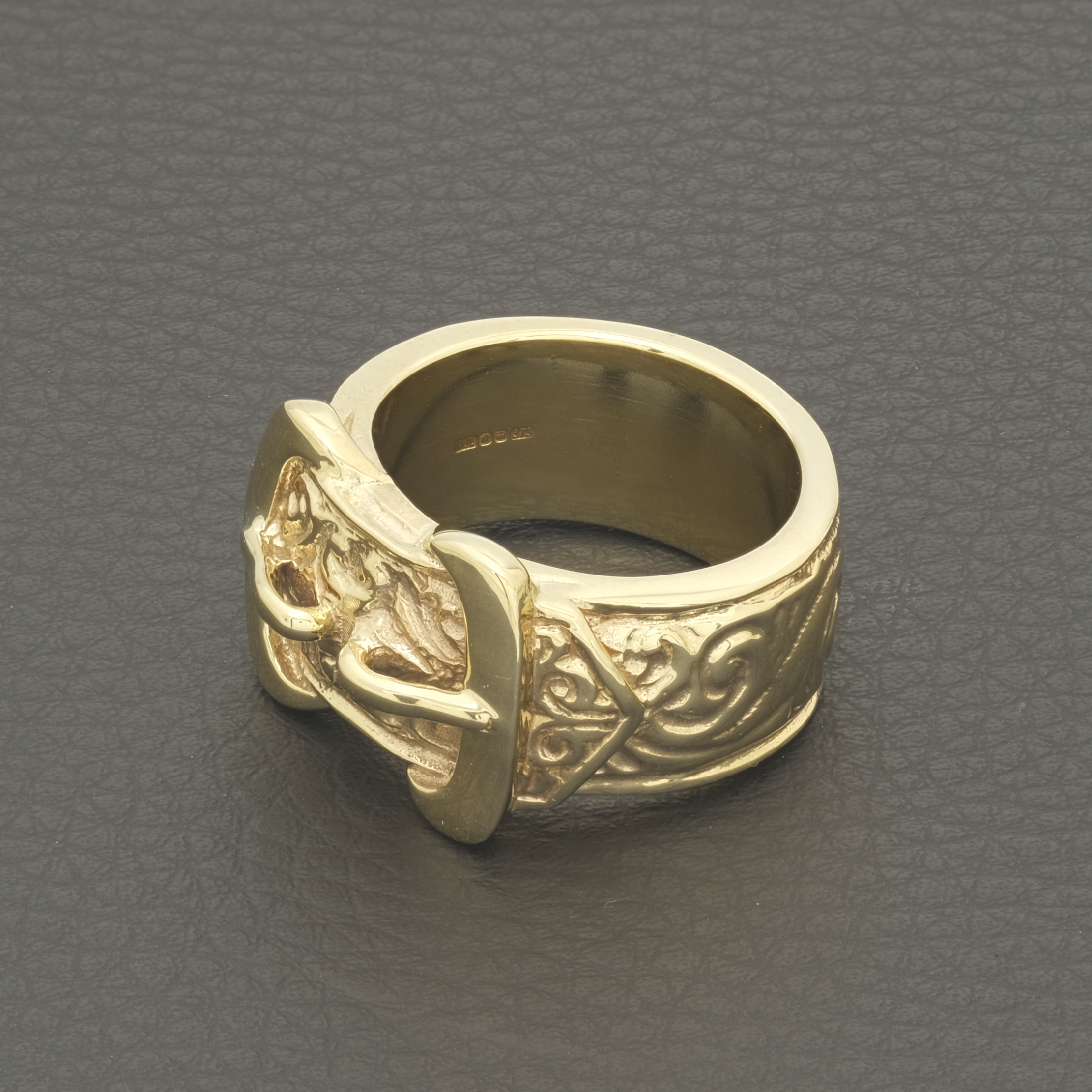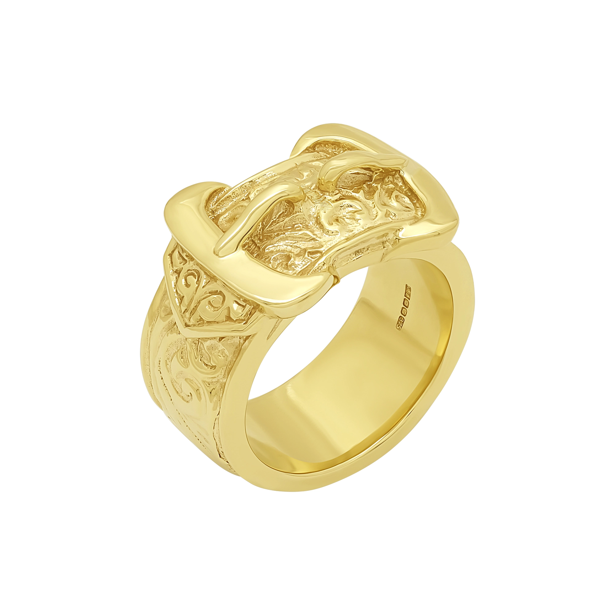A stylish, pre-owned 9ct yellow gold buckle ring. This timeless buckle ring is a ring that goes with all outfits. Made from solid 9ct yellow gold, this ring has strength for everyday wear. Featuring a double plain buckle and a patterned band this ring is a classic look.