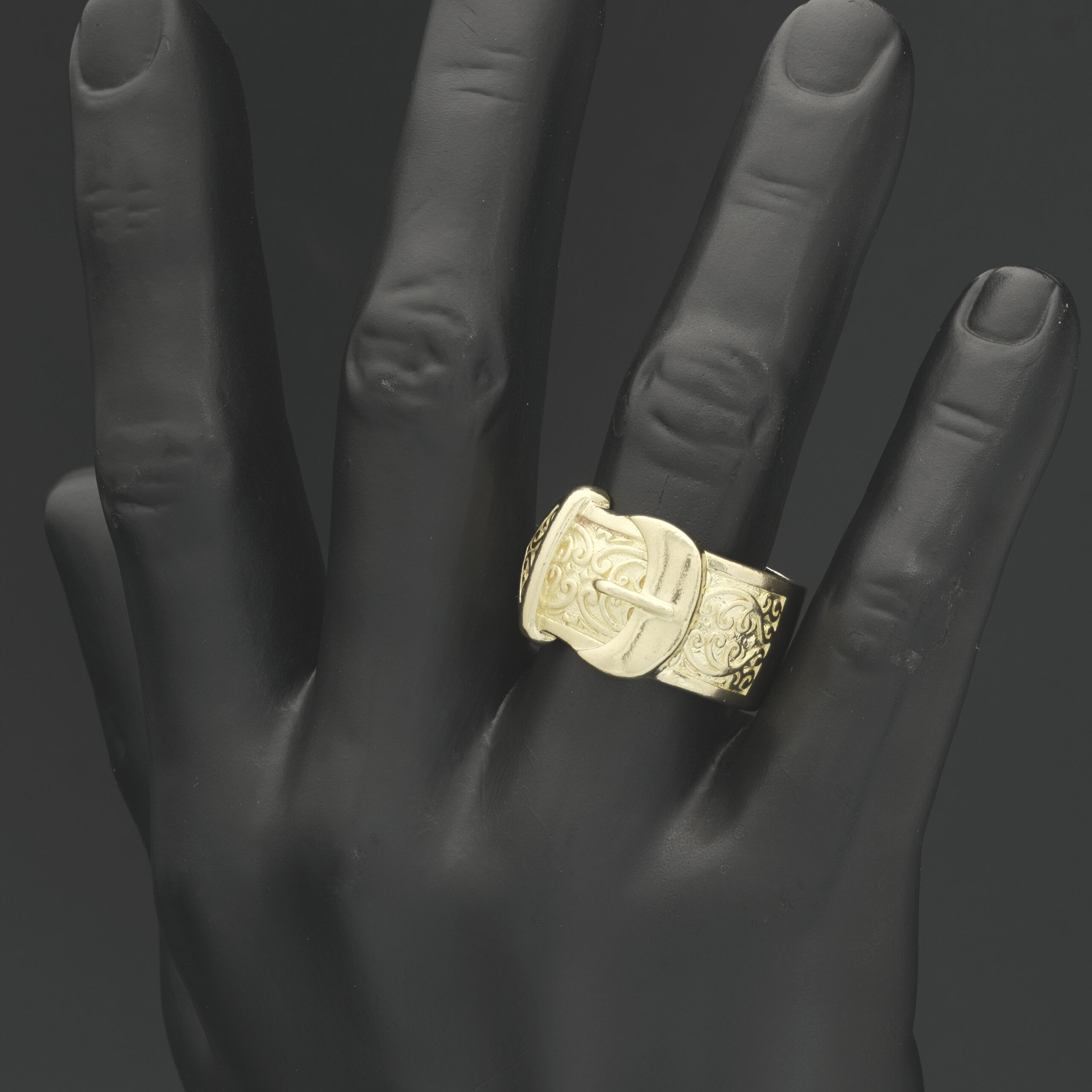 A stylish, pre-owned 9ct yellow gold buckle ring. This timeless buckle ring is a ring that goes with all outfits. Made from solid 9ct yellow gold, this ring has strength for everyday wear. Featuring a single plain buckle and a patterned band this ring is a classic look.