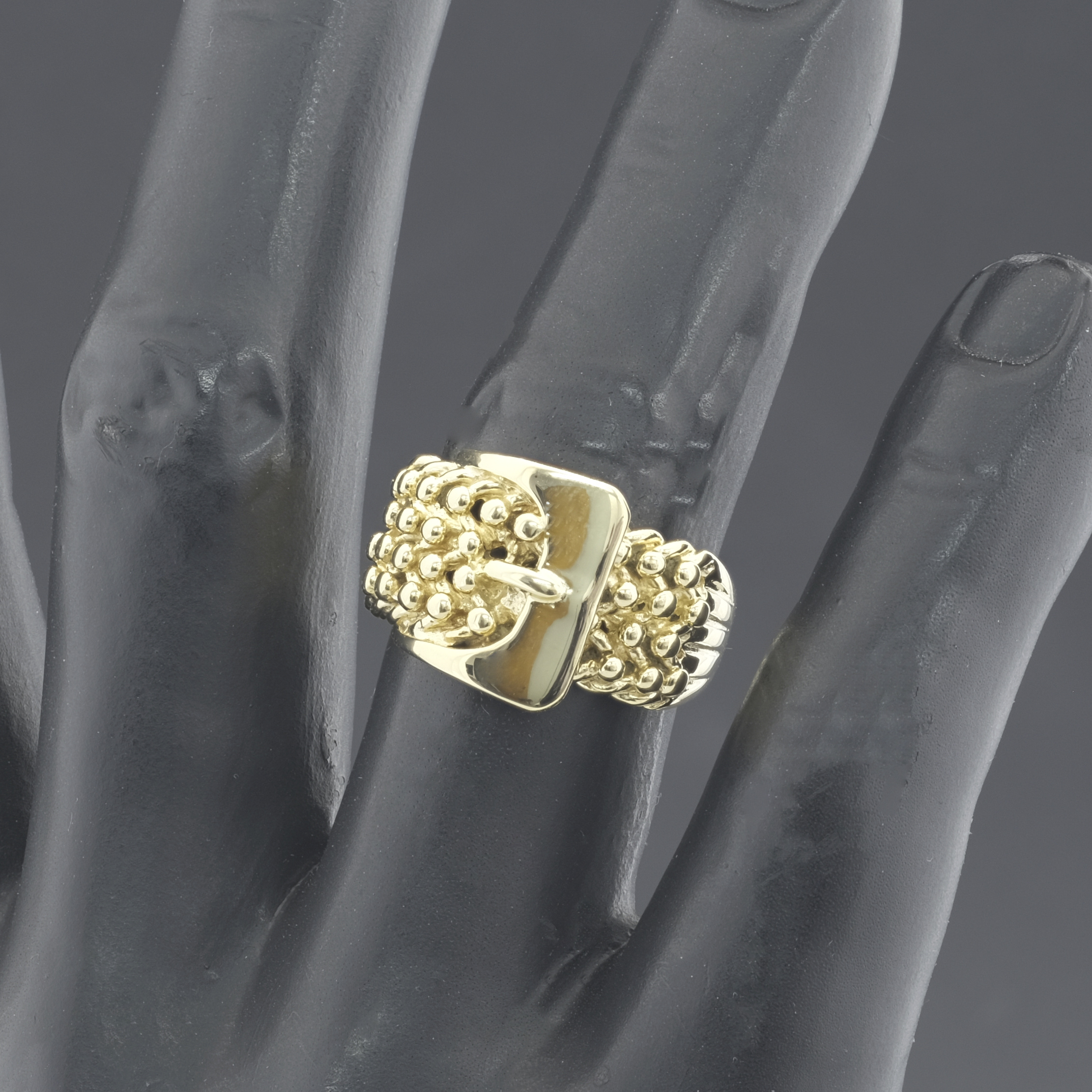 A stylish, pre-owned 9ct yellow gold buckle ring. This timeless buckle ring is a ring that goes with all outfits. Made from solid 9ct yellow gold, this ring has strength for everyday wear. Featuring a patterned band this ring is a classic look.