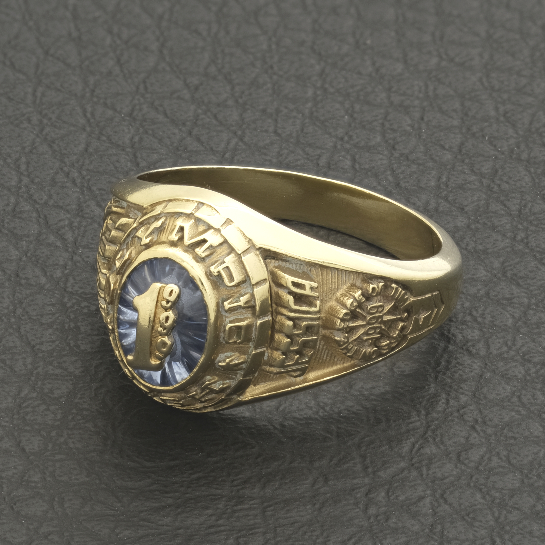 A pre-owned 10ct yellow gold replica of a traditional American design that is usually given to students graduating college or university. Engraved “Olympic High” around an blue gemstone and number 1.