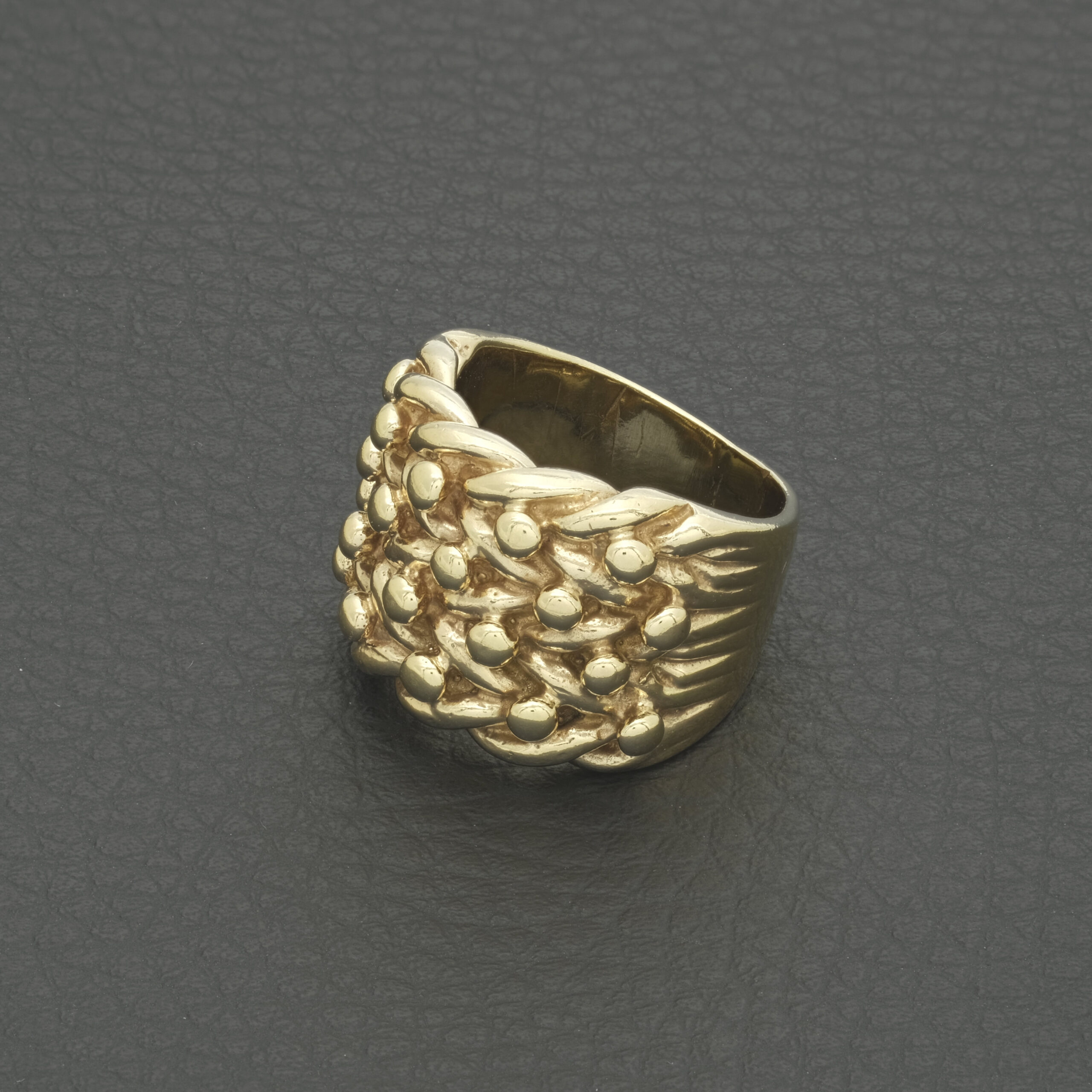 A pre-owned, 9ct yellow gold solid keeper ring features four rows and a rope on each edge. Being a classic design you can wear this keeper for any occasion. This ring weighs 17.8g.