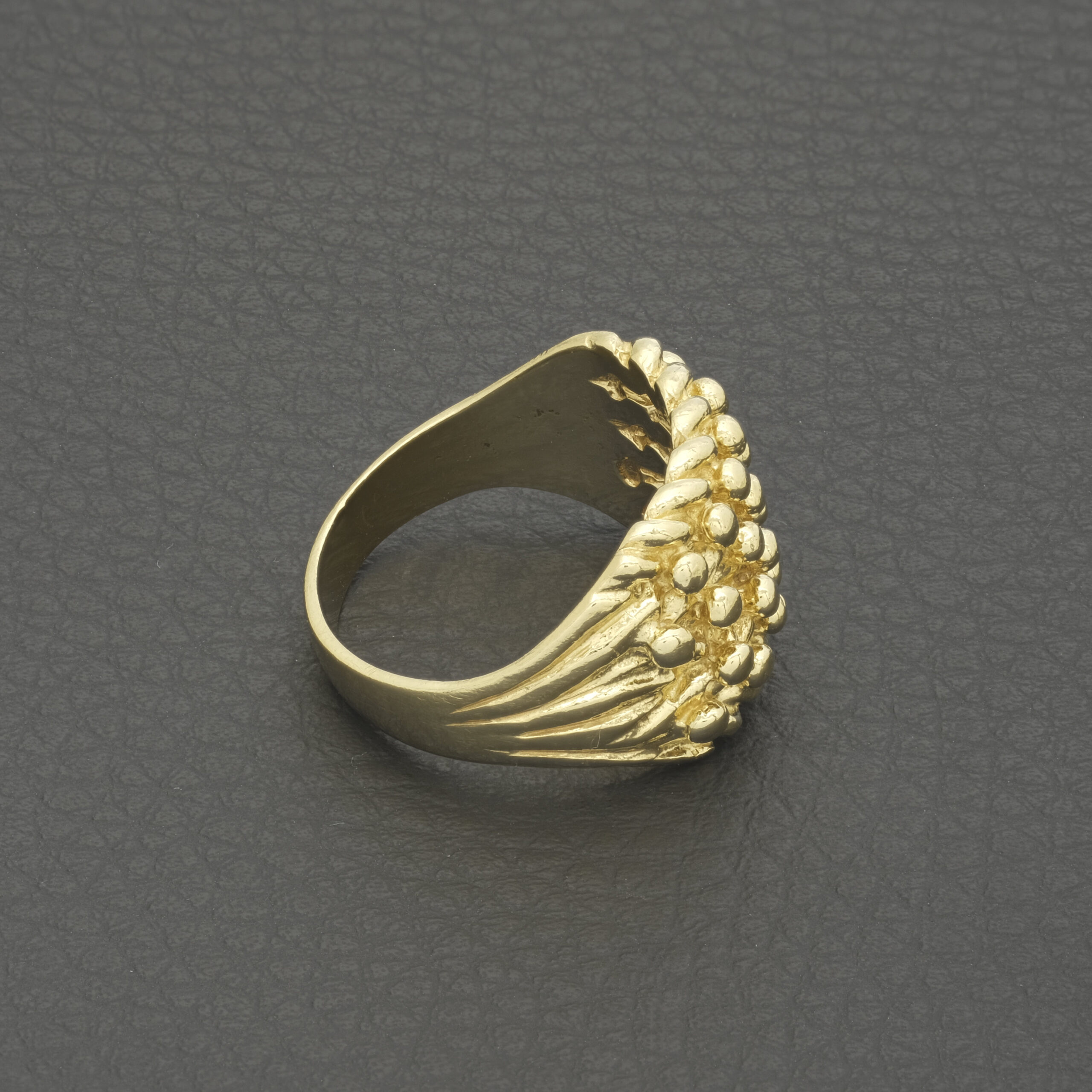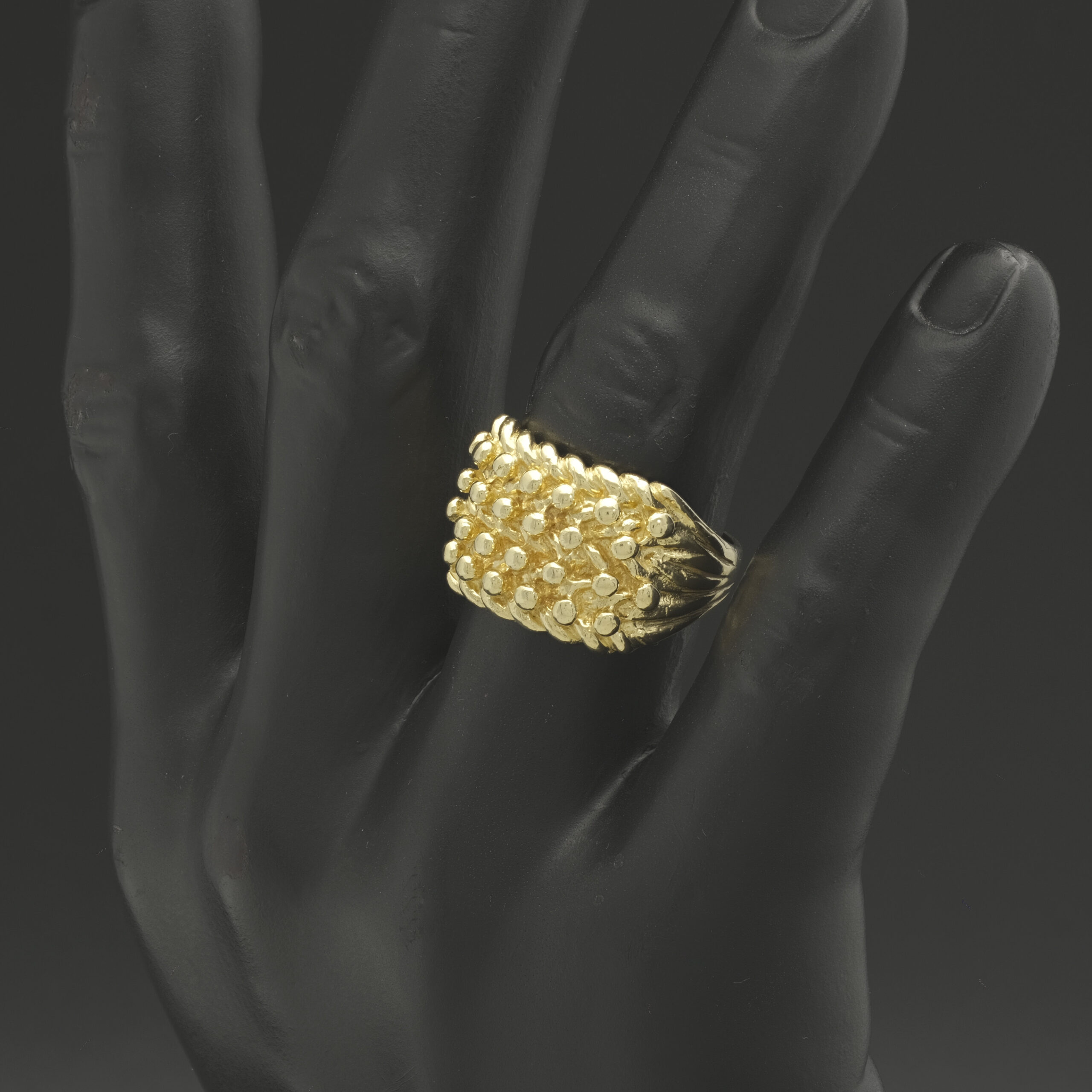 A pre-owned, 9ct yellow gold solid keeper ring features four rows and a rope on each edge. Being a classic design you can wear this keeper for any occasion. This ring weighs 12.1g.