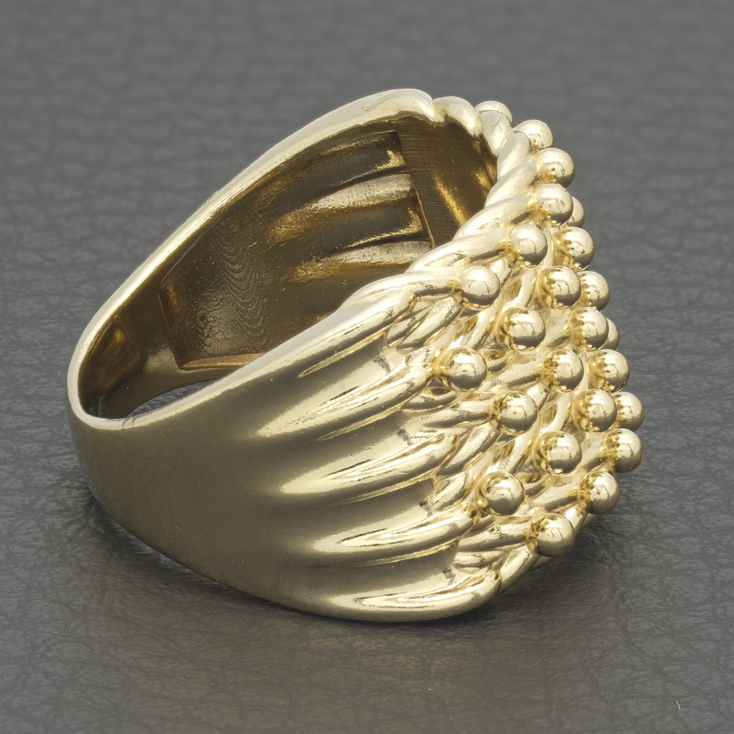 A pre-owned, 9ct yellow gold solid keeper ring features five rows and a rope on each edge. Being a classic design you can wear this keeper for any occasion. This ring weighs 17.2g.