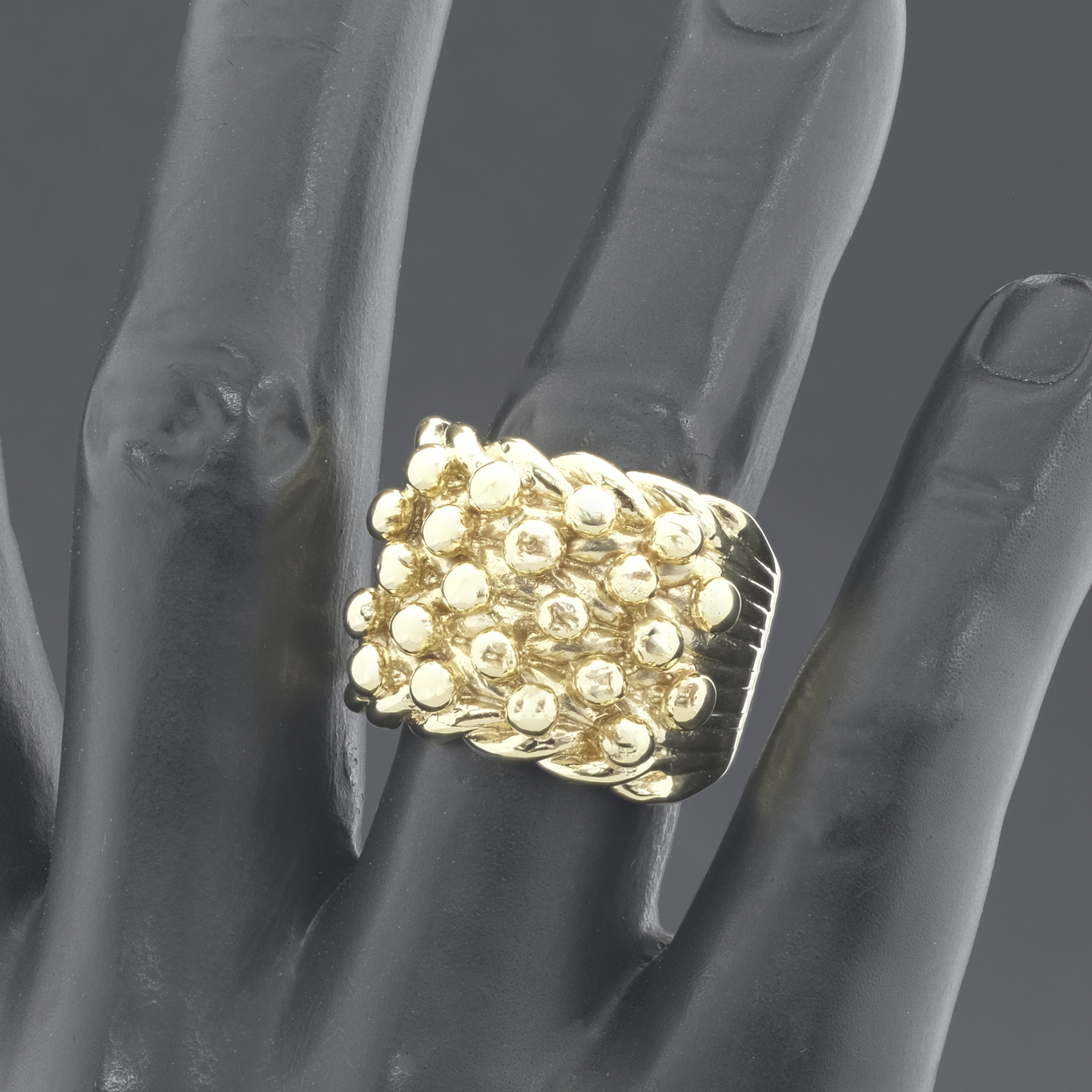 A pre-owned, 9ct yellow gold solid keeper ring features four rows and a rope on each edge. Being a classic design you can wear this keeper for any occasion. This ring weighs 31.8g.