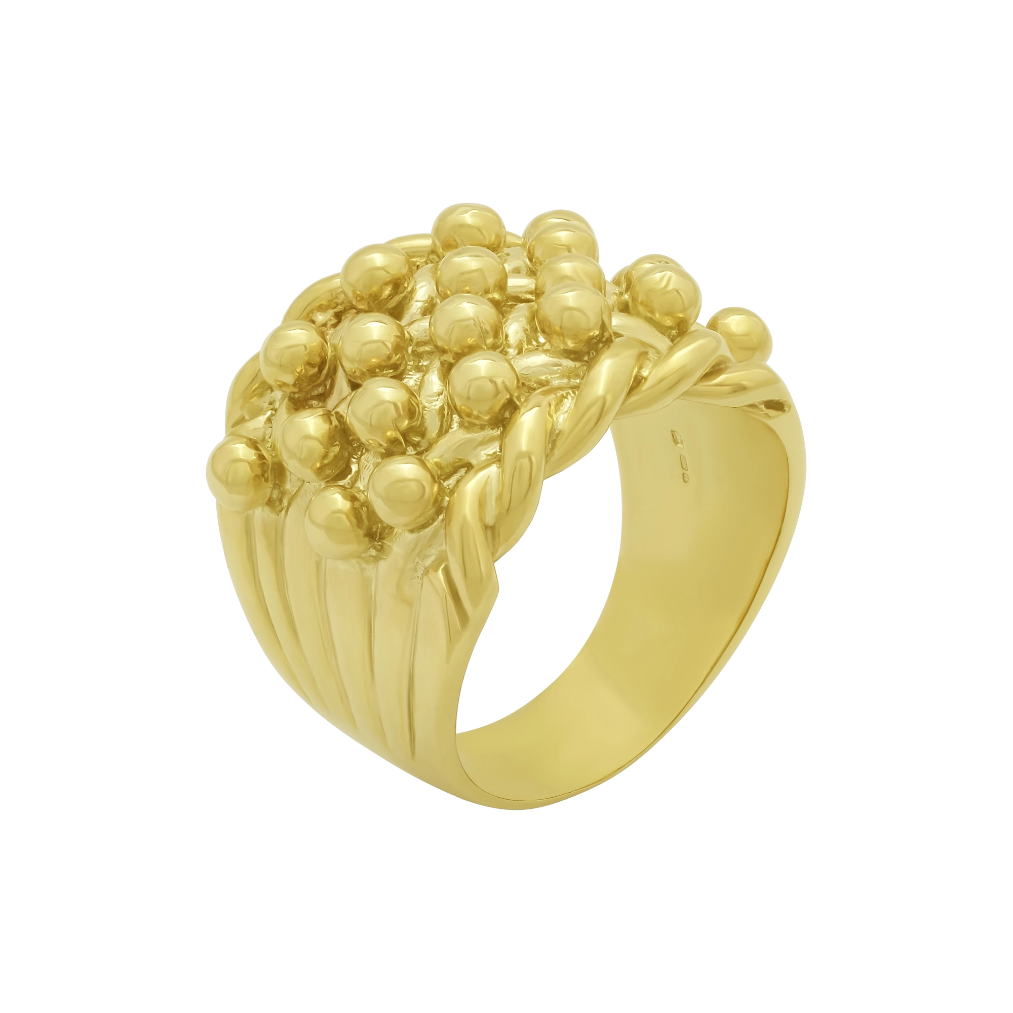 A pre-owned, 9ct yellow gold solid keeper ring features four rows and a rope on each edge. Being a classic design you can wear this keeper for any occasion. This ring weighs 37g.