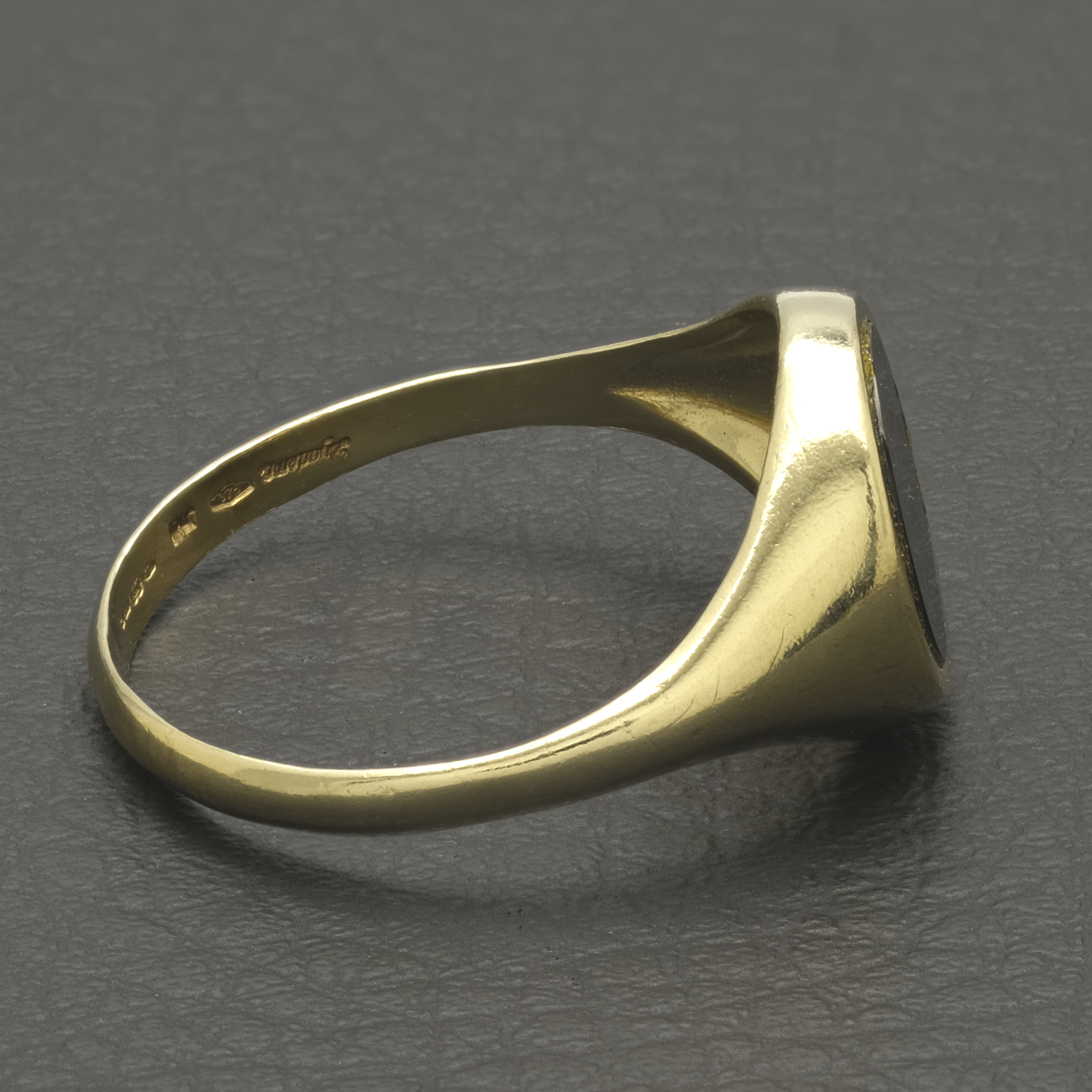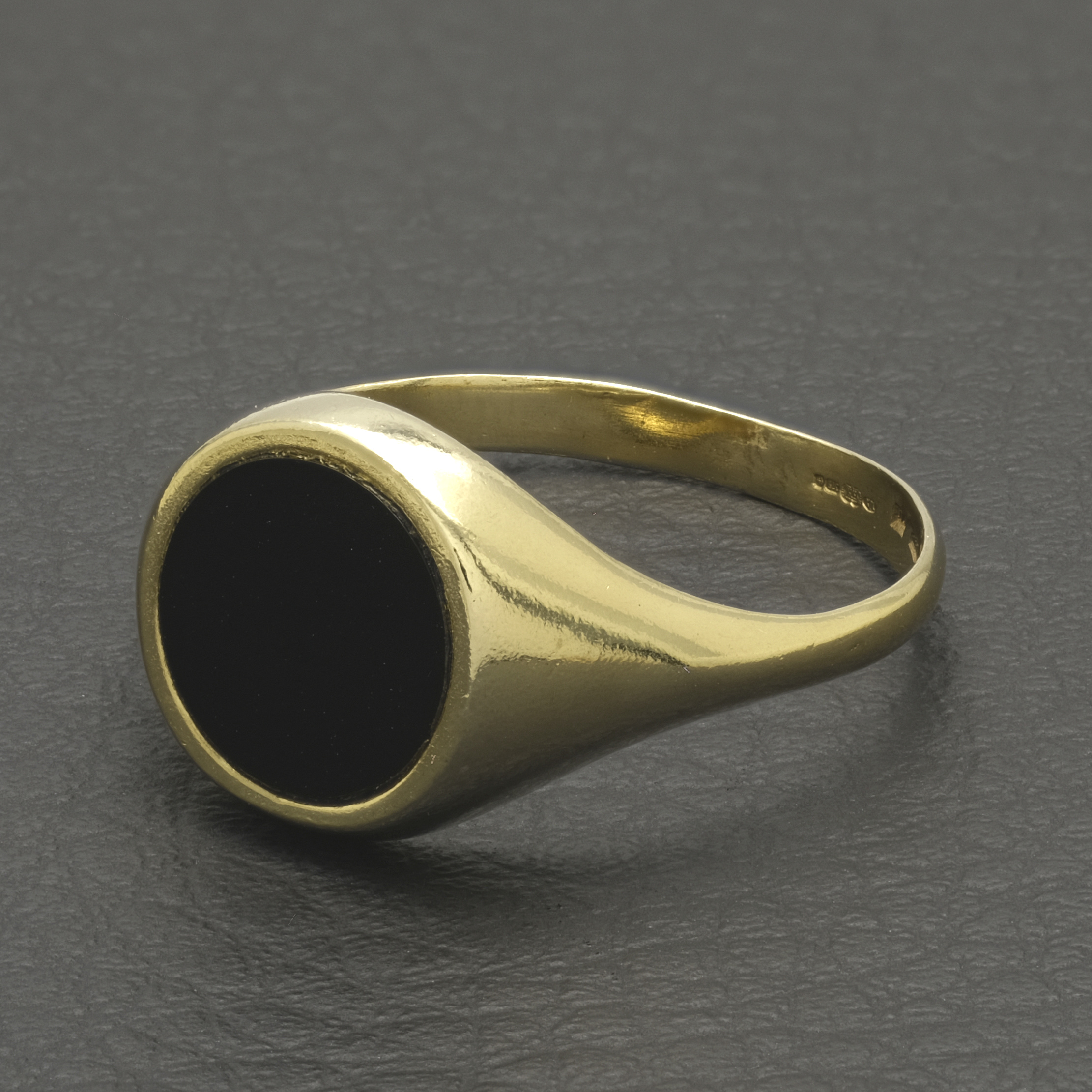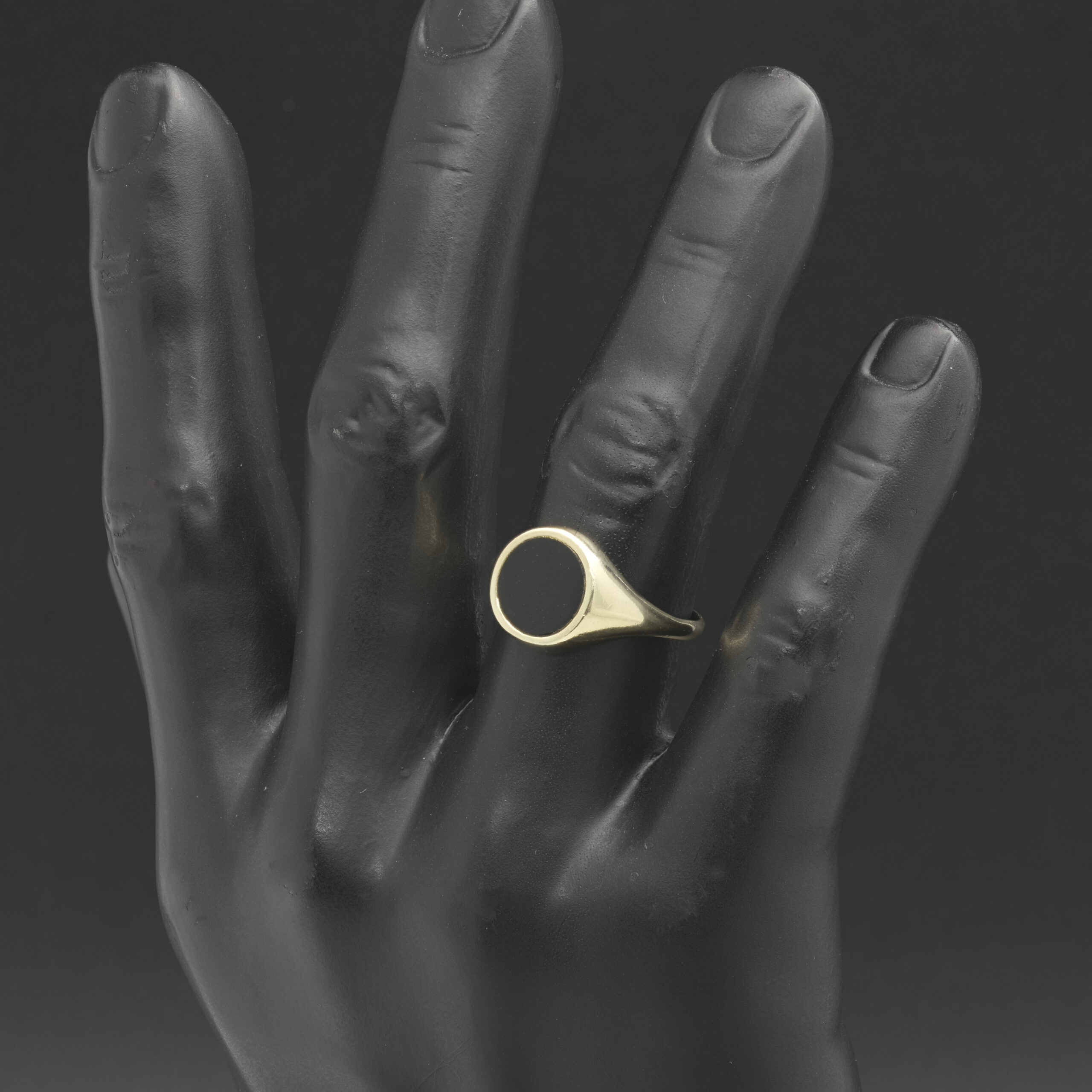 An attractive pre-owned black onyx 9ct yellow gold ring. Set with a dark black onyx in the center and made from 9ct yellow gold with a plain gold band.