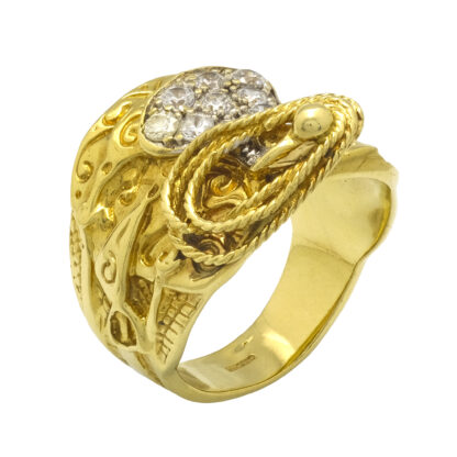 This pre owned ring is made from solid 9ct yellow gold with the saddle’s seating decorated in cubic zirconia gemstones for that extra bling, this saddle ring is durable for everyday or occasional wear. Carefully polished and highly detailed with buckles and sacks this saddle ring is decorated all around the band making this ring really stand out.