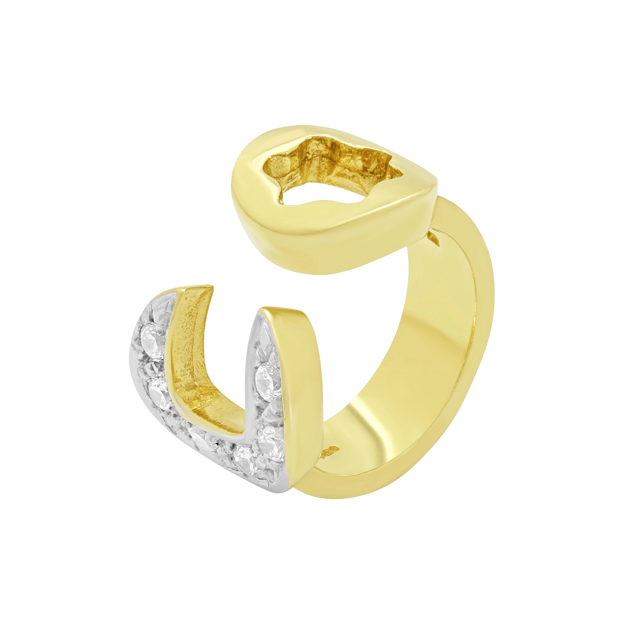 A pre-owned 9ct yellow gold gemstone spanner ring, consisting of six cubic zirconia gemstones for that extra bling! With a unique pattern going all the way around the ring.
