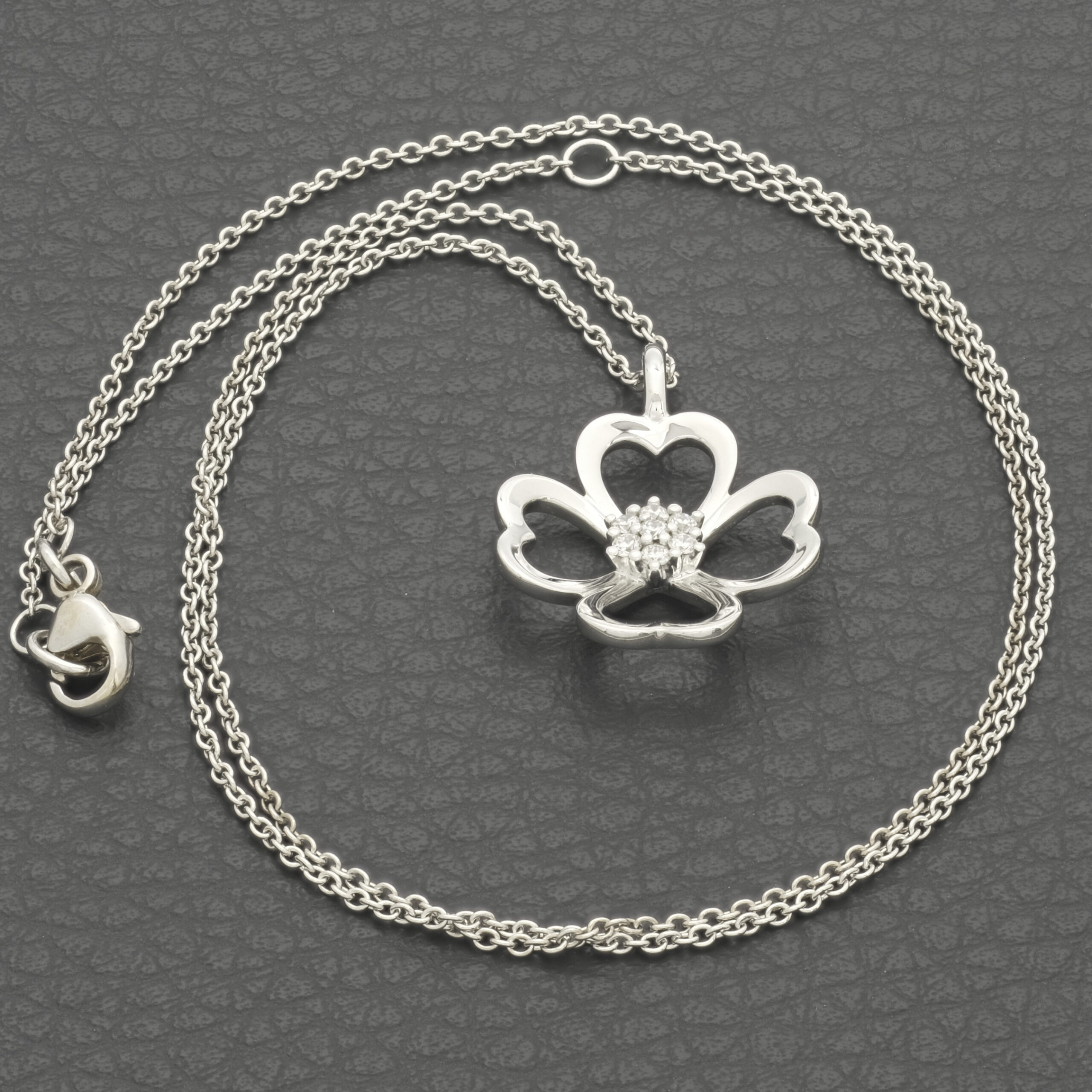 Delicate and timeless, this pre-owned white gold diamond flower necklace is a true masterpiece of elegance. Crafted from 18ct white gold, the pendant features a beautifully intricate floral design, adorned with sparkling diamonds that catch the light from every angle. The centre of the flower is meticulously set with shimmering stones, creating a dazzling centrepiece that exudes sophistication. The diamonds have a total carat weight of 0.10ct, with a colour of H-I and a clarity of SI1-SI2. This necklace is perfect for adding a touch of luxury to any outfit, whether for a special occasion or everyday wear. A symbol of grace and beauty, it makes a stunning gift for someone special or a cherished addition to your own jewellery collection.