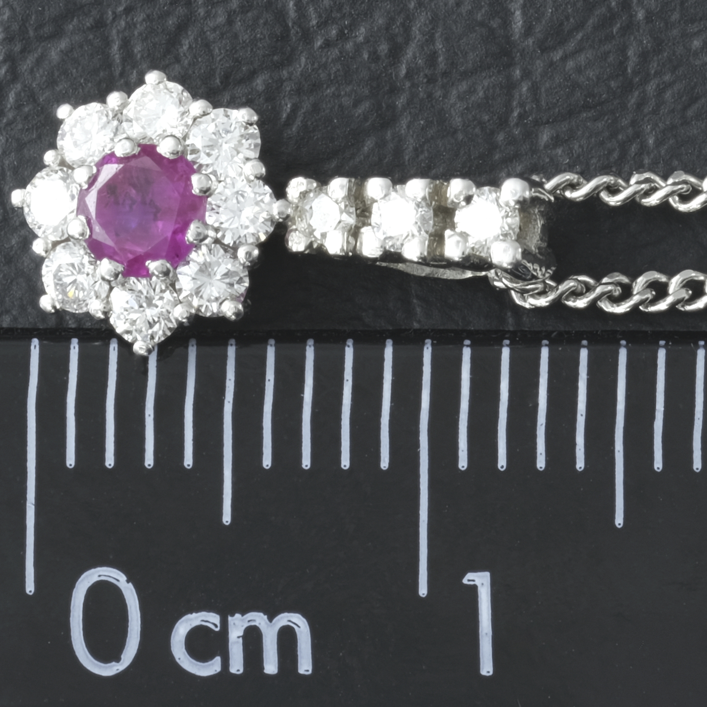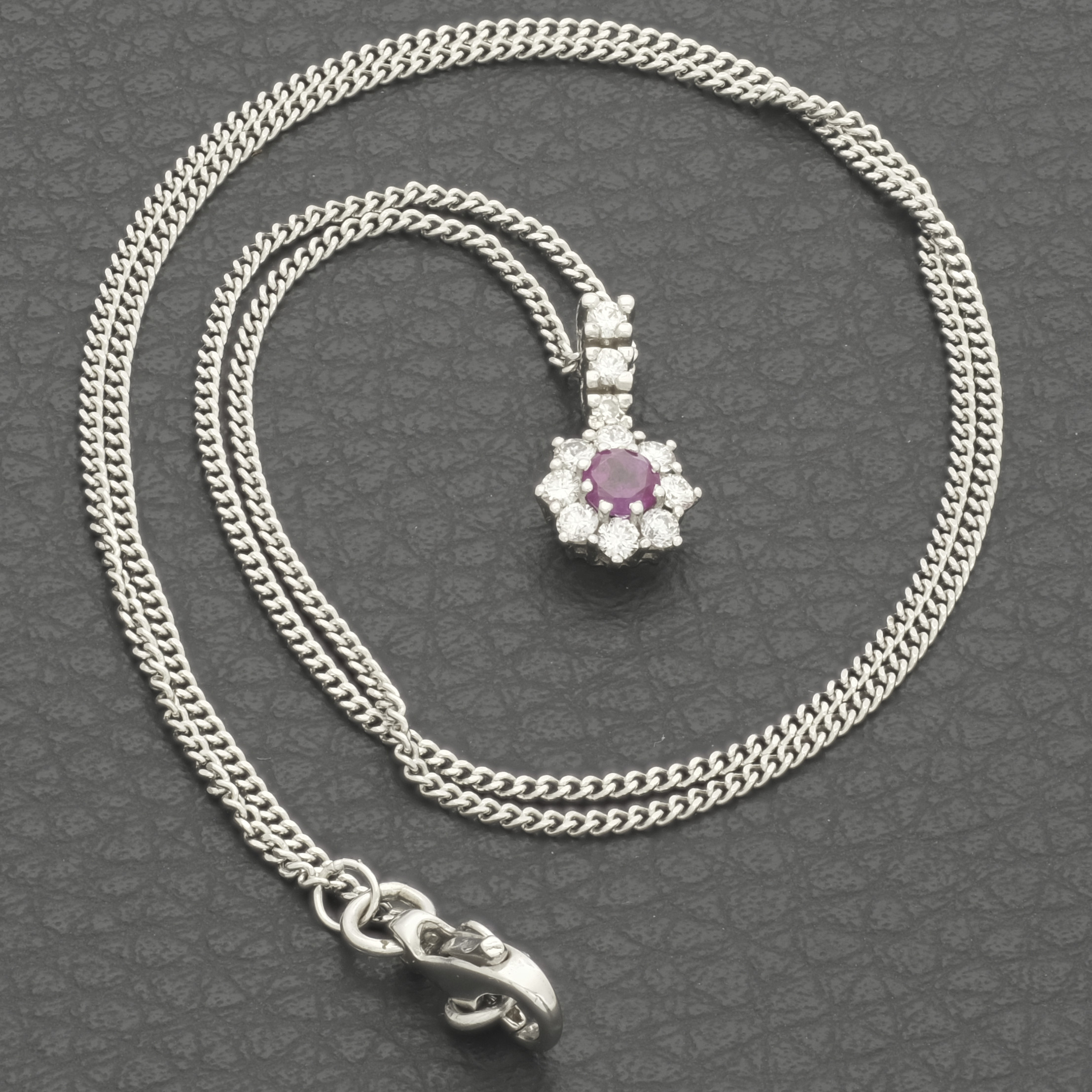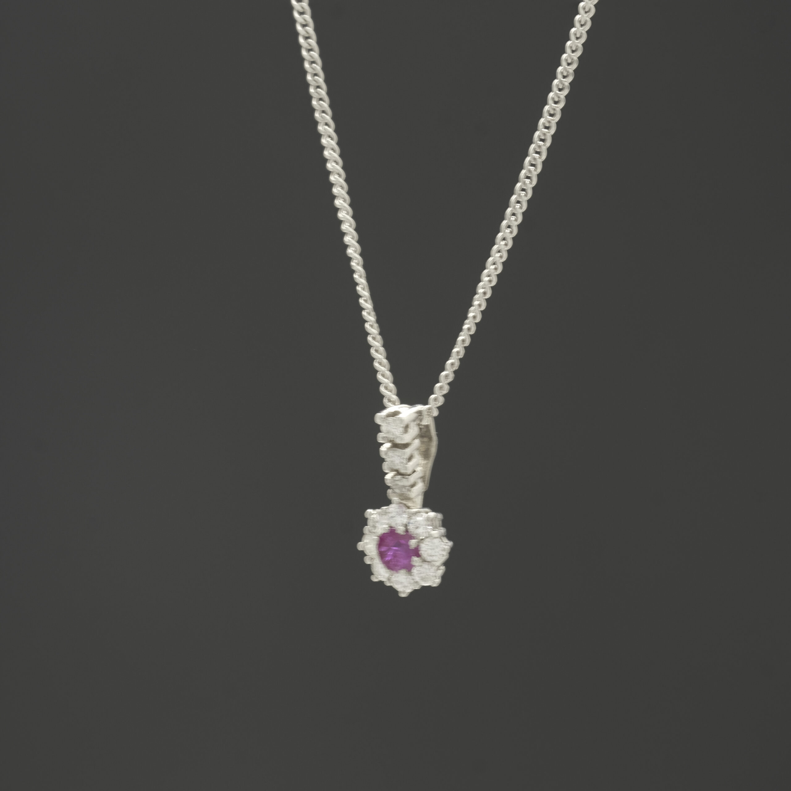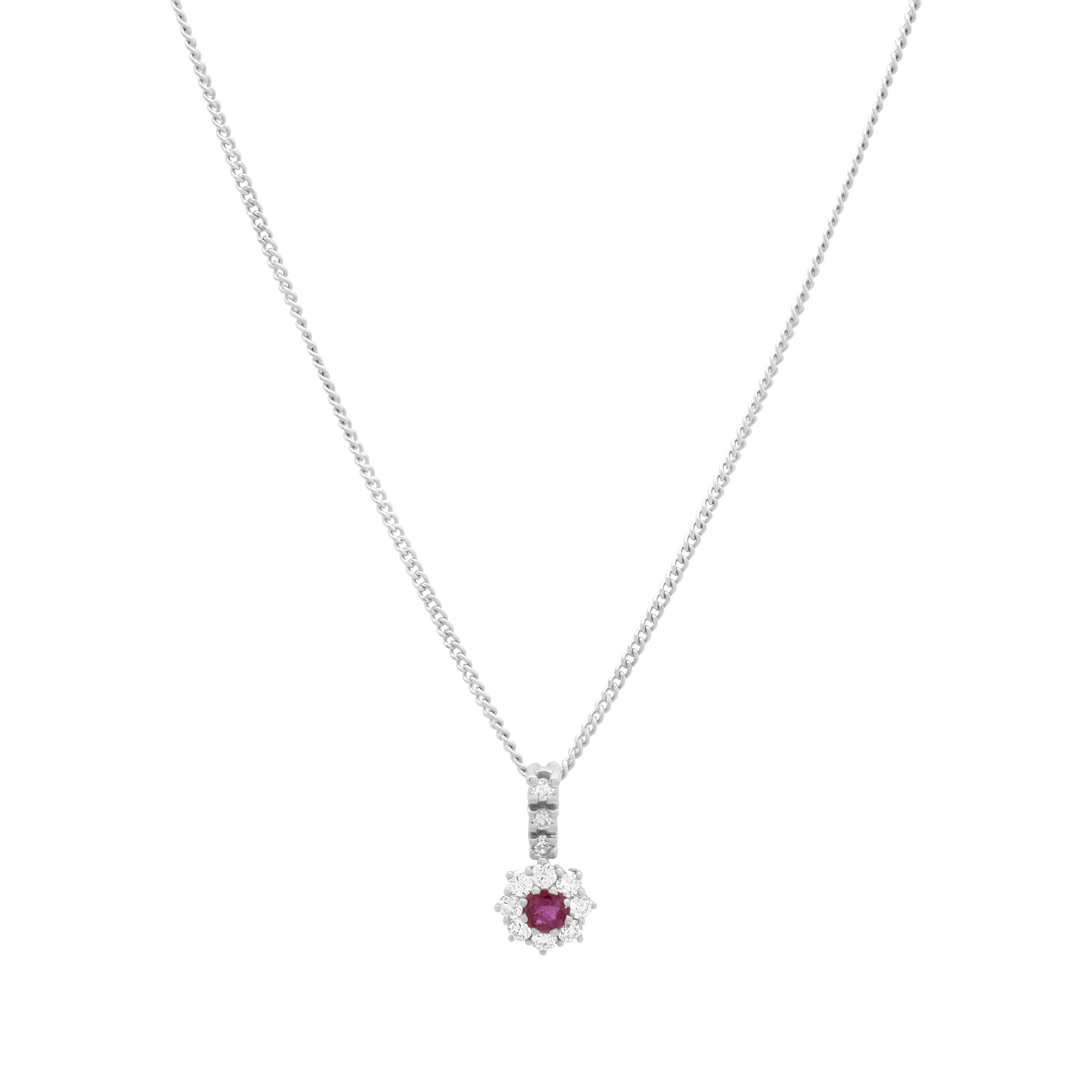 A beautiful pre-owned 18ct white gold diamond and ruby necklace. The pendant features a stunning ruby at its centre, weighing 0.10ct, surrounded by 8 small round-cut diamonds ,with a stunning diamond set bale all set in 18ct white gold, with a total diamond weight of 0.22ct. This pendant hangs from an 16″ 18ct white gold curb chain and fastens with a lobster claw clasp. This necklace is perfect for any occasion and is sure to catch the eye.