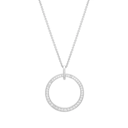 A stunning pre-owned 18ct white gold diamond circle necklace. This necklace features gorgeous diamonds totalling 0.58ct, with a colour of G-H and clarity VS1-VS2. The diamond circle pendant hangs from an 18ct white gold chain with a length of 18″ but also has the option to wear at 16”. This necklace is perfect for everyday wear.