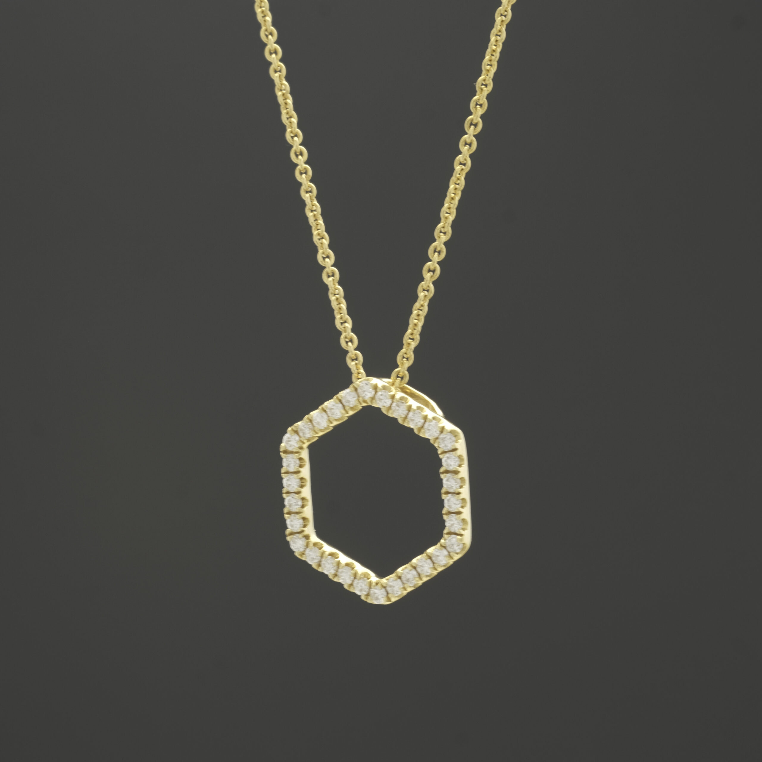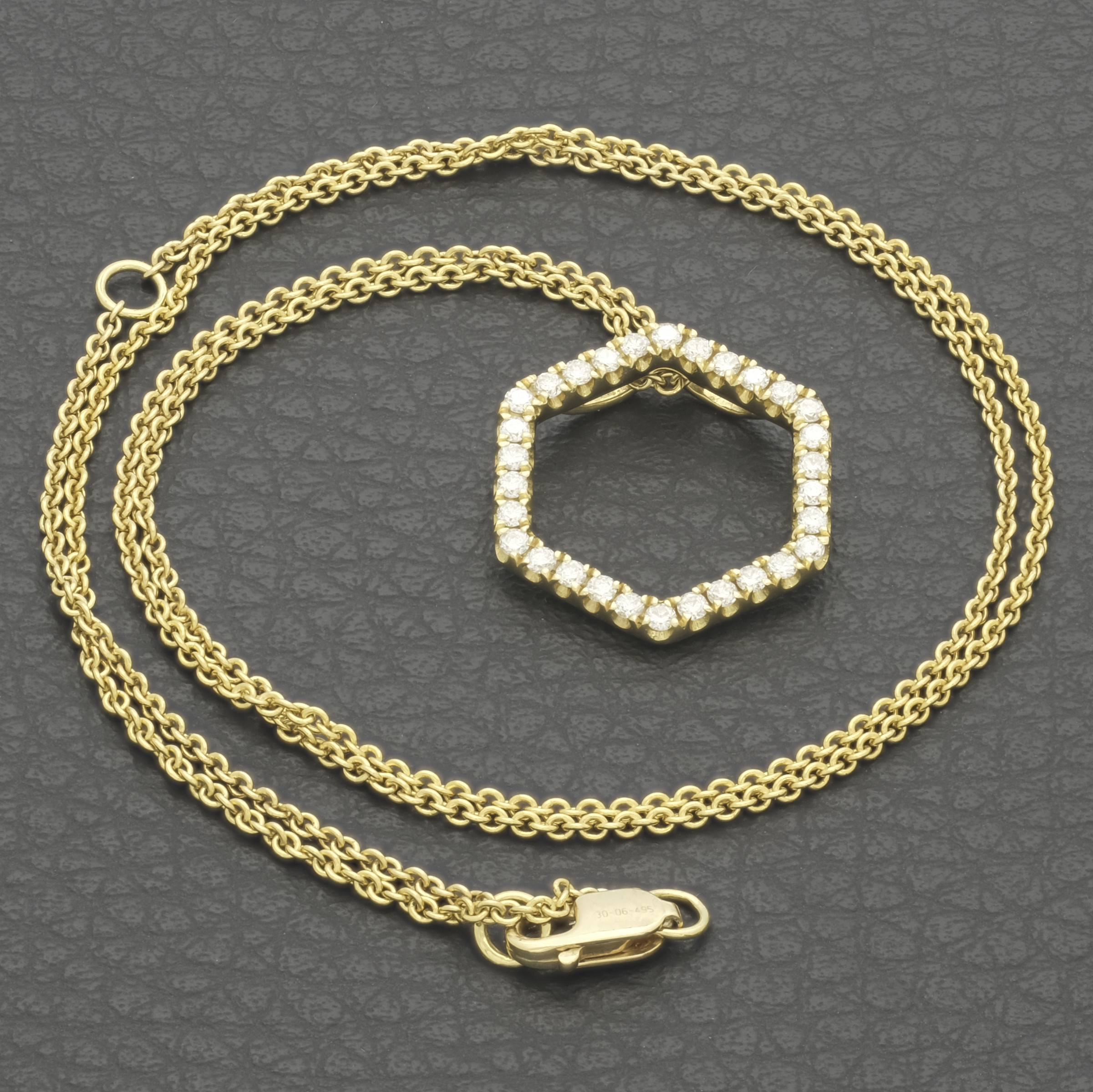 A stunning piece of jewellery that exudes elegance and modern sophistication, this pre owned gold diamond hexagon necklace is a true statement accessory. The pendant features a sleek hexagonal design, crafted from 18ct yellow gold, symbolizing strength and balance. At its centre, brilliant-cut diamonds sparkles with unmatched brilliance, adding a touch of timeless luxury. These diamonds have a total carat weight of 0.30ct, with a colour of G-H and a clarity of VS1-VS2. Suspended from a delicate yet durable gold chain, this necklace is perfect for elevating everyday outfits or adding a refined touch to evening wear. Its geometric charm and dazzling centrepiece make it a versatile and unforgettable addition to any jewellery collection.
